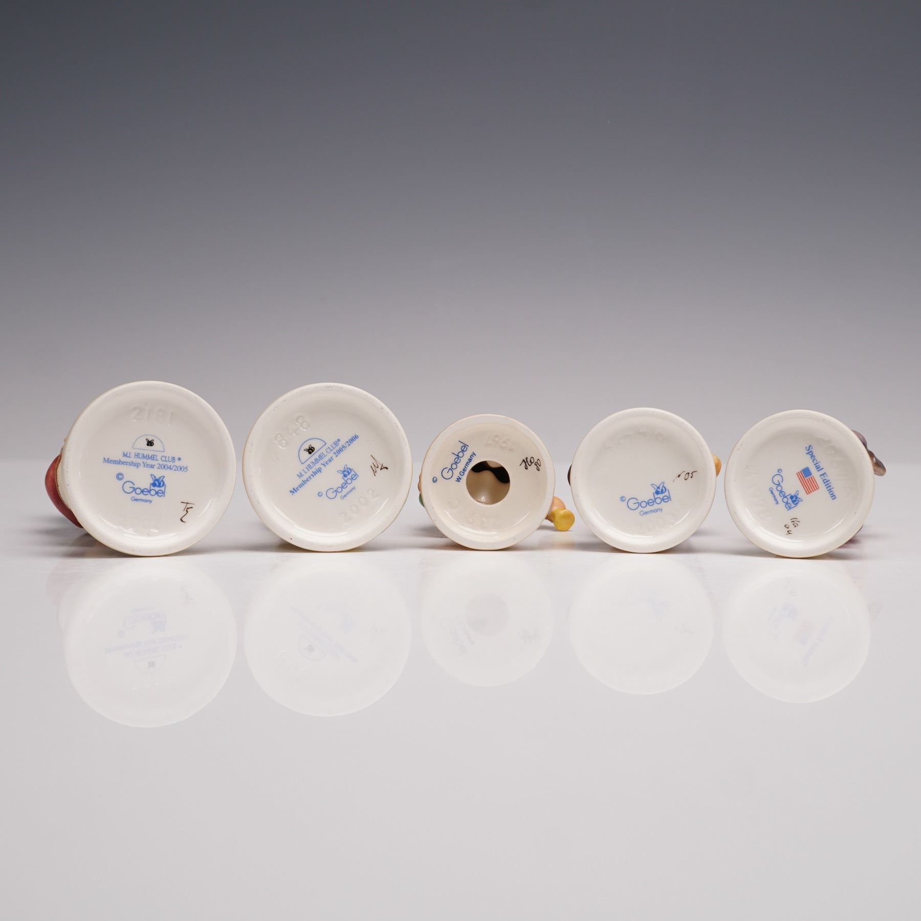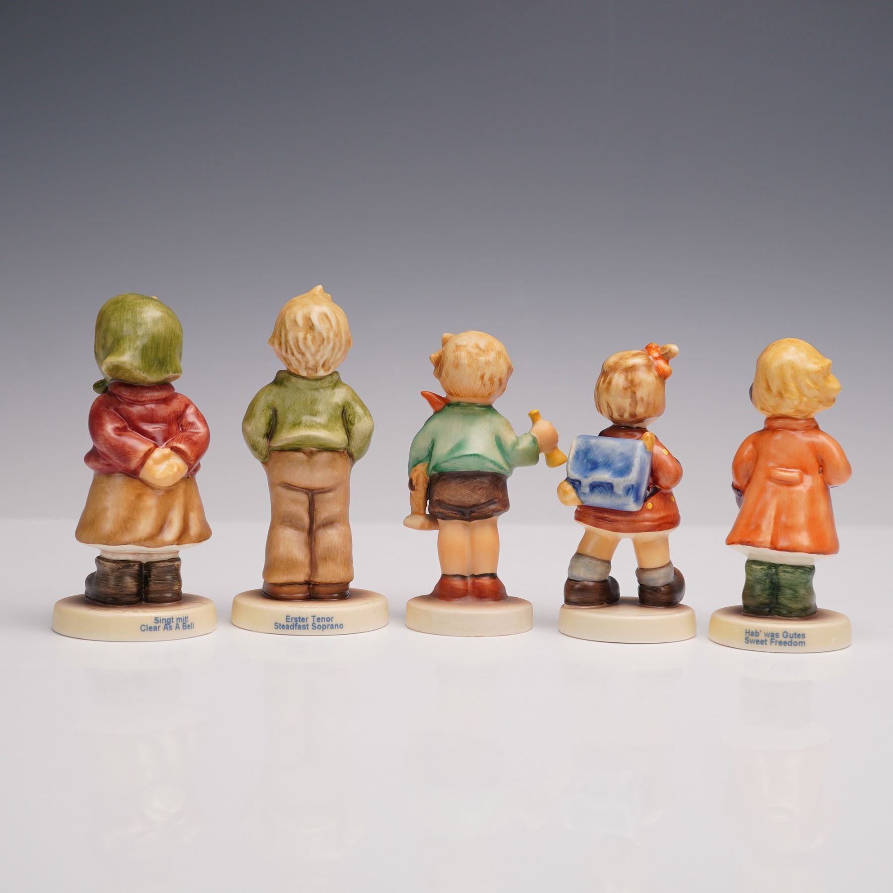A collection of five hand-painted porcelain figurines depicting charming childhood themes. Includes Clear as a Bell (2181) showing a young girl with hands behind her back, Steadfast Soprano (848) featuring a boy singing, Boy with Horse and a Horn (820) depicting a boy with a small toy horse and trumpet, The Kindergartner (467) showing a girl with a blue backpack, and Sweet Treats (2067/B) portraying a child with earmuffs and book. Each figure is marked on the base with Goebel back stamps and identifying numbers.