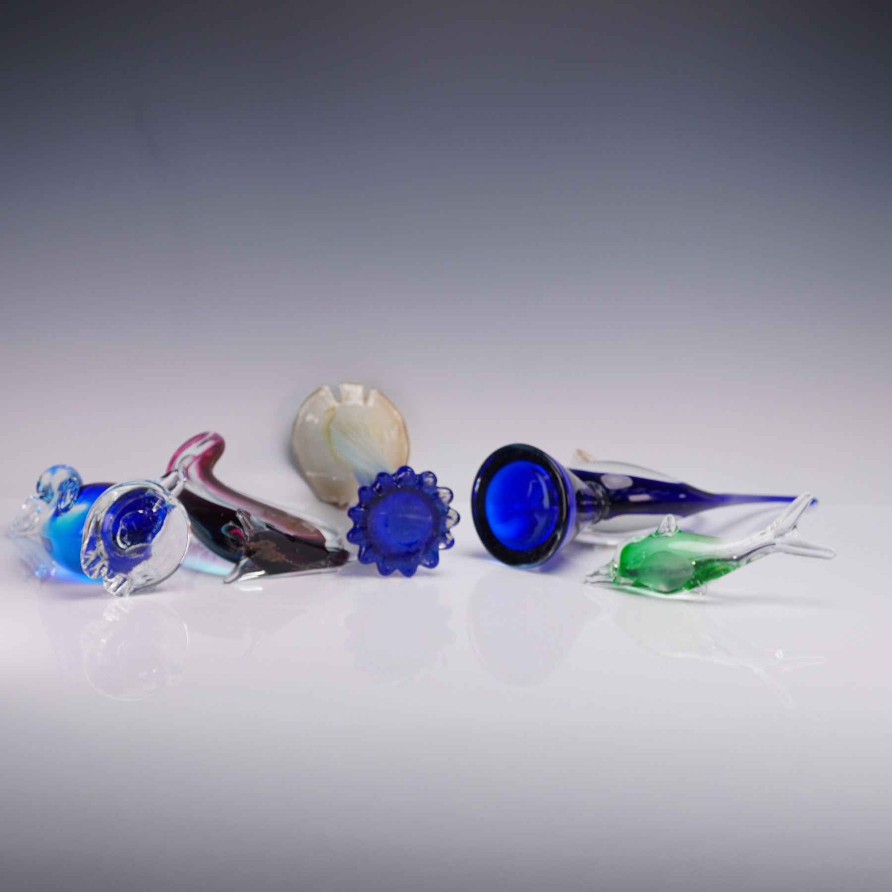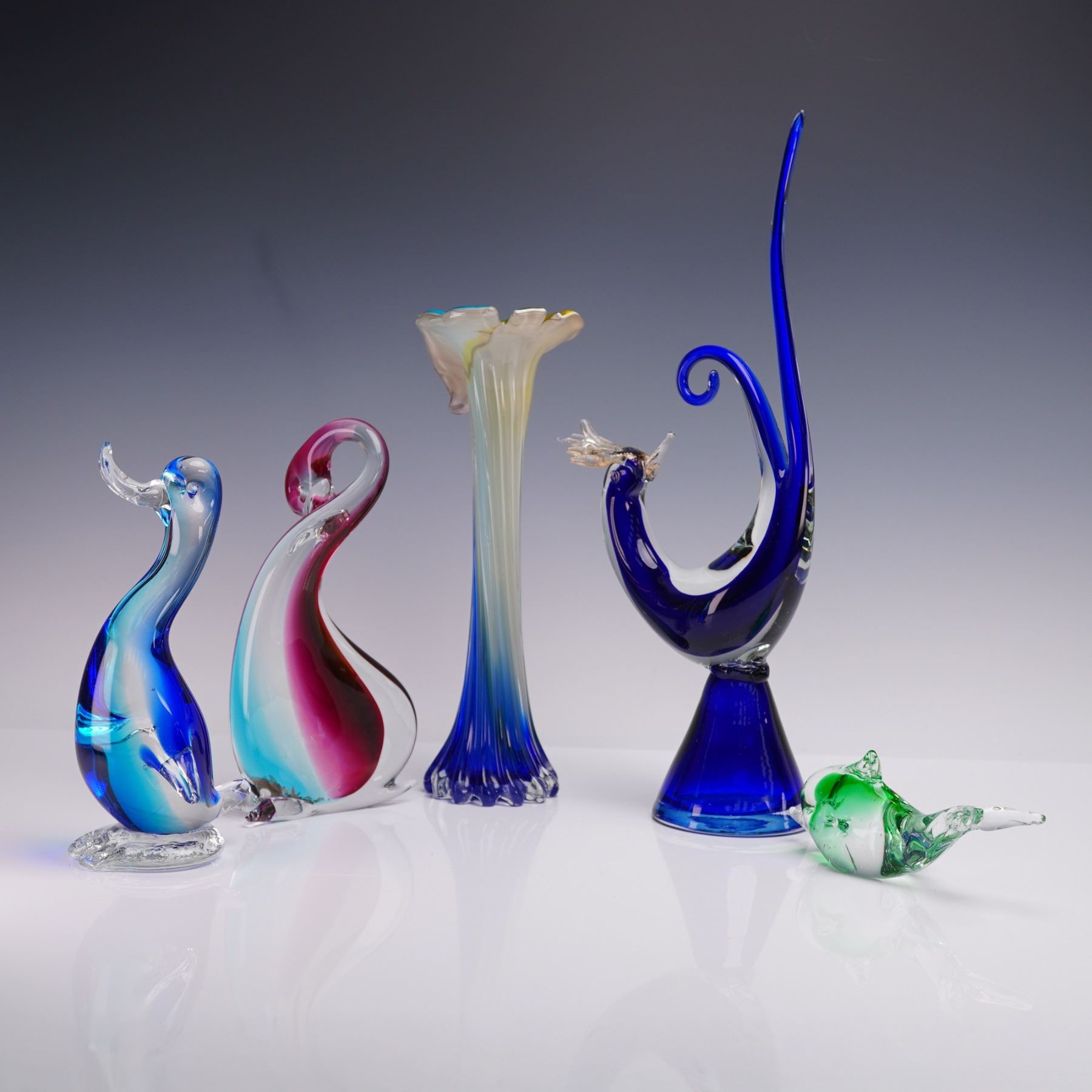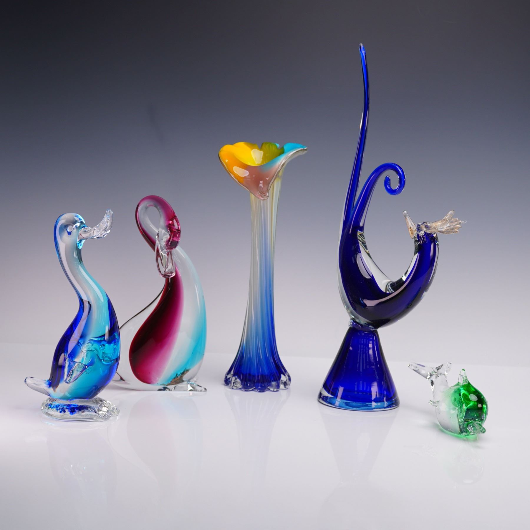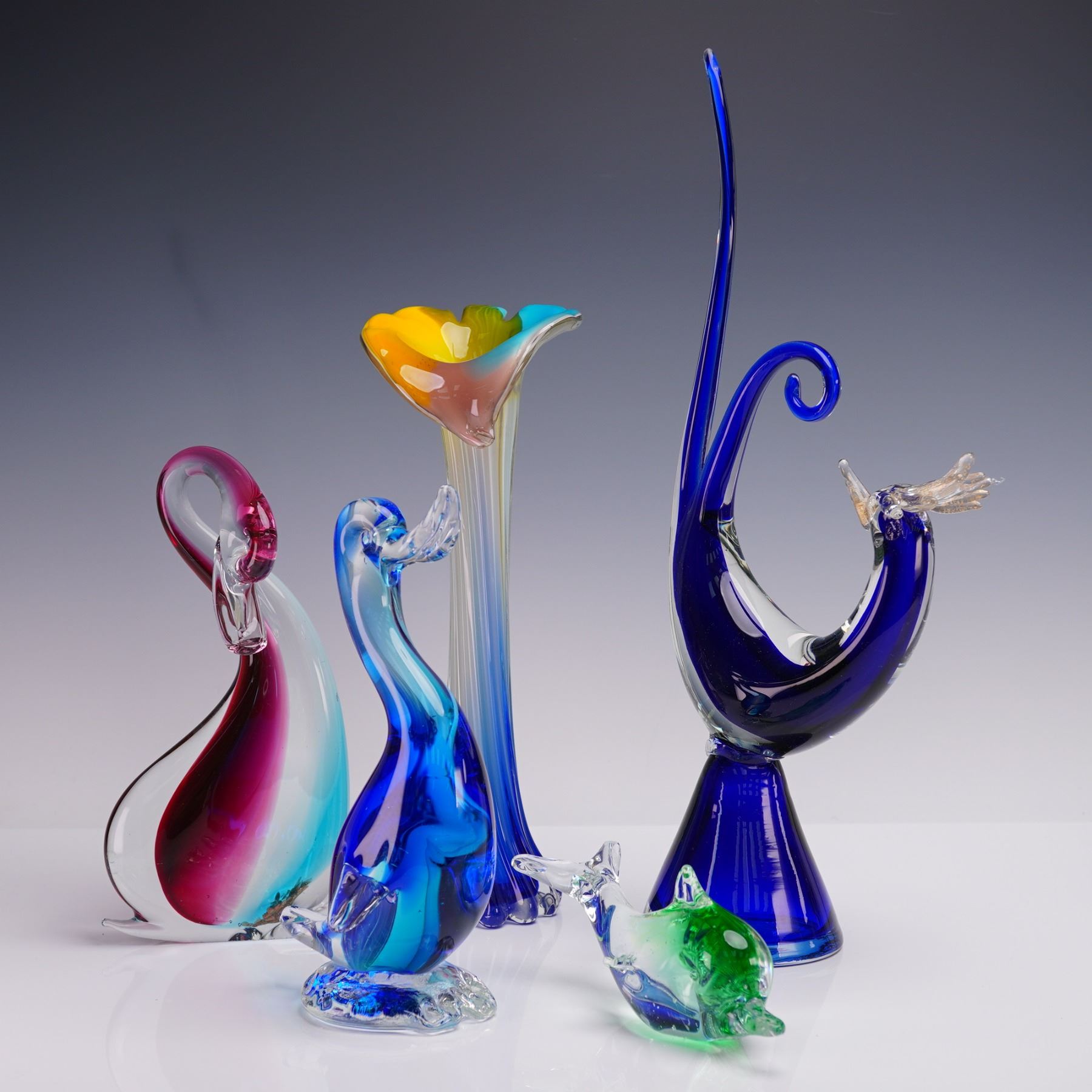 A vibrant collection of five modern art glass figures, including a cobalt blue abstract bird with frosted wings, a multicolor calla lily Jack in the Pulpit vase in shades of yellow, green, and rose, and three charming animal forms - a green and clear dolphin, a bright blue duck, and a deep pink-and-turquoise swan. Each piece is individually hand-blown with clear glass elements and rich internal coloration. A cheerful and decorative grouping perfect for display or gift giving.