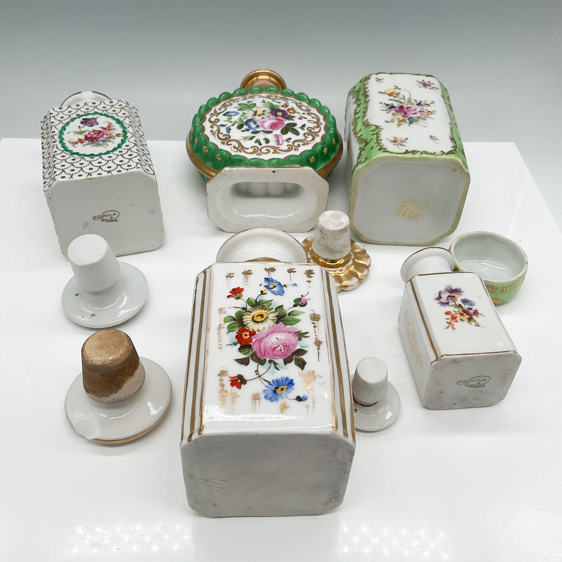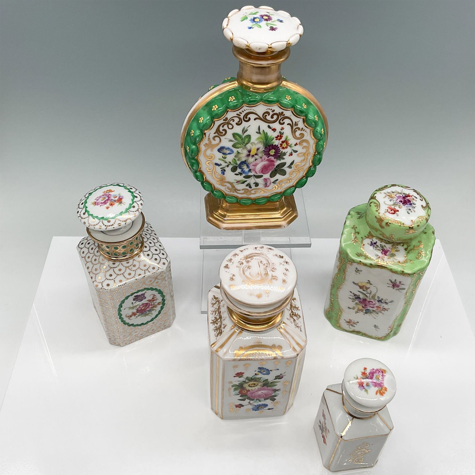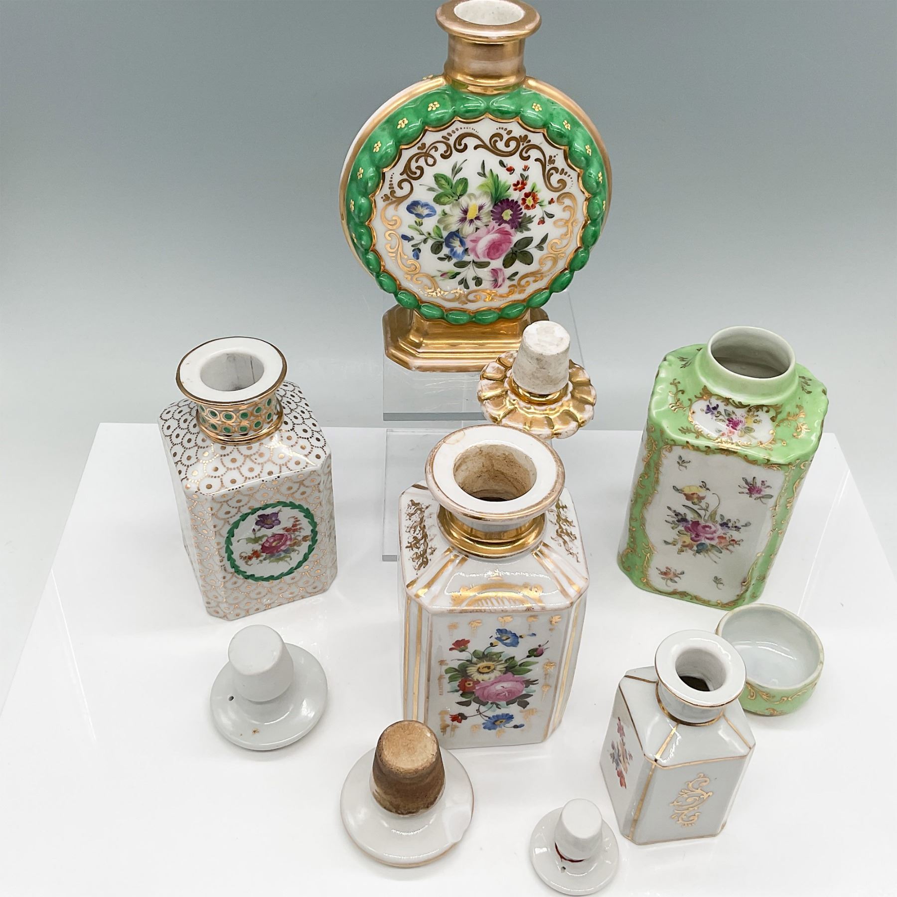 A remarkable collection of five antique hand-painted porcelain decanters and tea caddy's with stoppers ranging in size from 5" - 7.5"H, featuring exquisite floral motifs, gilt accents, and intricate detailing. Each decanter is unique in design, with ornate patterns and vibrant colors, likely of European origin, possibly French or German. The set includes square and round-shaped decanters, some with raised enamel embellishments and elaborate stopper designs. These elegant decanters would make a sophisticated addition to any collection or decorative display.