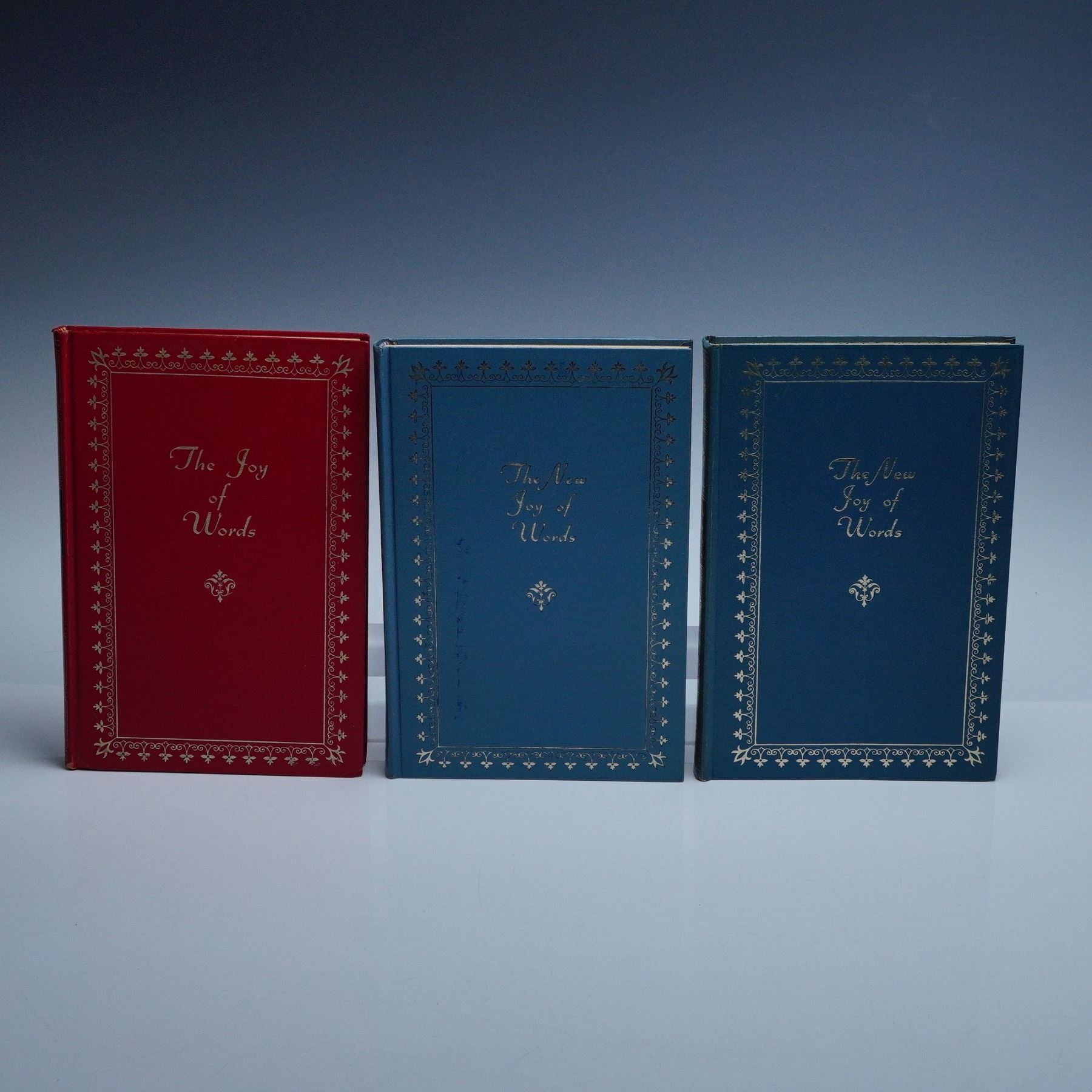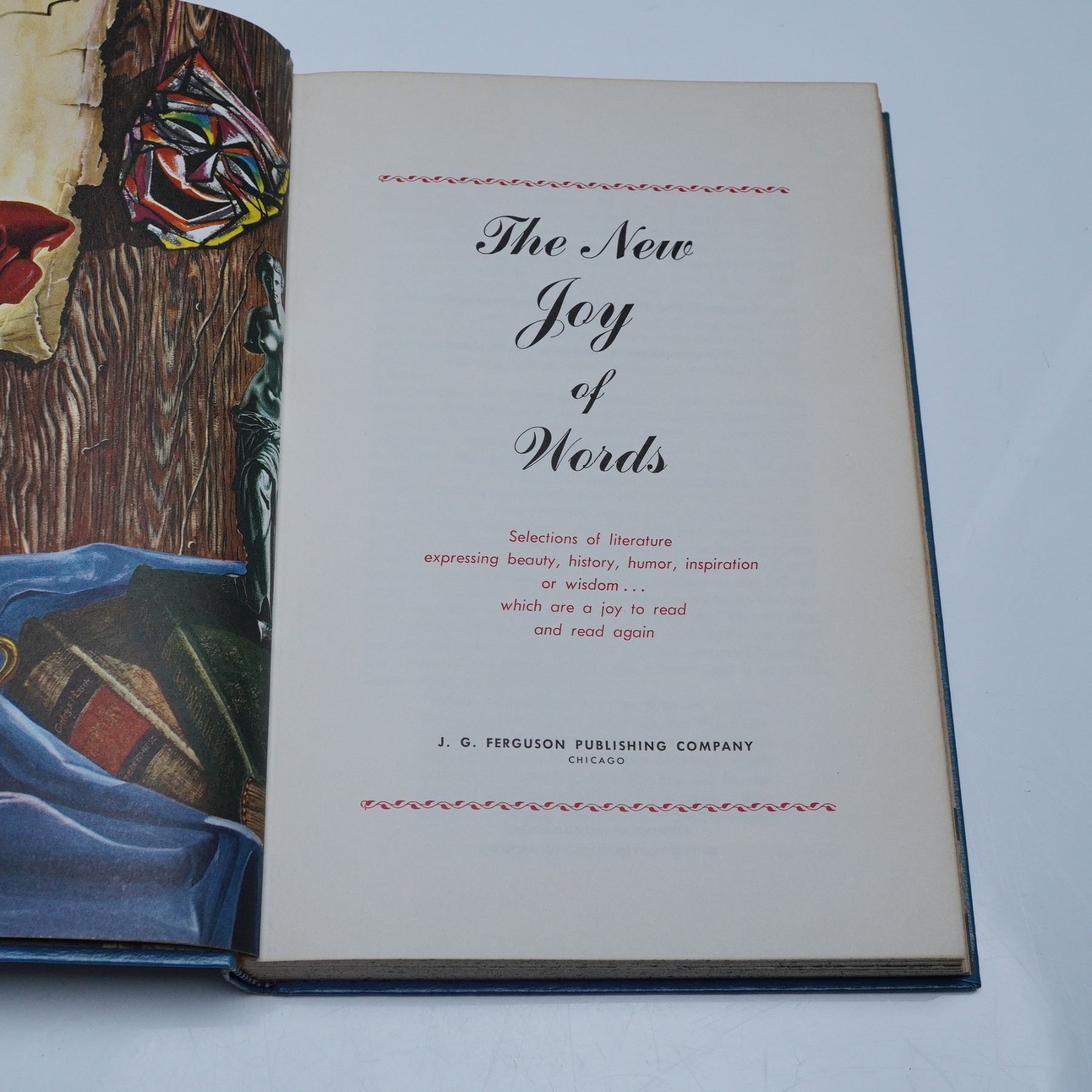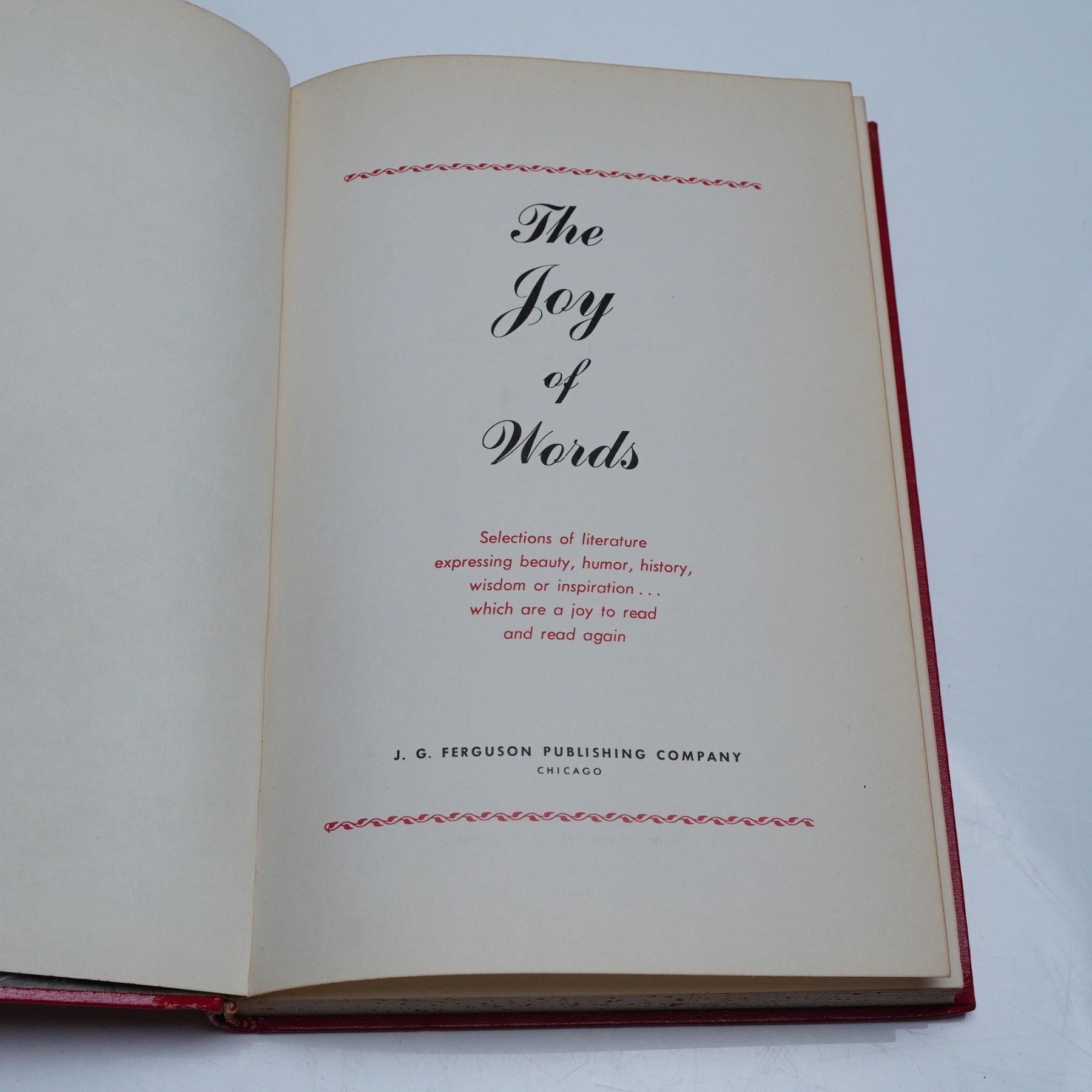 A visually striking five-piece set from the inspirational literary series published by J. G. Ferguson Publishing Company of Chicago. This lot includes The Joy of Words, two volumes of The New Joy of Words, Joy of Words III, and The Gift of Words, the latter edited by Thomas C. Jones. Each volume features selections of prose and poetry chosen to express beauty, humor, wisdom, history, or inspiration - "a joy to read and read again." Originally issued in the mid-20th century, likely in the 1950s - 1960s, these compilations were marketed as collectible gift books, often distributed by mail-order or book clubs such as Doubleday. Each book is bound in ornate decorative covers with metallic lettering and patterned endpapers, with minor wear visible on a few spines and corners. A charming midcentury anthology set for the casual reader or vintage collector.