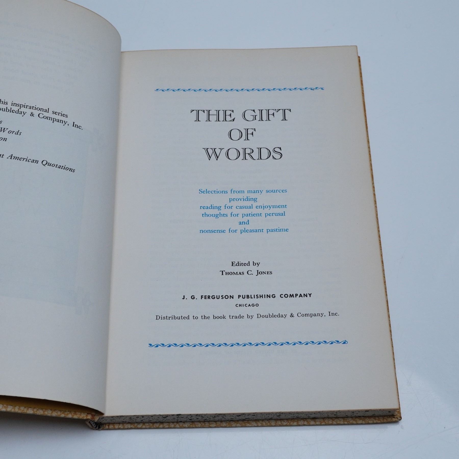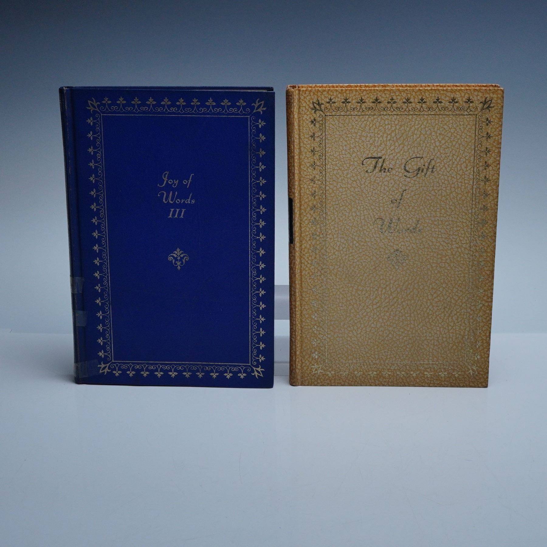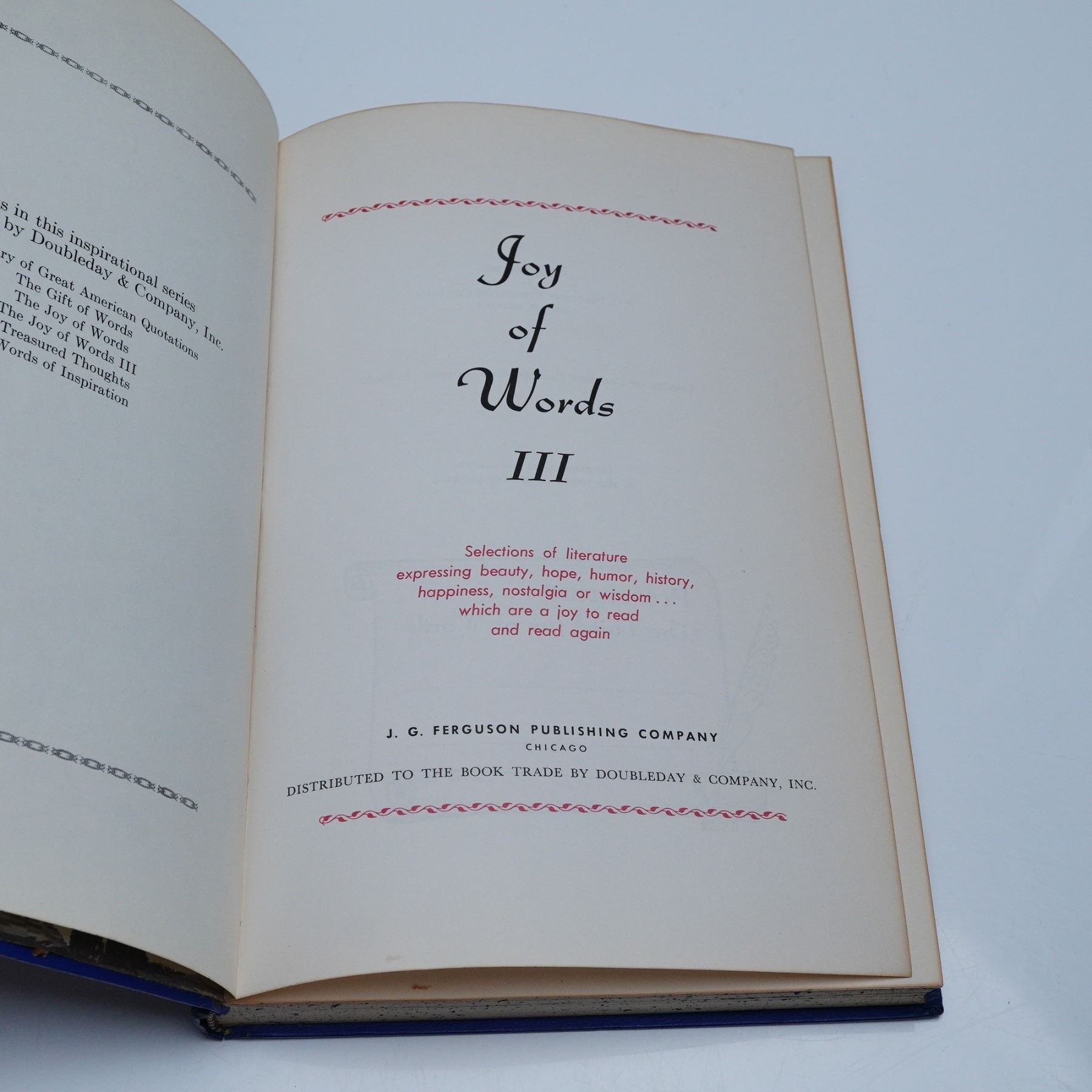 A visually striking five-piece set from the inspirational literary series published by J. G. Ferguson Publishing Company of Chicago. This lot includes The Joy of Words, two volumes of The New Joy of Words, Joy of Words III, and The Gift of Words, the latter edited by Thomas C. Jones. Each volume features selections of prose and poetry chosen to express beauty, humor, wisdom, history, or inspiration - "a joy to read and read again." Originally issued in the mid-20th century, likely in the 1950s - 1960s, these compilations were marketed as collectible gift books, often distributed by mail-order or book clubs such as Doubleday. Each book is bound in ornate decorative covers with metallic lettering and patterned endpapers, with minor wear visible on a few spines and corners. A charming midcentury anthology set for the casual reader or vintage collector.