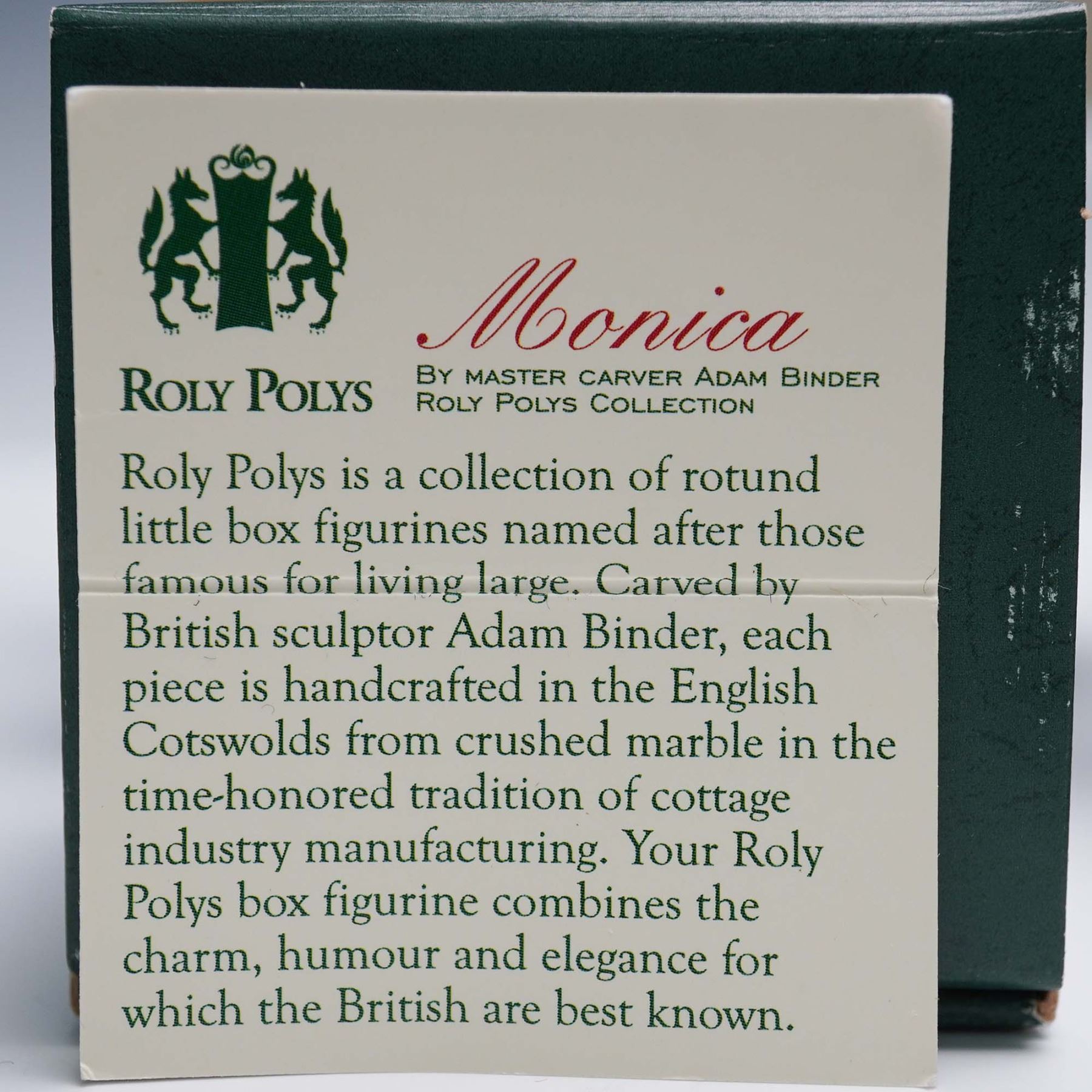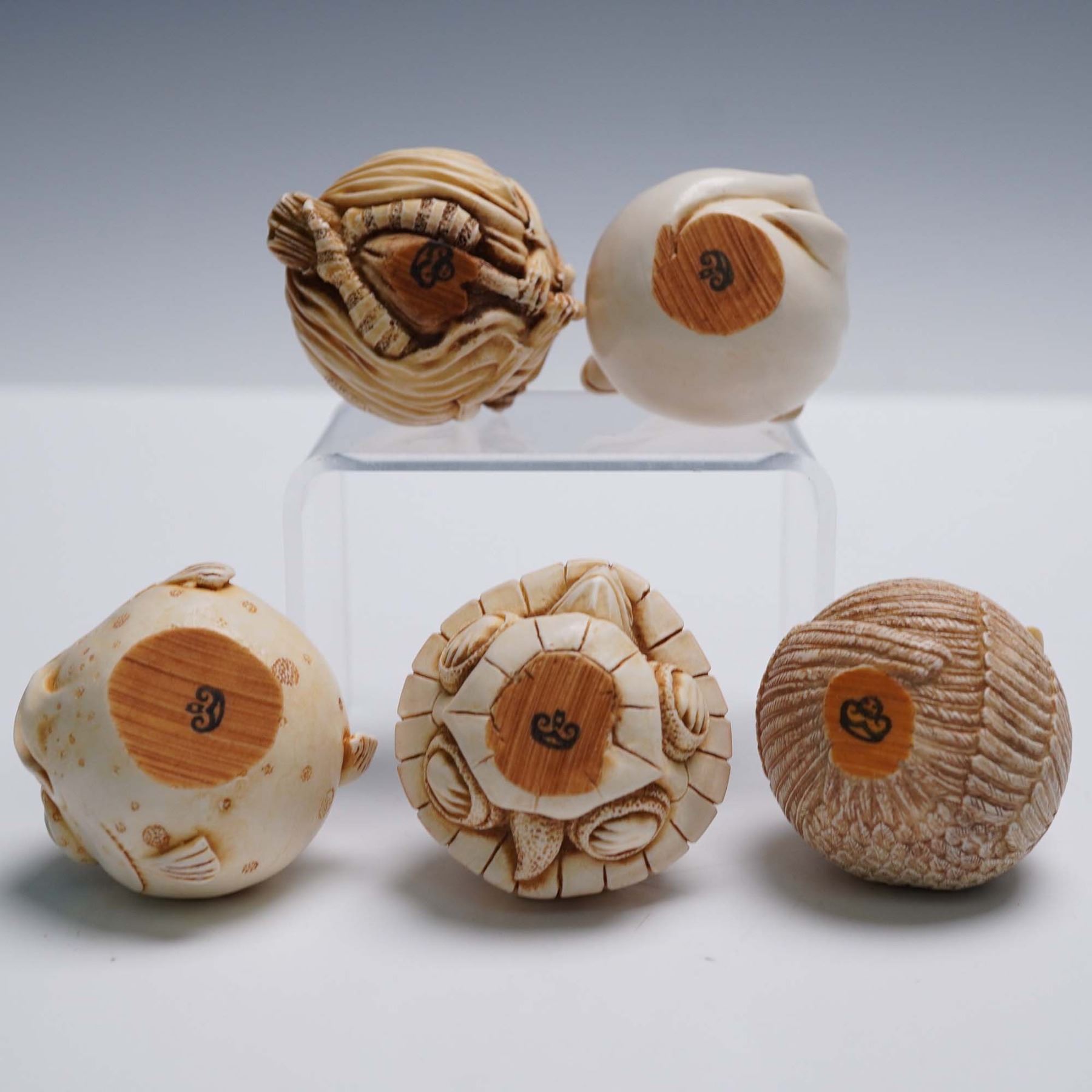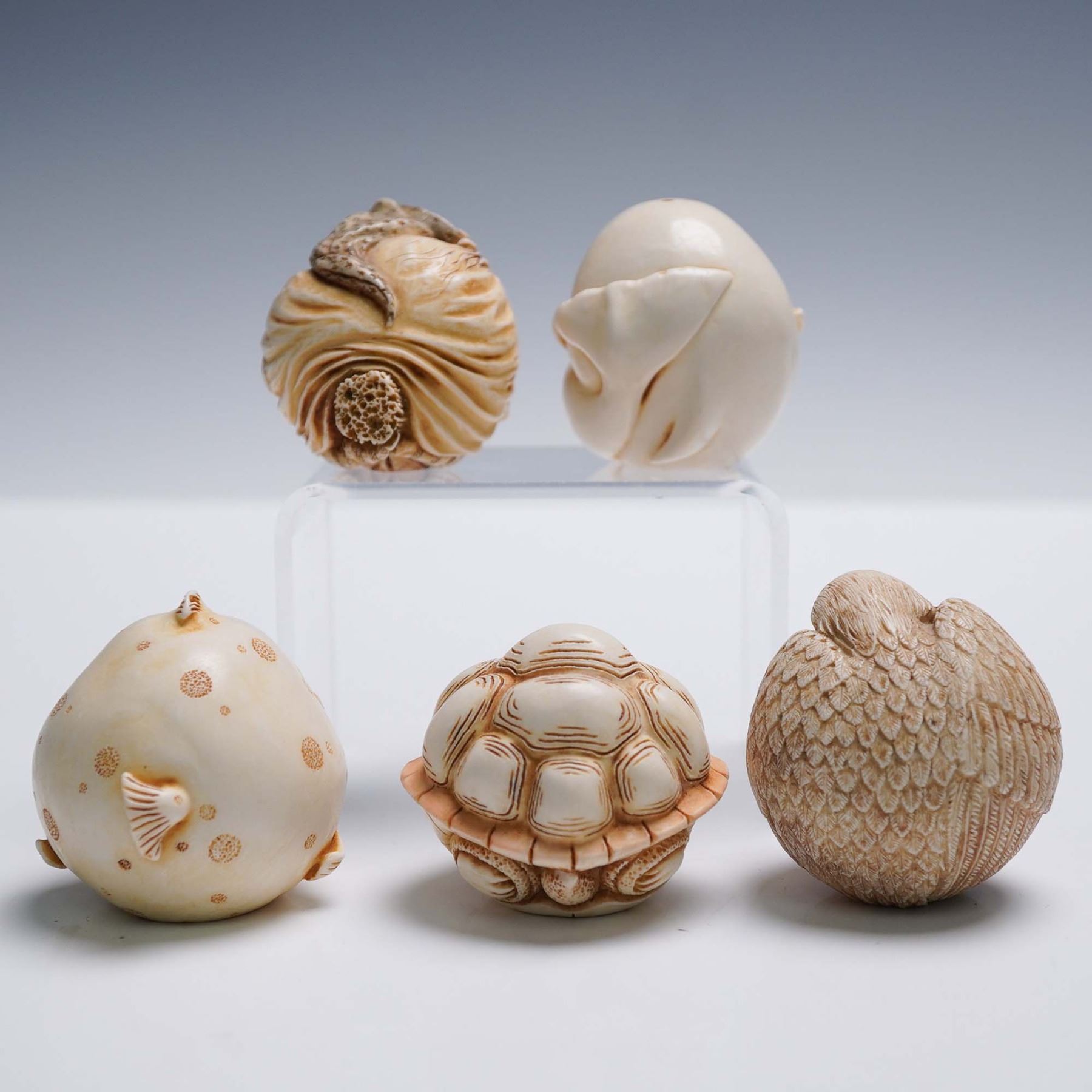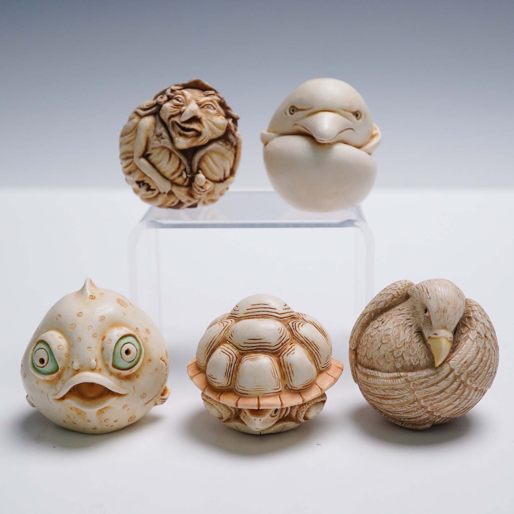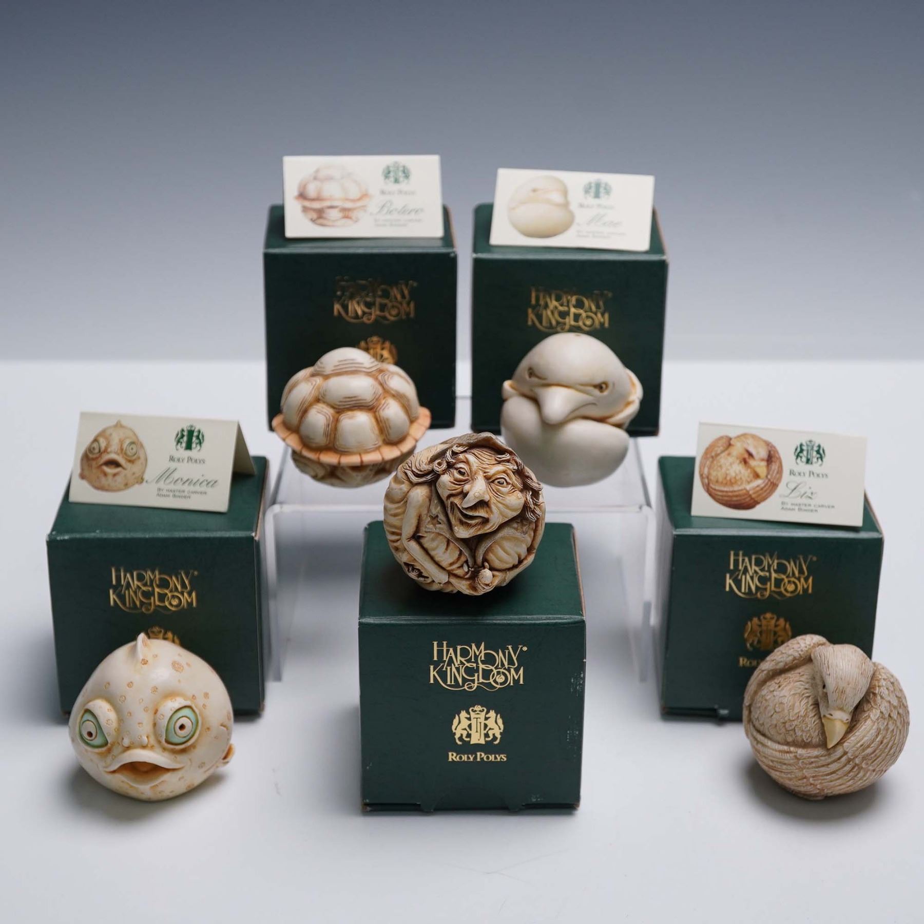 Collection of five whimsical figural sculptures from the Harmony Kingdom Roly Polys series, designed by British master carver Adam Binder. Each rotund piece is handcrafted in the English Cotswolds from crushed marble and resin in the time-honored cottage industry tradition. This set includes Monica (fish), Botero (turtle), Liz (bird). All pieces include their original Harmony Kingdom boxes.