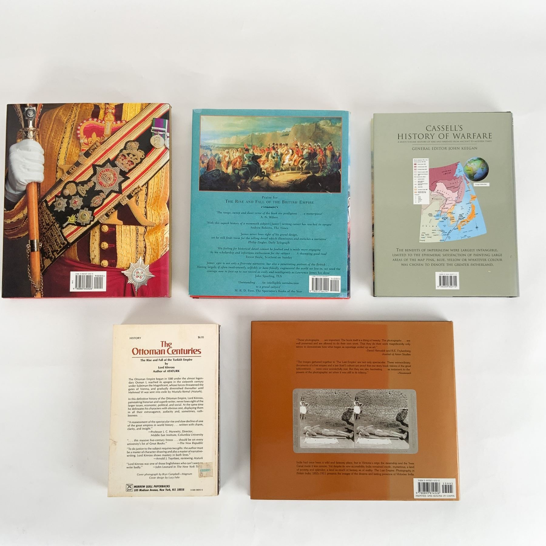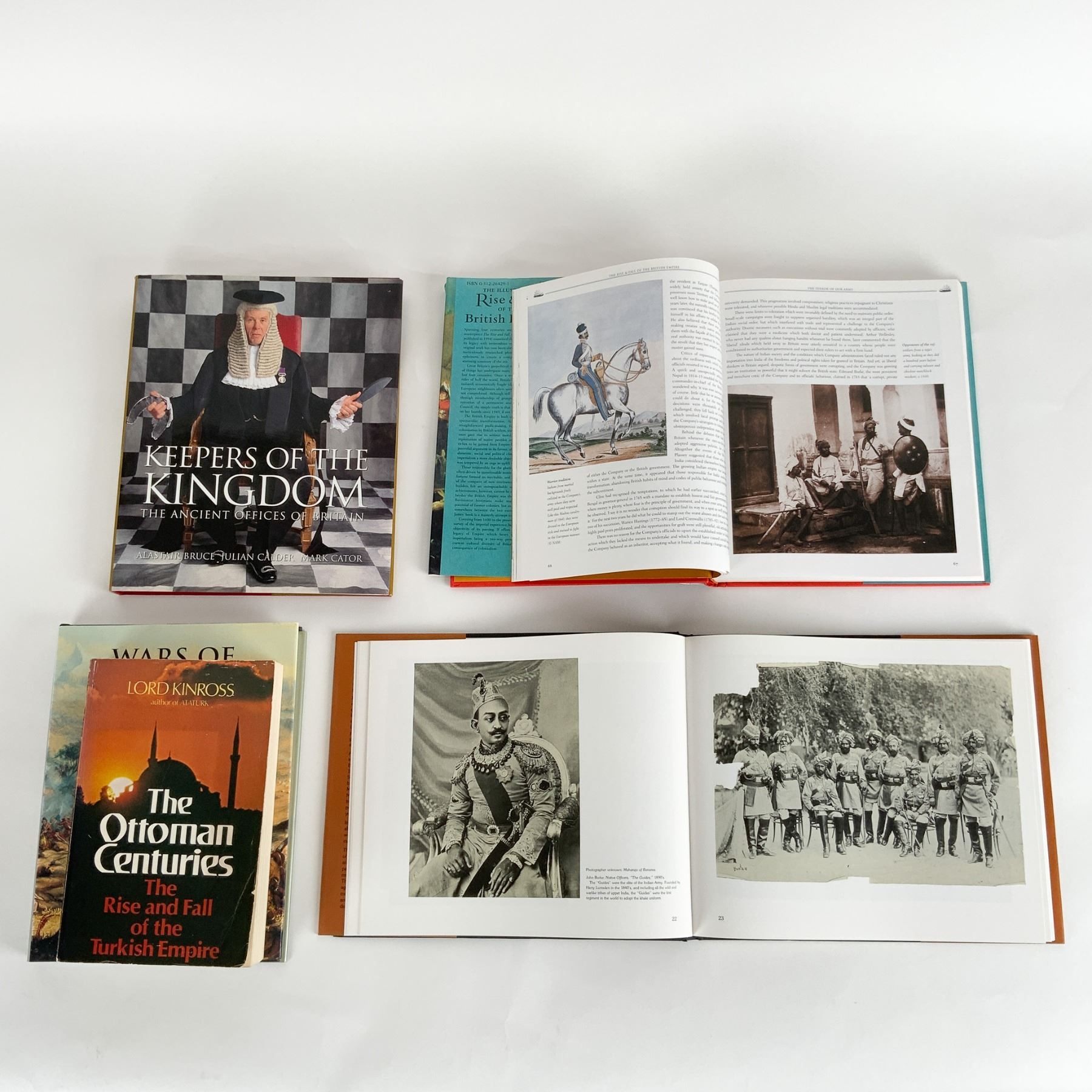This collection of five hardcover books explores the history of empires, colonialism, and military conflicts, offering in-depth historical analysis, photography, and illustrations. Included is The Ottoman Centuries: The Rise and Fall of the Turkish Empire by Lord Kinross, a comprehensive history detailing the expansion, governance, and eventual decline of the Ottoman Empire. The Last Empire: Photography in British India presents a visual documentation of British India through historical photographs, capturing the people, architecture, and events of the colonial period. Wars of Empire by Douglas Porch examines imperial warfare, analyzing the military strategies and conflicts that shaped colonial rule. The Illustrated Rise and Fall of the British Empire provides a richly illustrated account of the British Empire's expansion, dominance, and decline, featuring historical images and detailed narratives. Keepers of the Kingdom by Bruce Calder Cator delves into the ancient offices and institutions within the British Empire. Largest book measures 11"H.