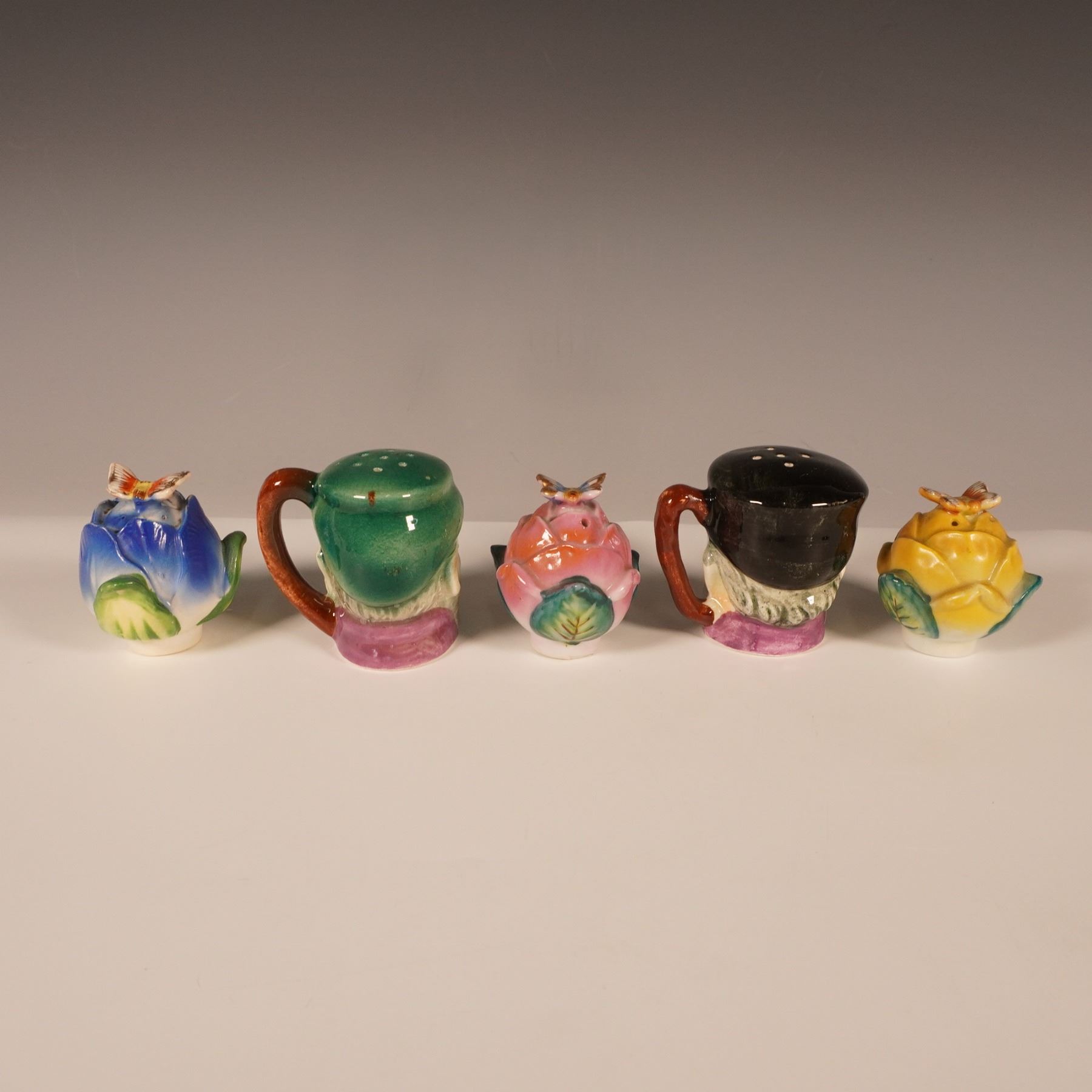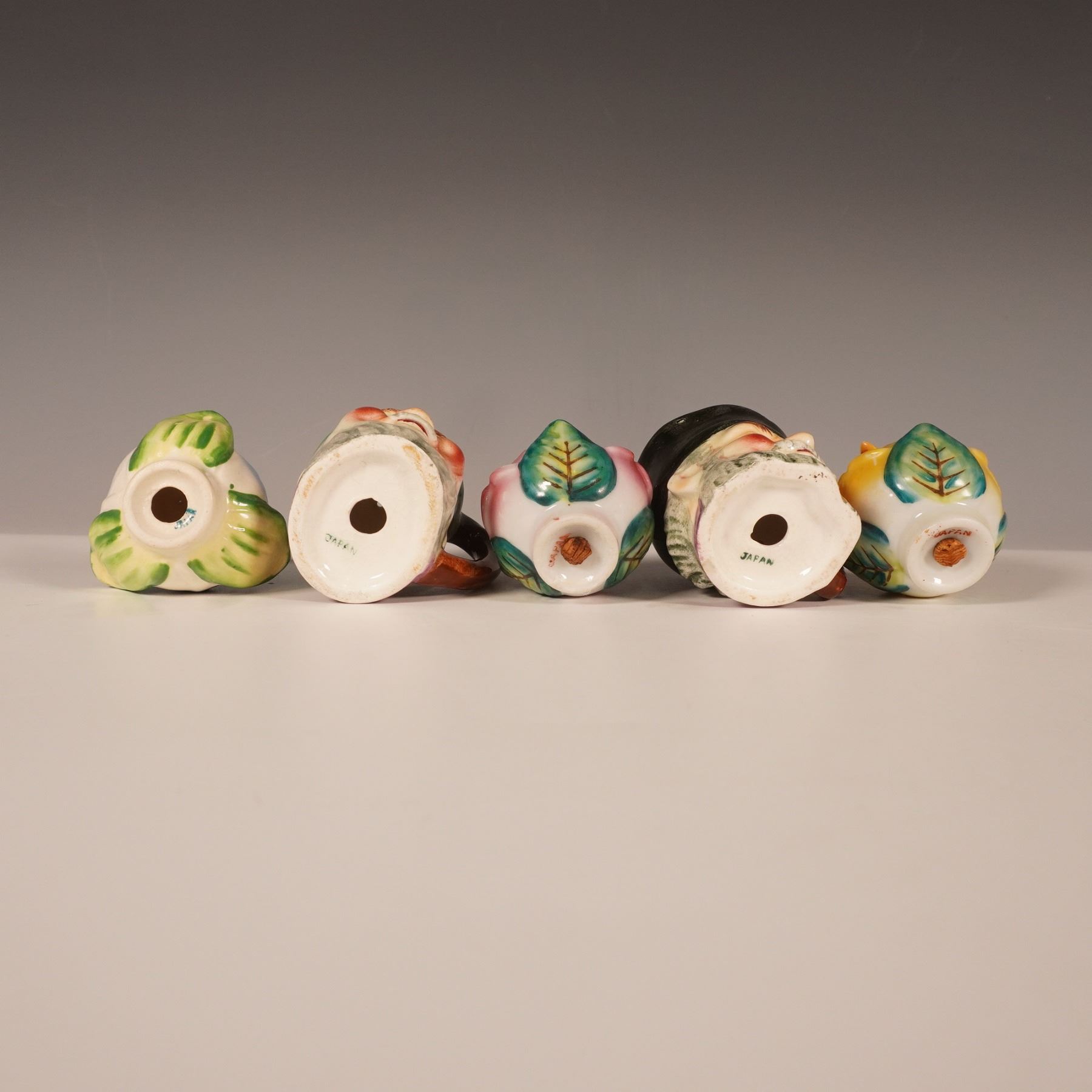Delightful set of five hand-painted ceramic figural pieces, including two charming Toby jugs and three floral-inspired salt and pepper shakers. The jugs depict expressive faces with rich detailing, complemented by vibrantly colored flowers with butterfly accents. Each piece showcases a striking color palette with finely crafted leaf and petal motifs, embodying classic mid-century Japanese artistry. Marked "Japan" on the underside, this set is a wonderful addition to any vintage ceramic collection. Largest item measures 2.5"H.