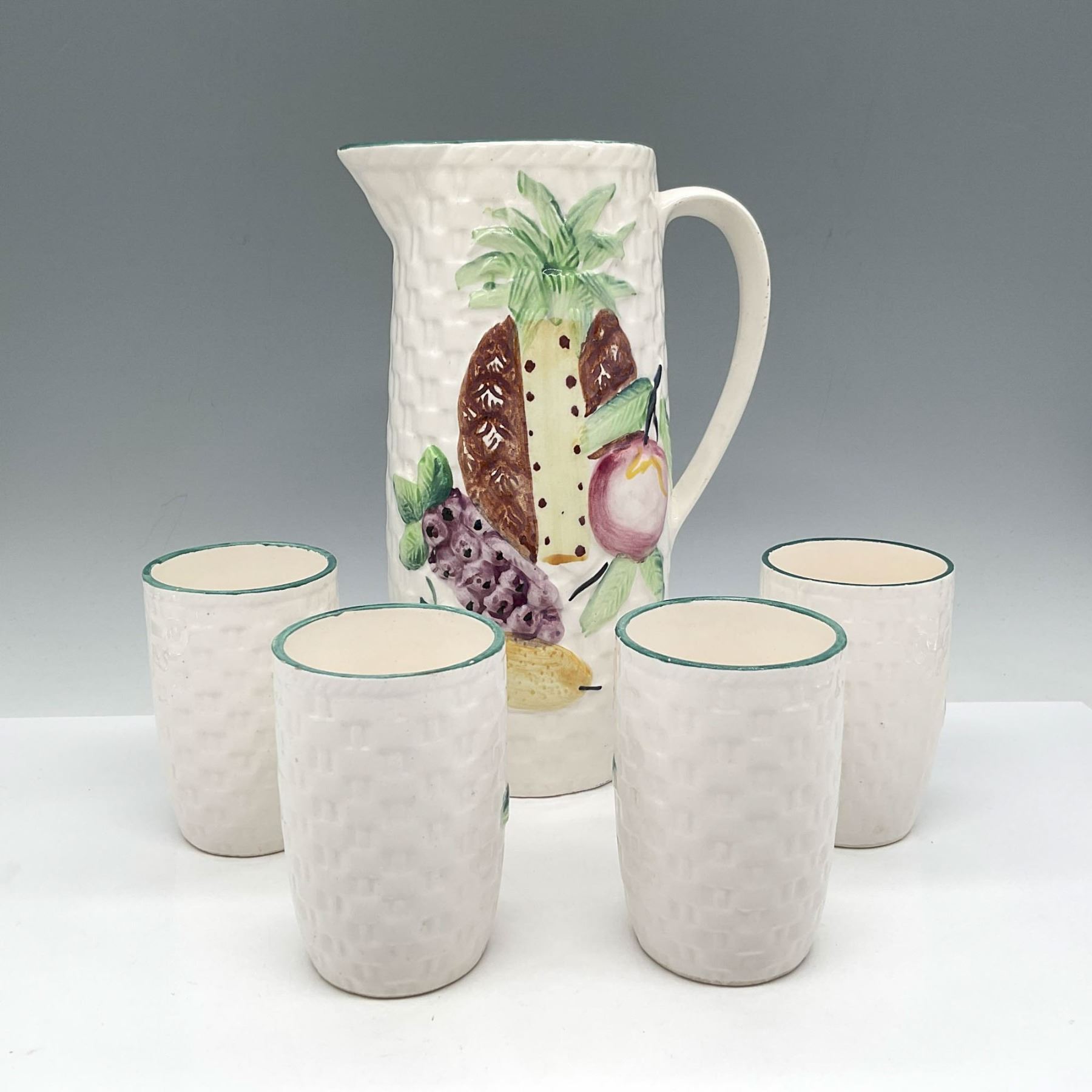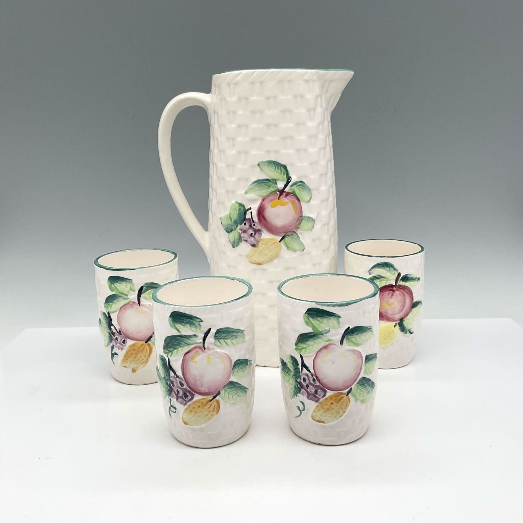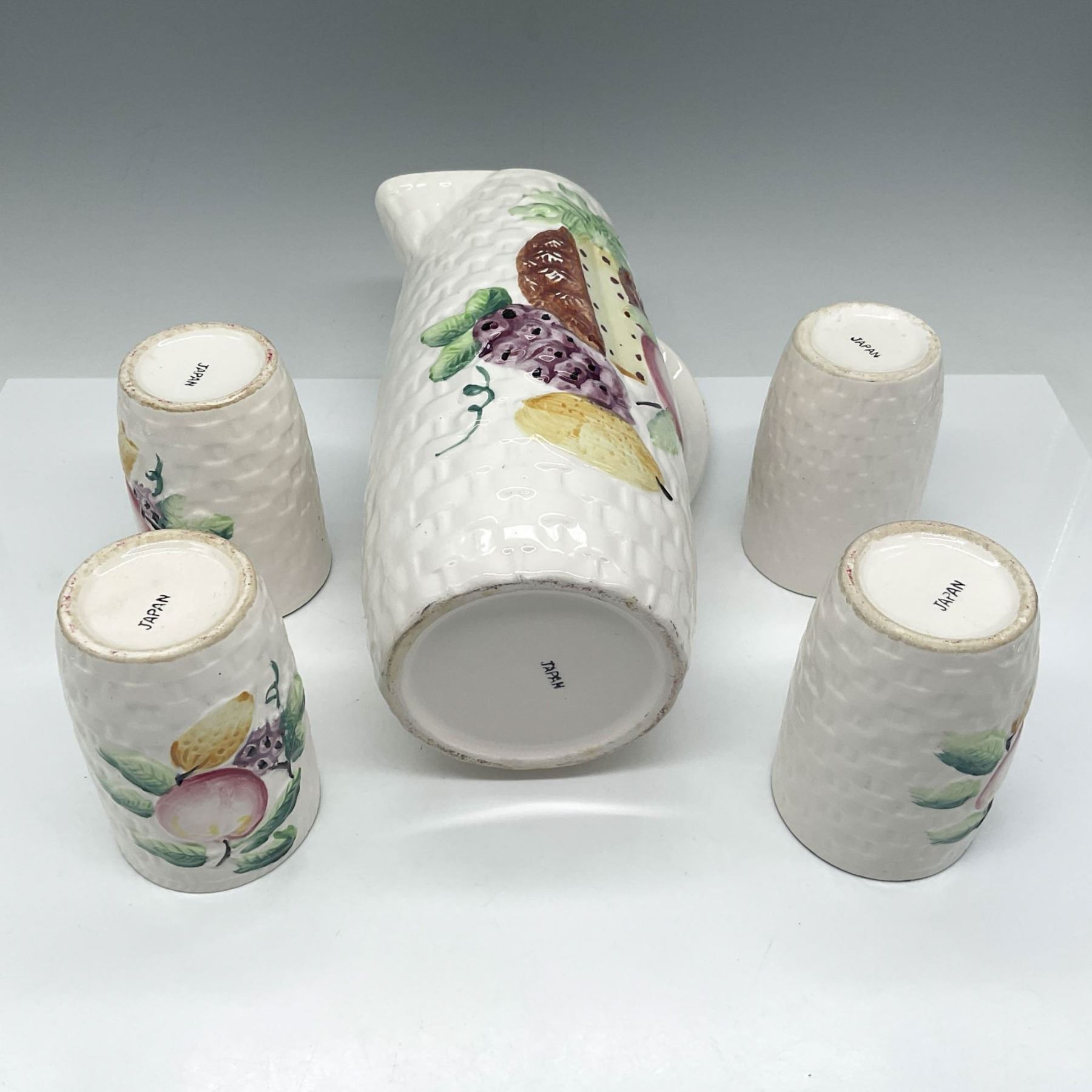 Simple basket weave pattern on pitcher and glasses with colorful fruit design. Japan backstamp. Largest piece 6"L x 4.25"W x 9"H.