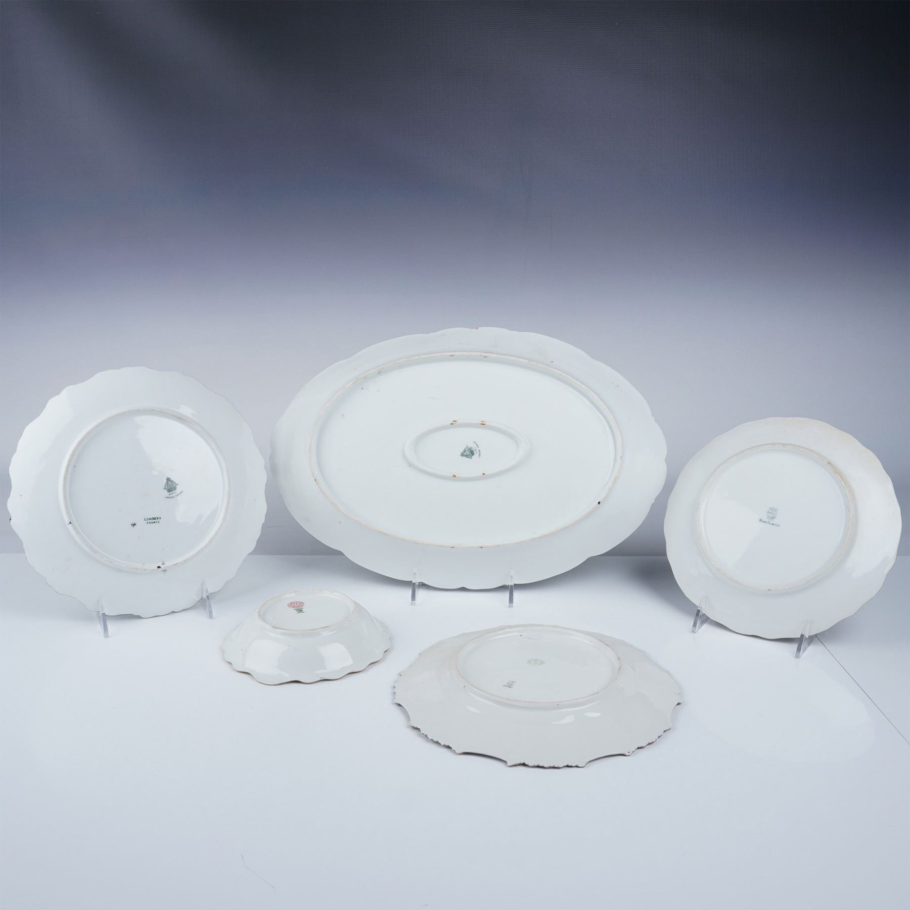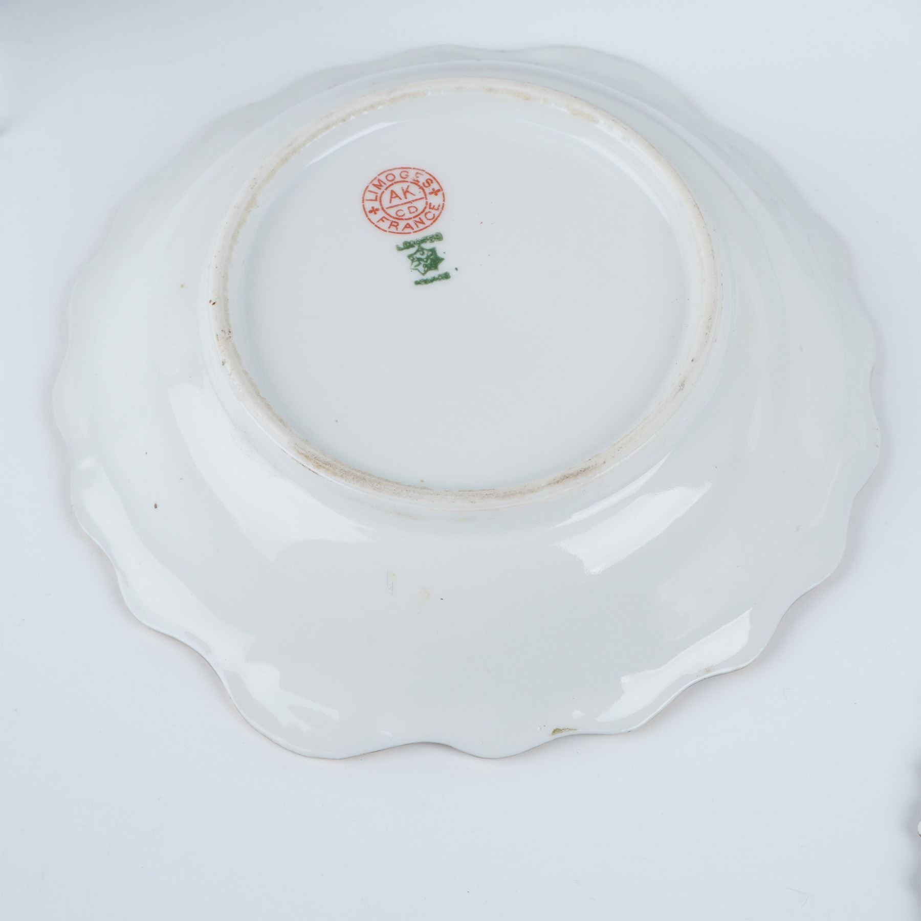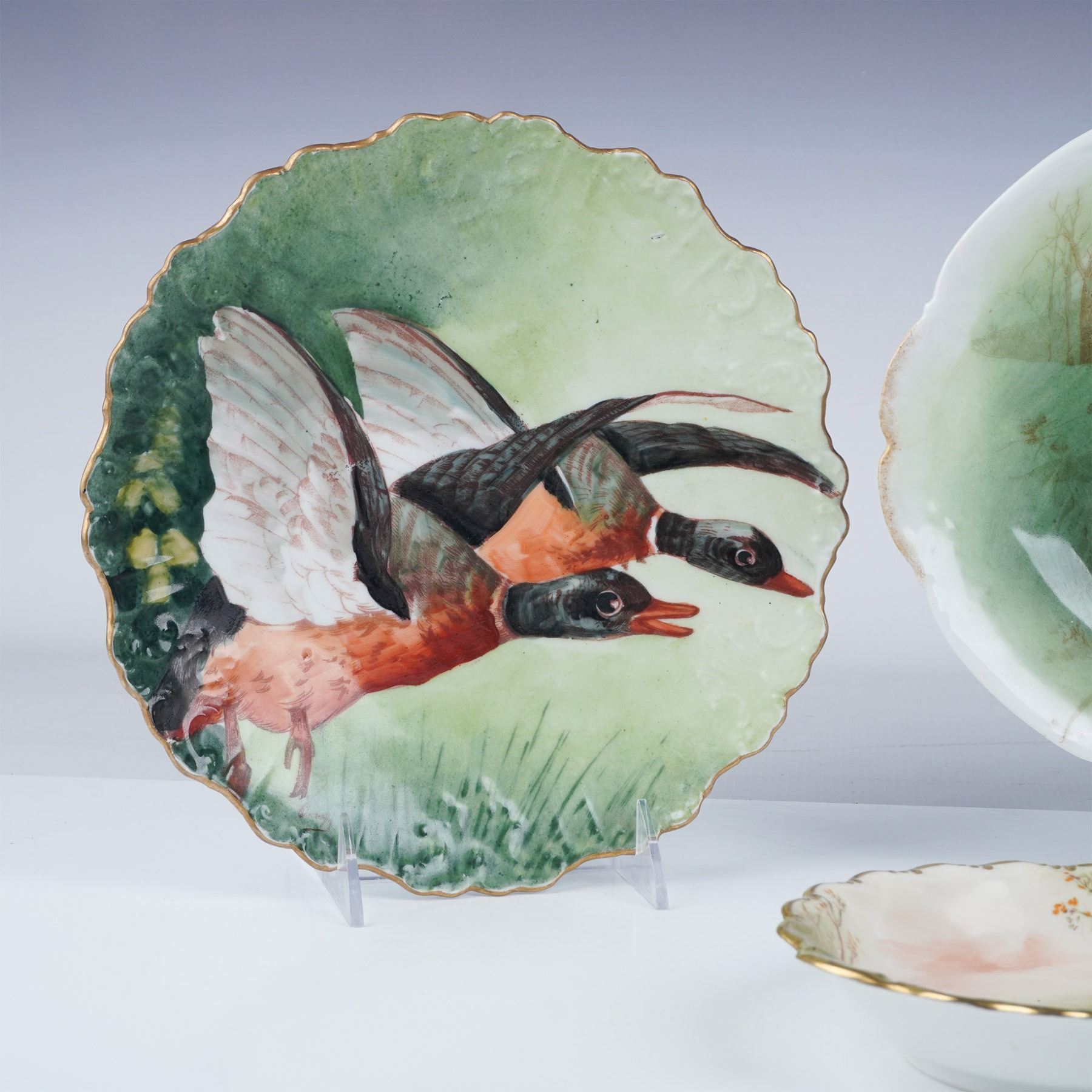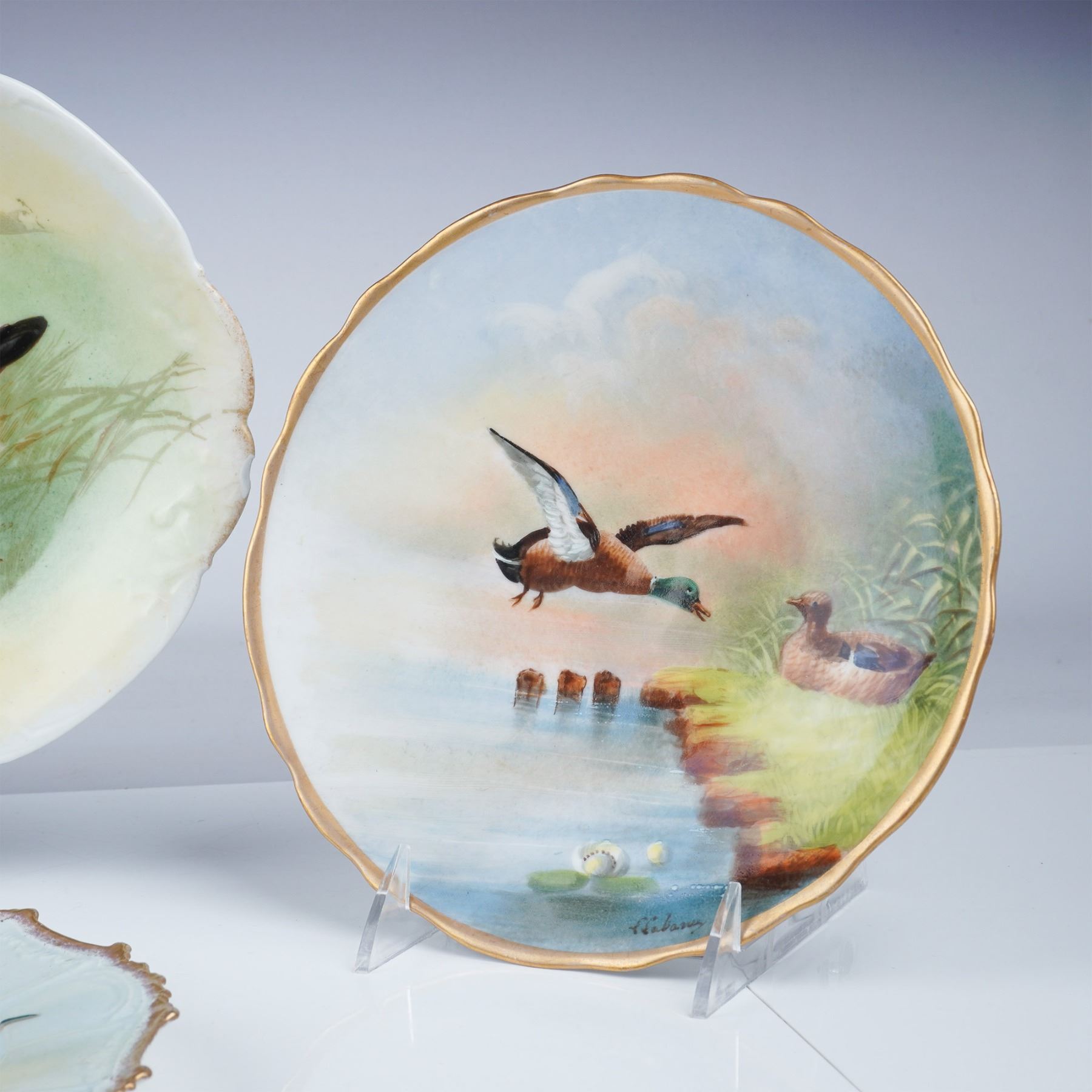 This lot features five Limoges china plates and bowls, each exquisitely hand-painted with bird and game scenes, signed by various artists, including Roche, Lue, Broquin, and Fabary. The pieces showcase intricate artistry with gilt-edged rims, highlighting their craftsmanship. The largest piece measures 16"L x 1.75"H. Backstamps include Limoges AK/CD, JRL France, and others, confirming their French origin.