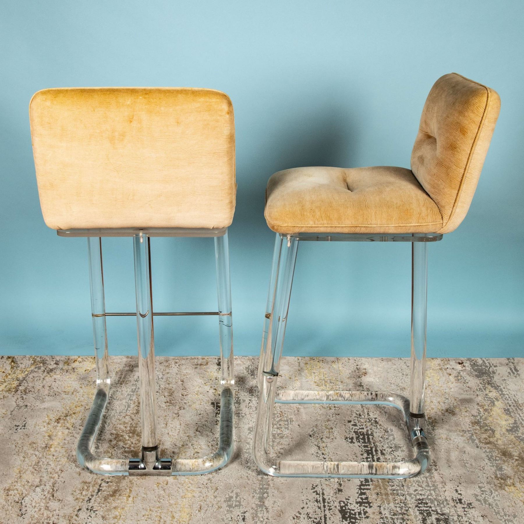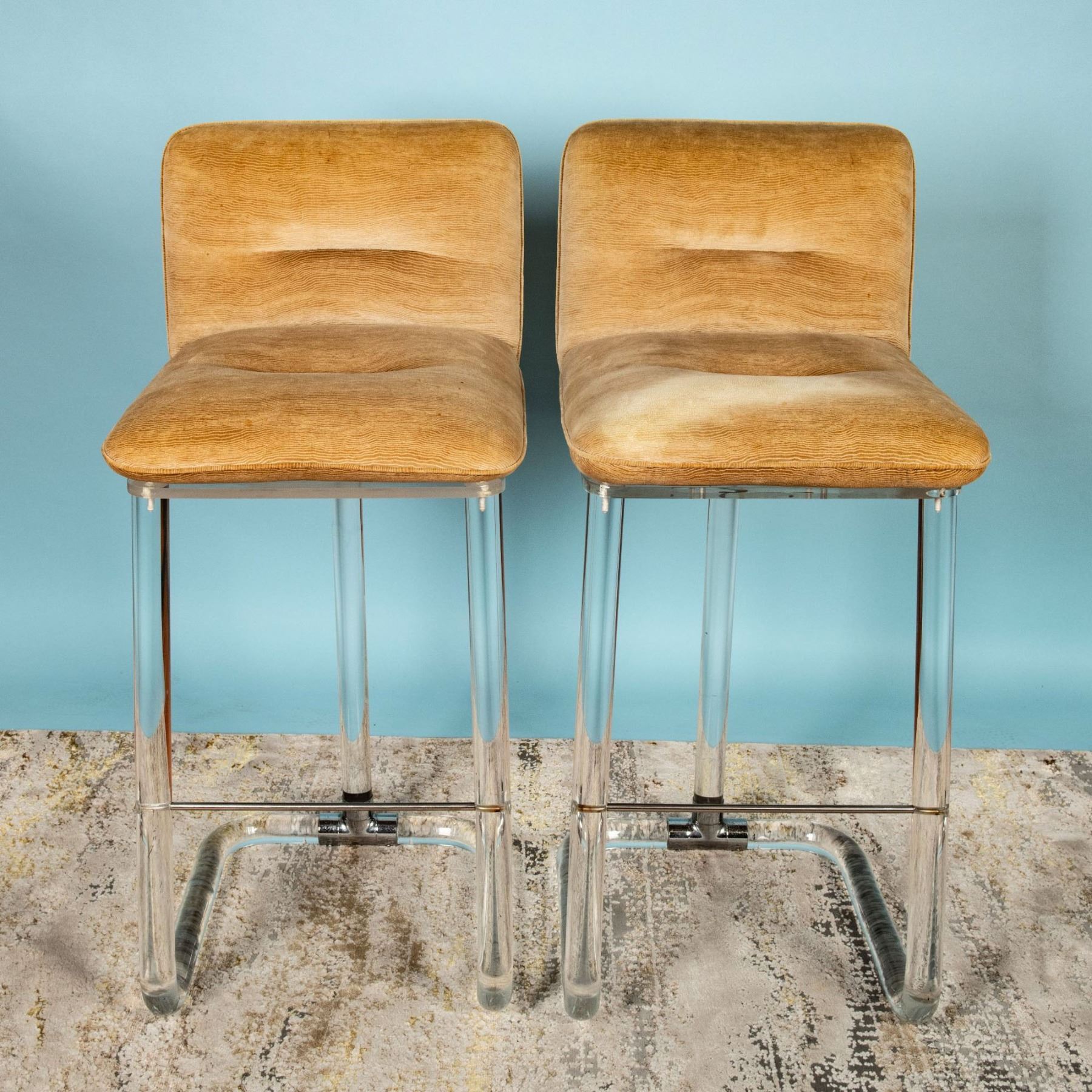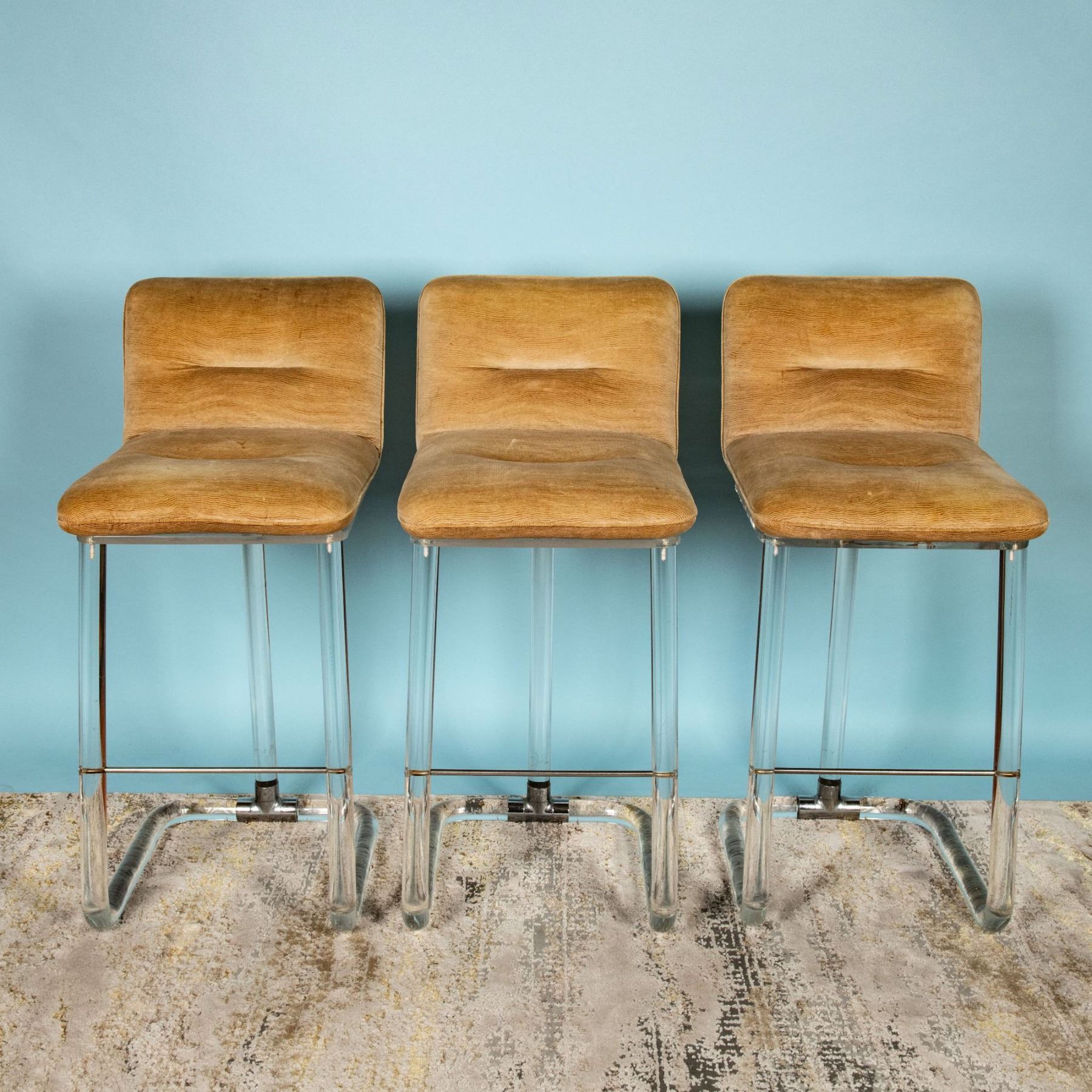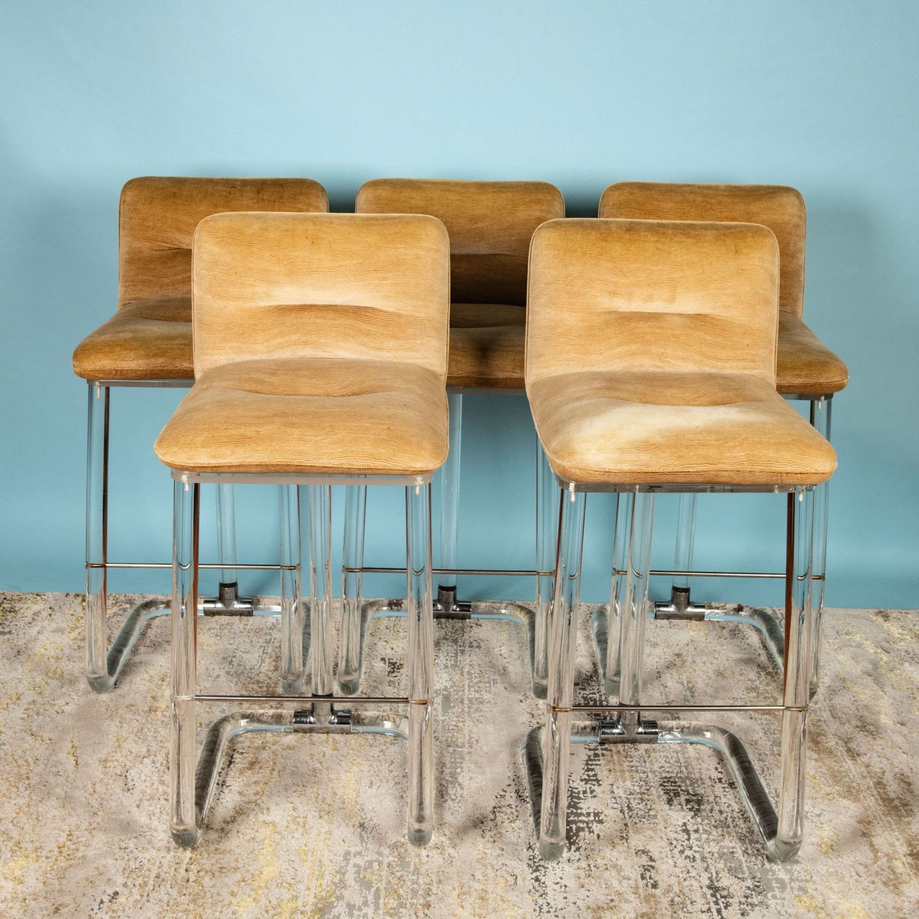 This exceptional set of five bar stools reflects Mid-Century Modern-inspired design, dating to the 1970s, by Lion in Frost, a celebrated name in Lucite furniture. Each stool features tubular Lucite frames paired with polished chrome accents and soft beige velvet swivel seats, blending functionality with elegant minimalism. The stools are etched with the signature of Lion in Frost, authenticating their provenance. Lion in Frost rose to prominence in the 1970s, known for their innovative use of Lucite to create luxurious, modern furniture. Their designs, inspired by the clean lines of Mid-Century Modern aesthetics, were a hallmark of high-end interiors during the period, and they remain highly sought after by collectors and enthusiasts of vintage design. The stools bear the etched signature of Lion in Frost. This set of five Lucite bar stools by Lion in Frost represents an outstanding opportunity to own iconic pieces of vintage 1970s design. Their timeless aesthetic and functional elegance make them a valuable addition to both contemporary and retro interiors.