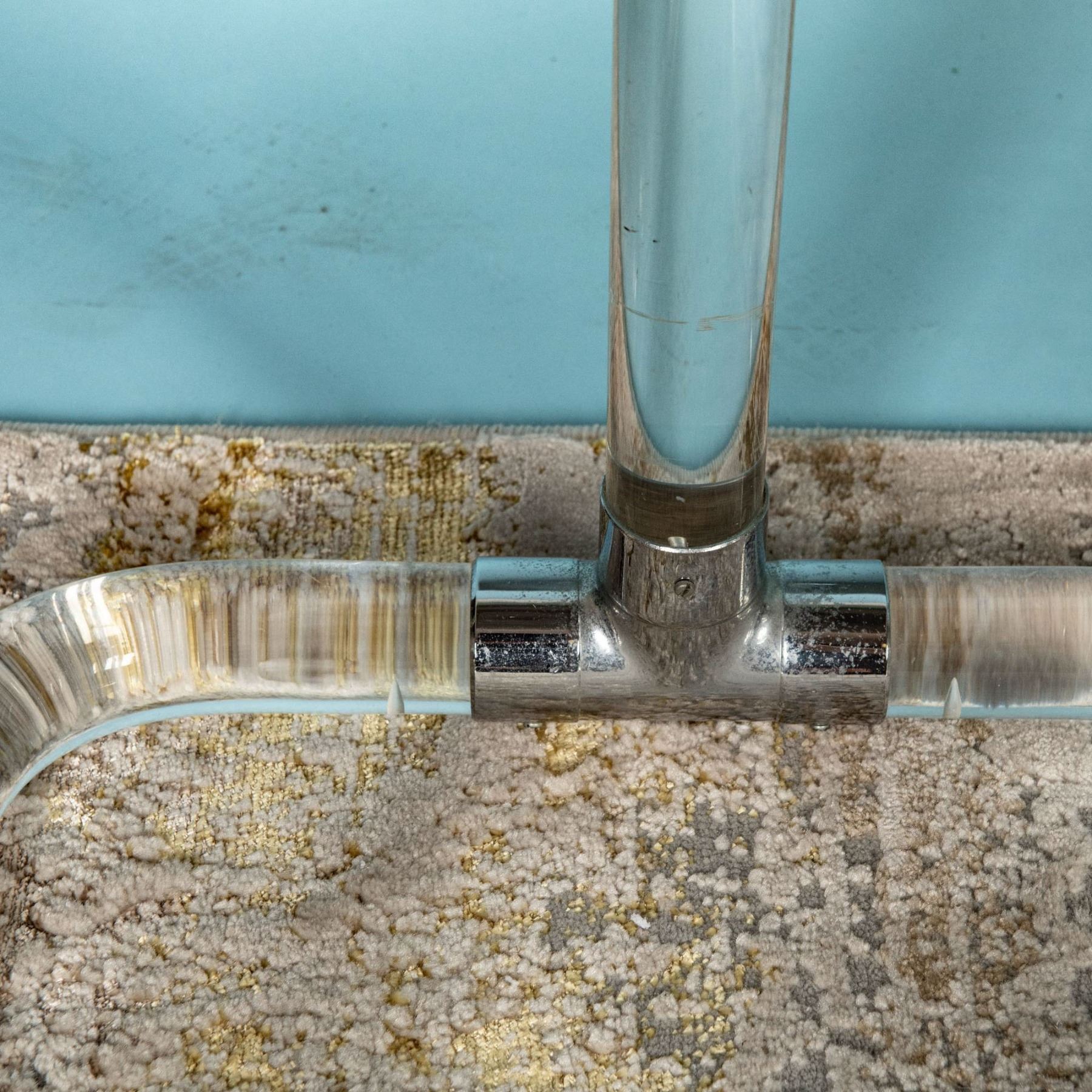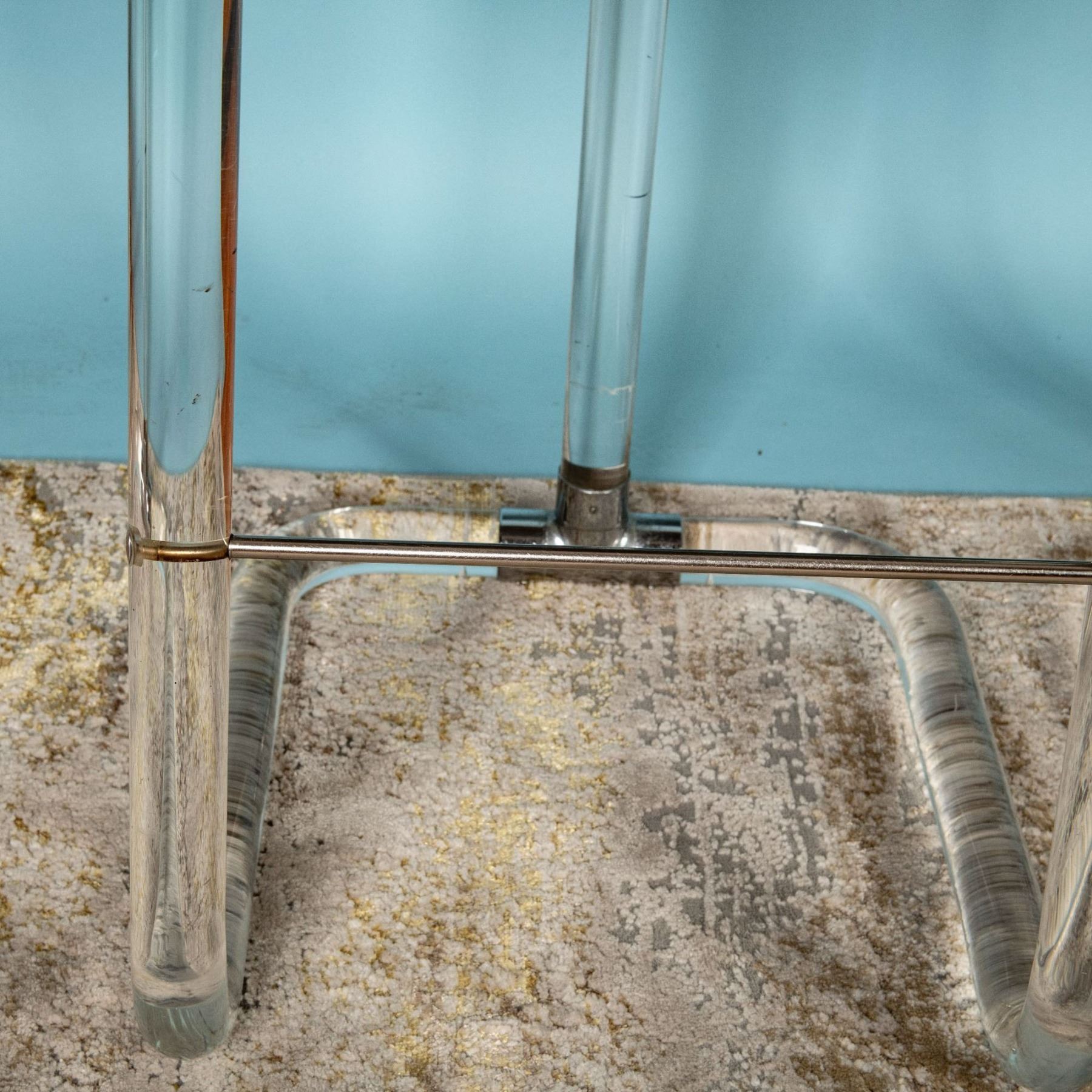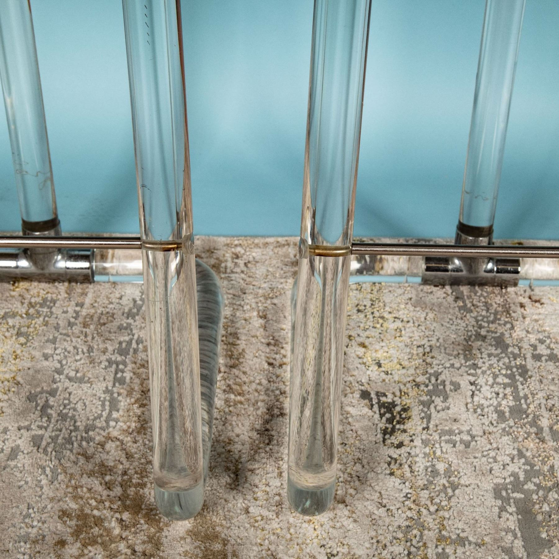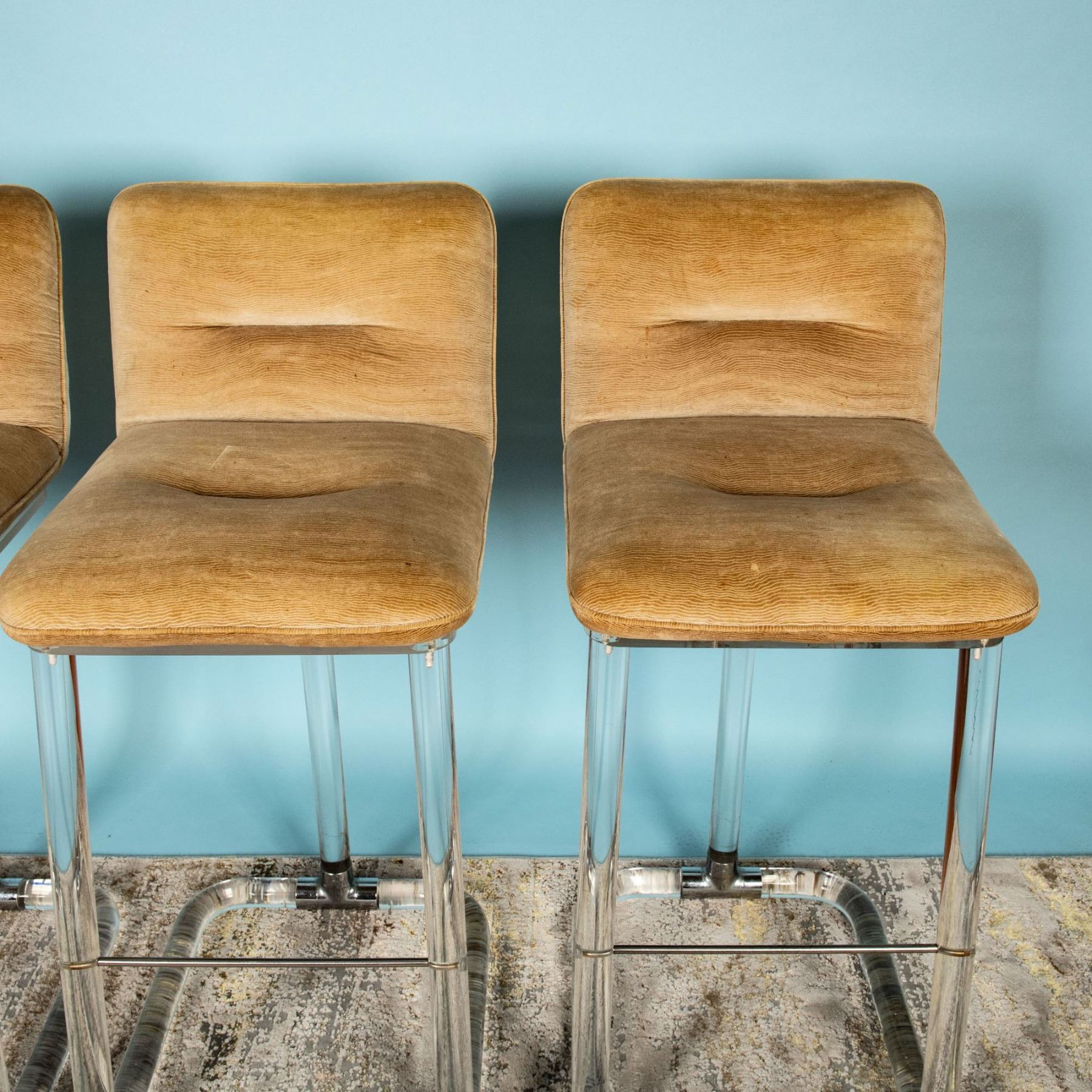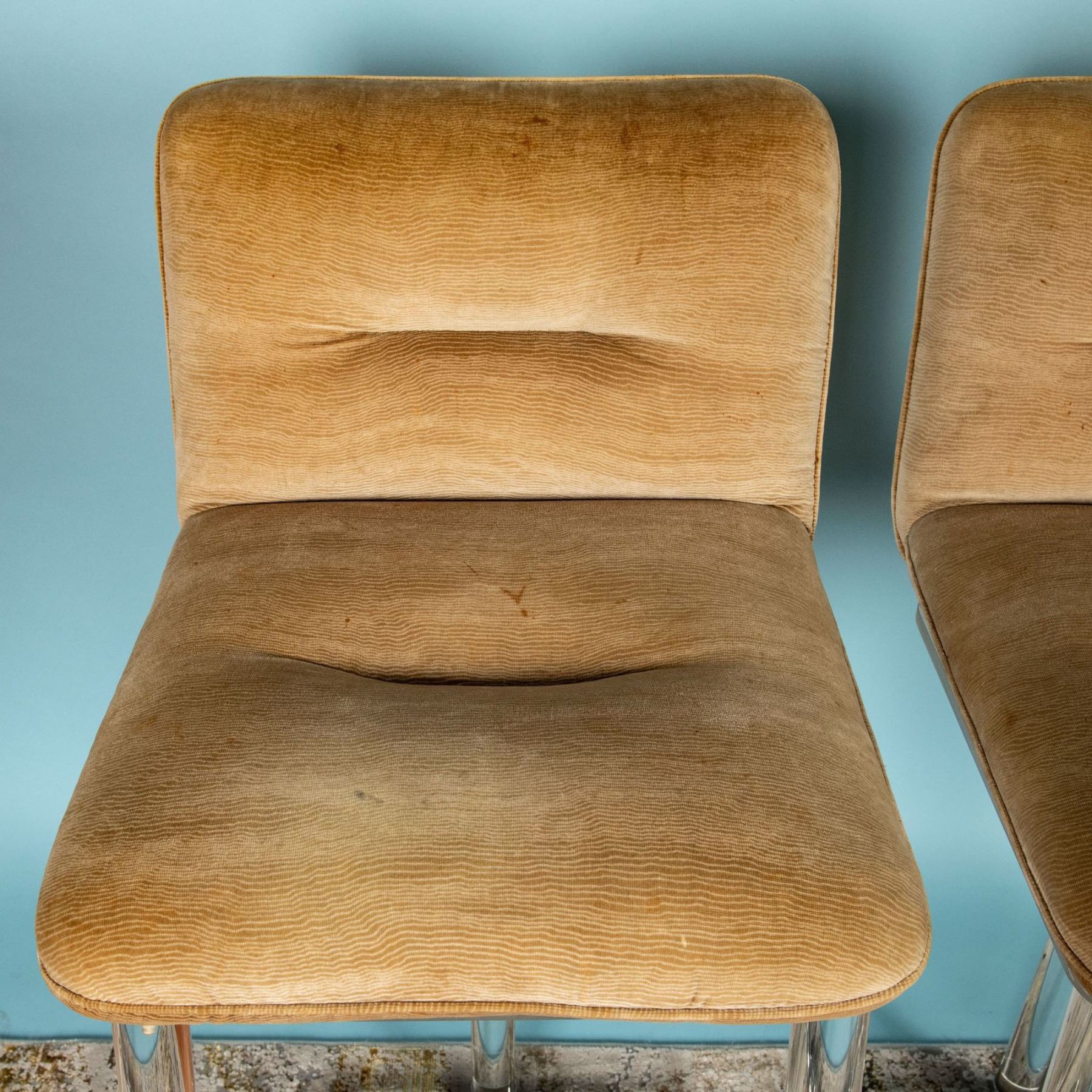 Condition: Age related wear. Minor superficial stains on the cushion of two of the chairs. Minimal scratches on lucite.