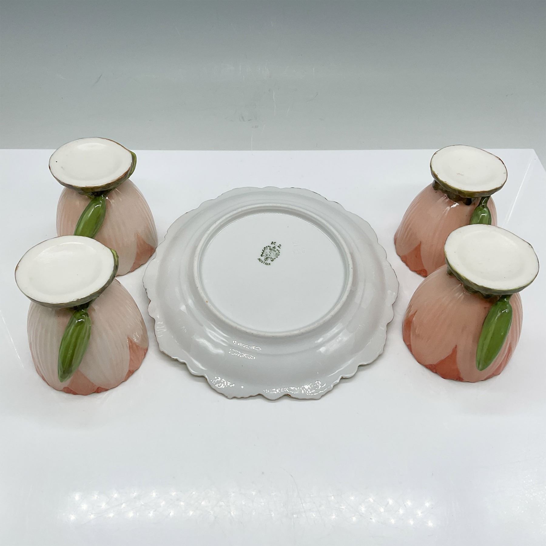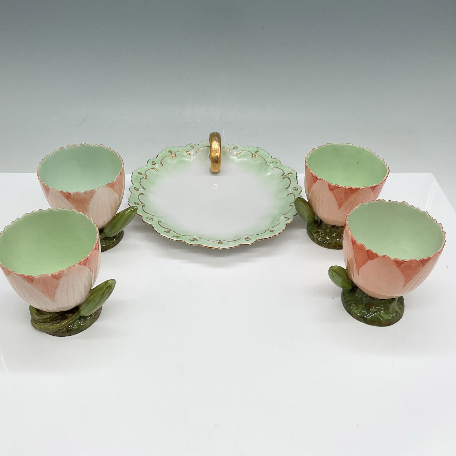 Charming antique majolica cup and tray set, featuring four floral-shaped cups and a matching tray (6.5" dia.). The cups (3.25"H) resemble blooming flowers with soft pink petals, green interiors, and sculpted green leaf handles and bases. The tray is elegantly scalloped, with a white and green glaze accented by a gold-tone handle. The underside of the tray bears a maker’s mark, indicating its origin and craftsmanship. This delightful set is a wonderful example of majolica pottery, known for its vibrant glazes and botanical motifs, making it an excellent addition to any collection of antique ceramics.
