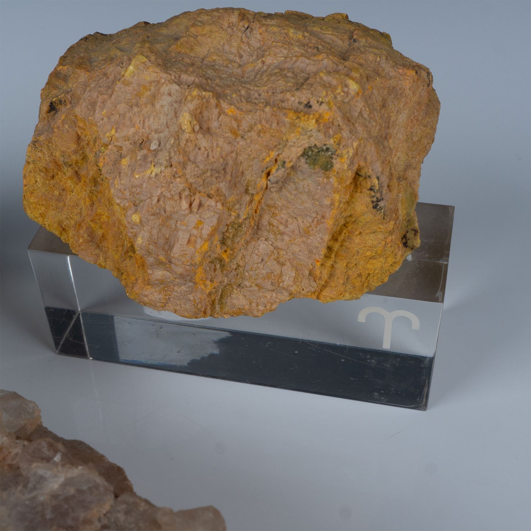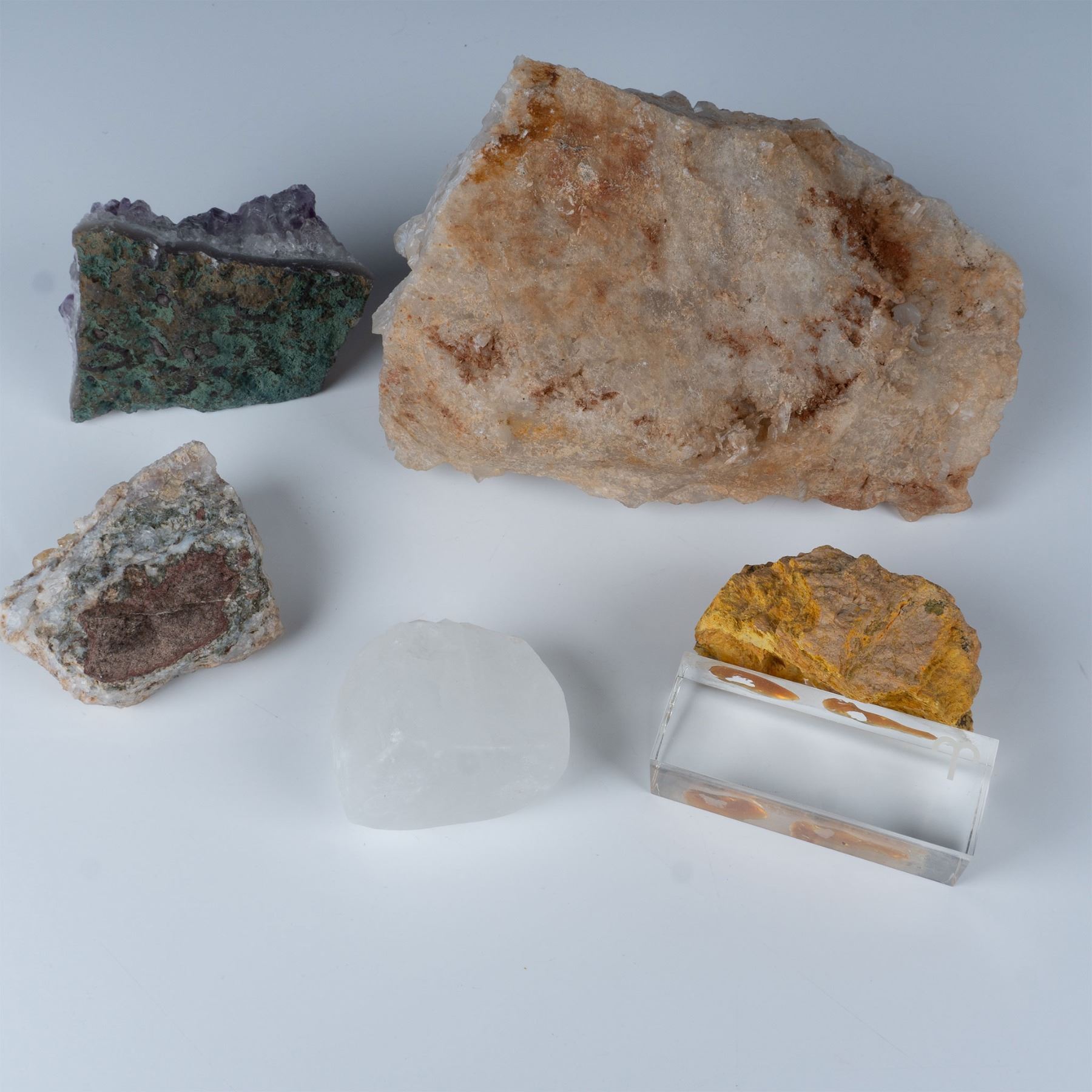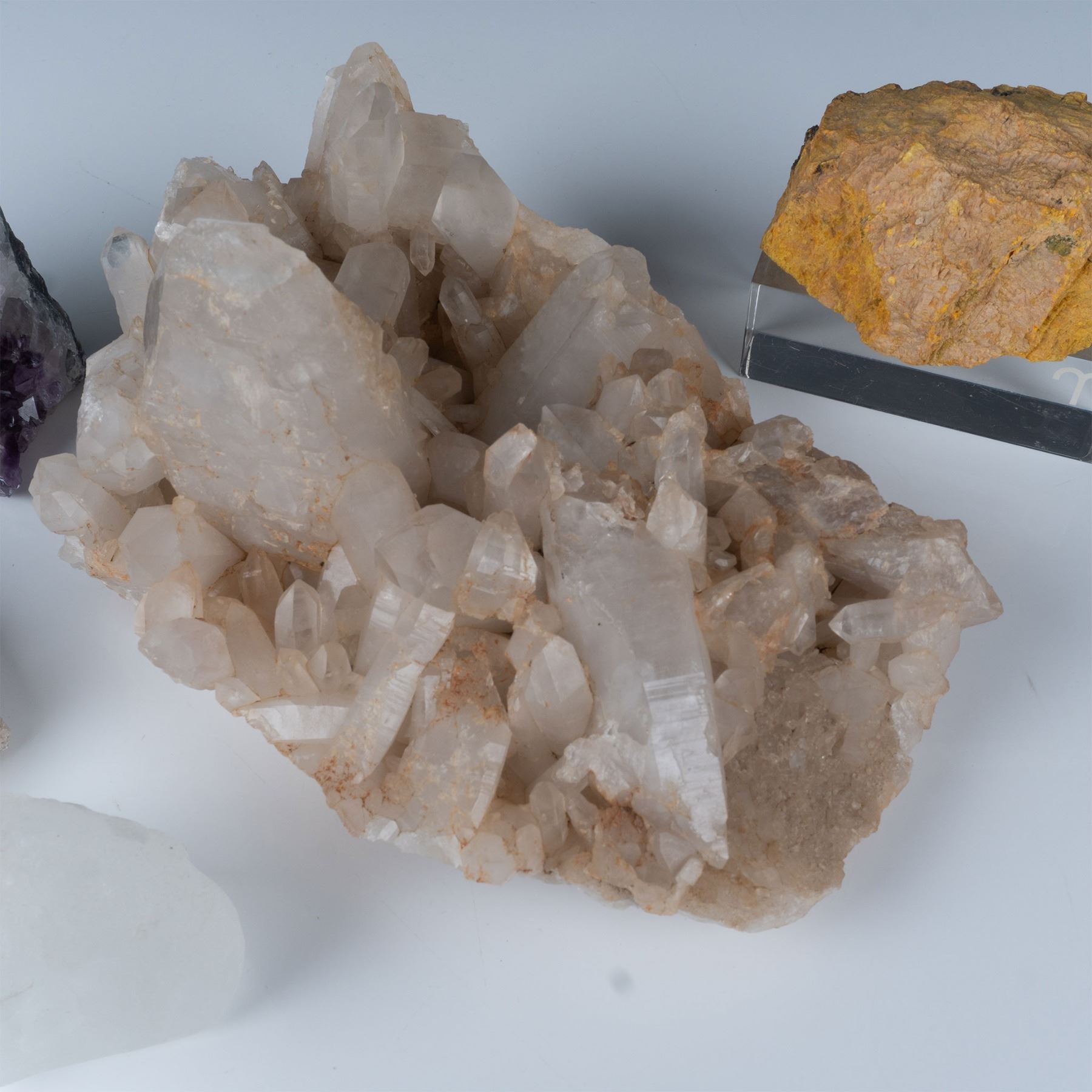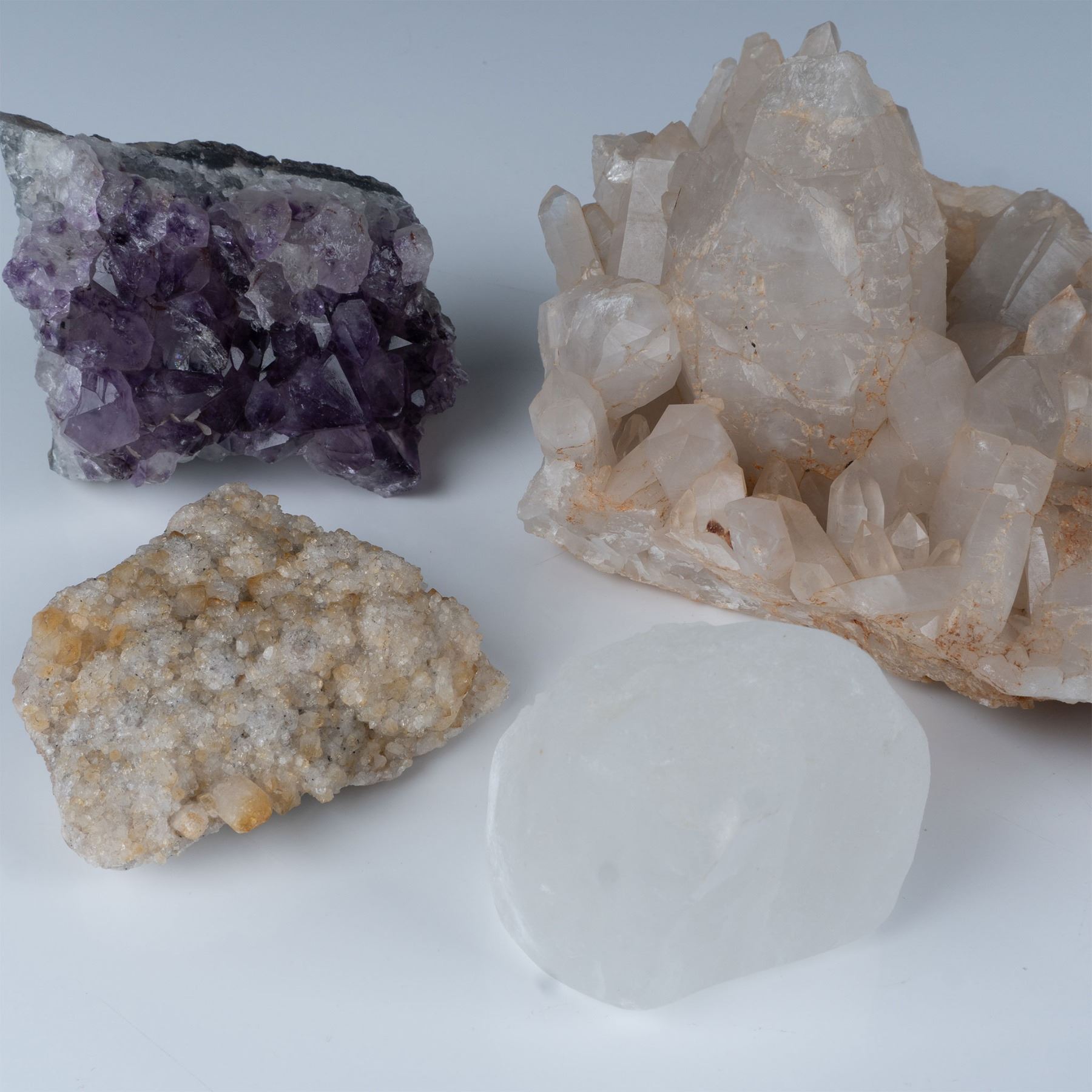 This captivating mineral rock grouping features a stunning array of natural specimens including Amethyst and Quartz alongside formations thought to be Citrine, Selenite, and Kasolite, each exhibiting unique formations and vibrant colors. The Amethyst pieces showcase the deep, rich purple hues for which the mineral is renowned, while the Quartz crystals, with their translucent clarity, offer an elegant contrast. Largest item measures 8.5"L x 5.5"W x 4.5"H.