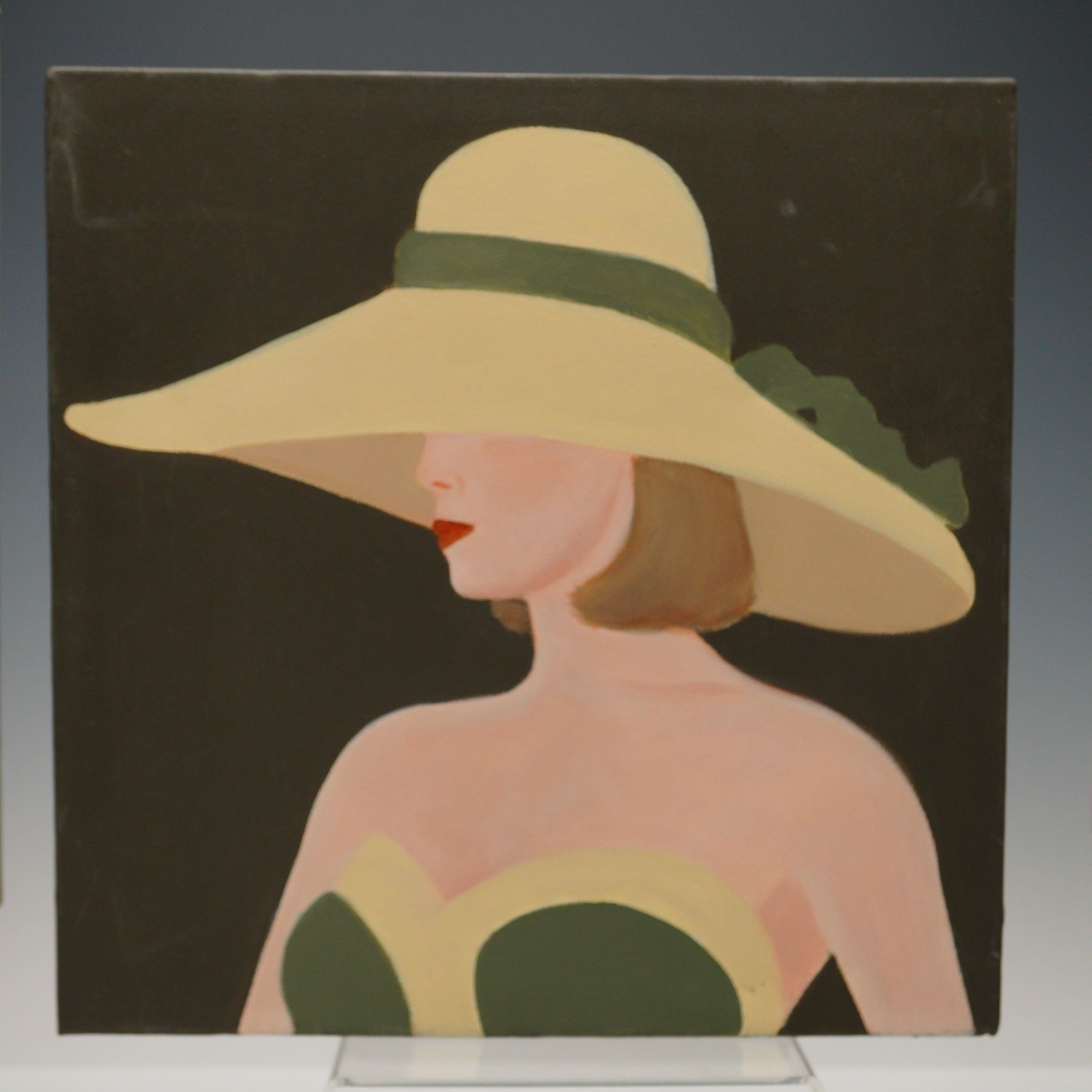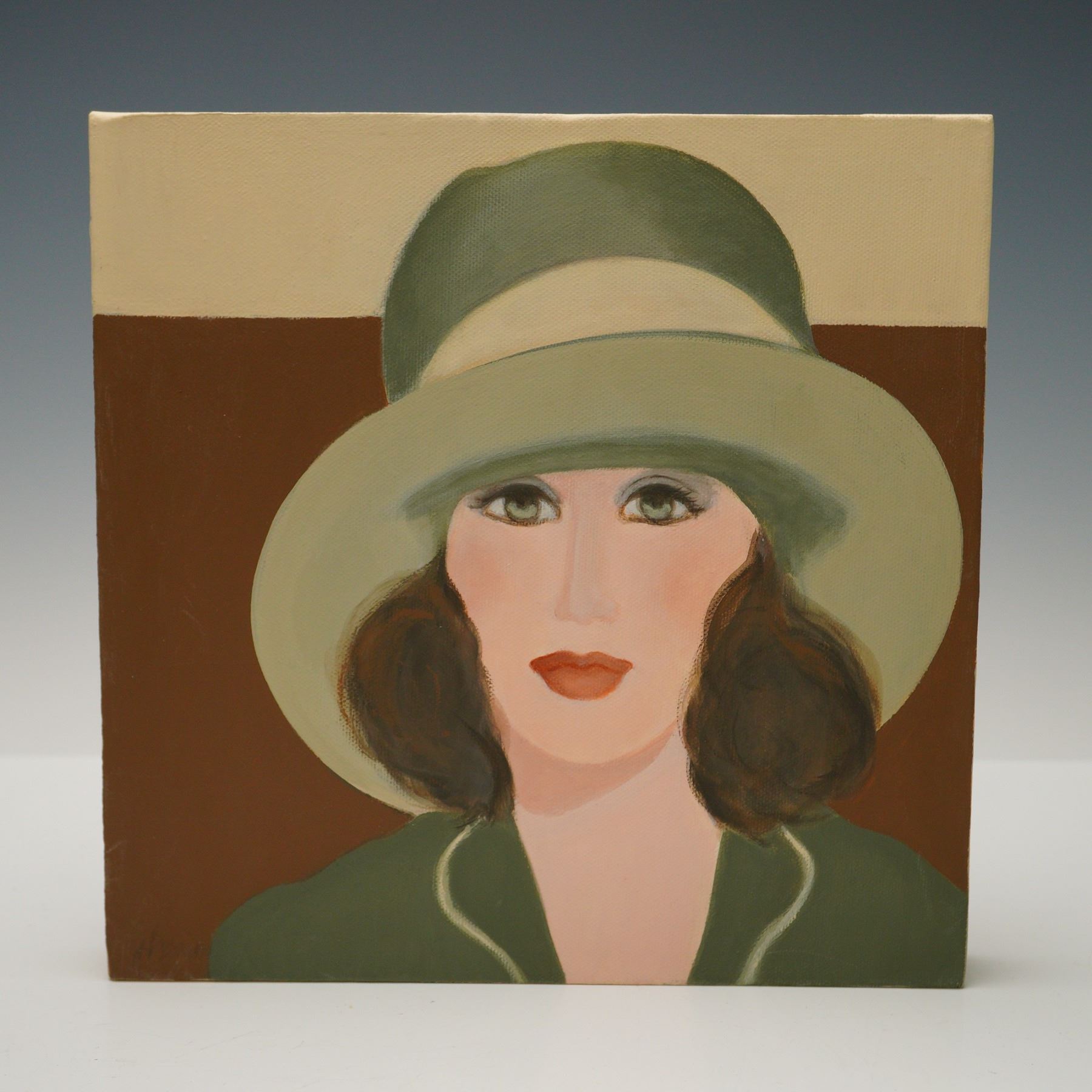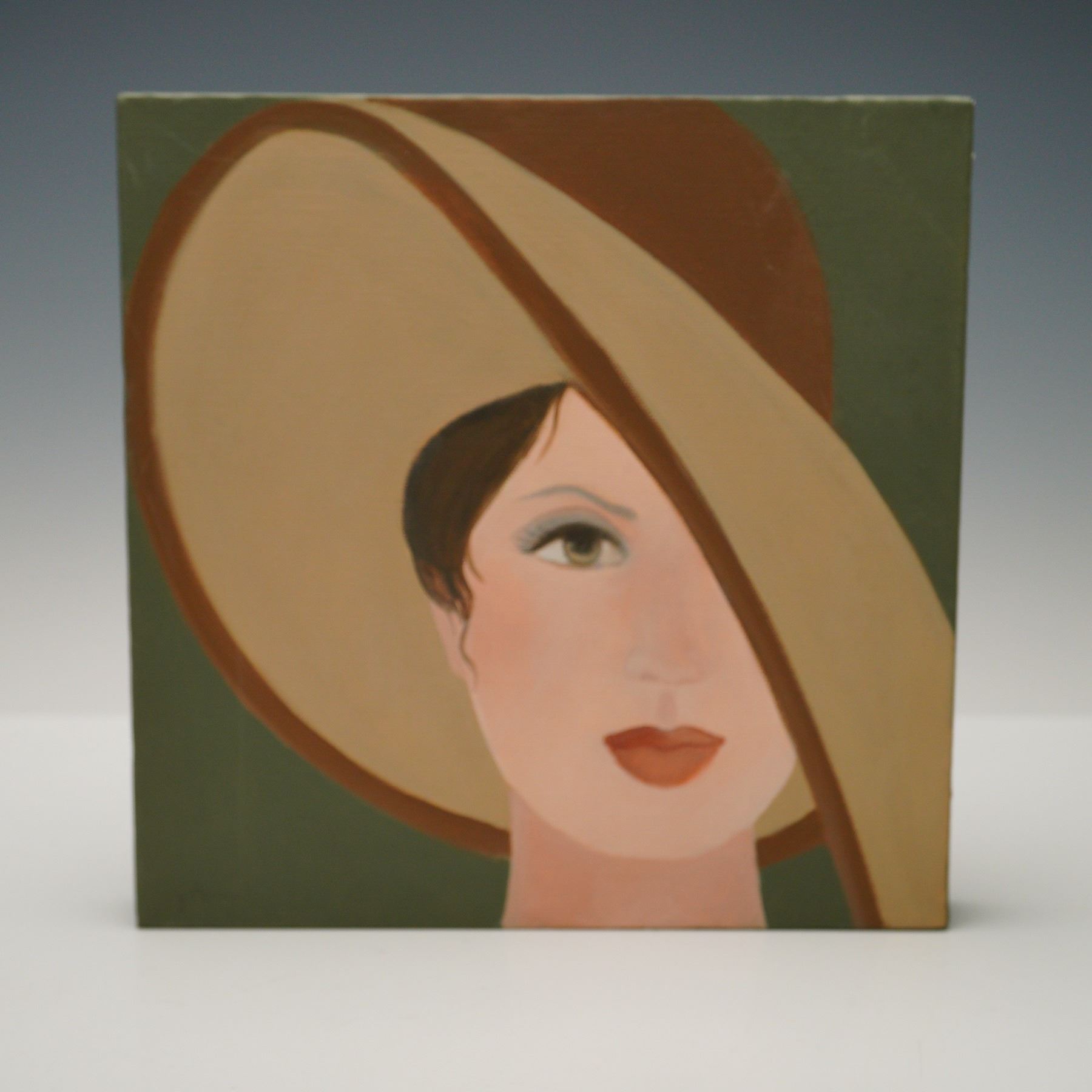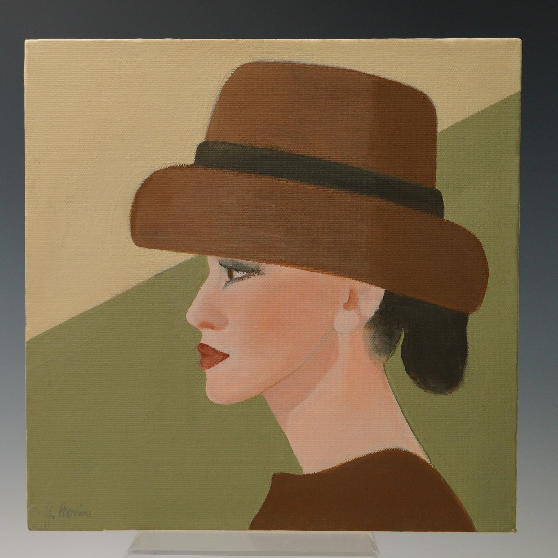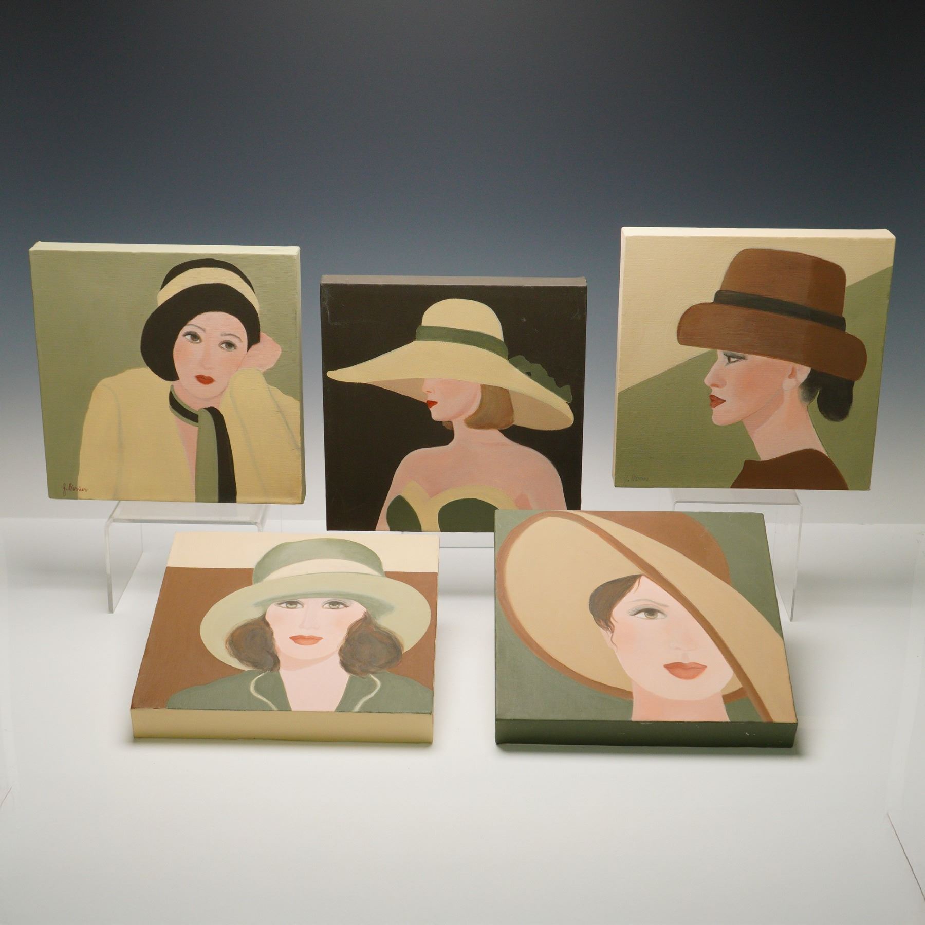 A stylish set of five modern acrylic-on-canvas portrait paintings, each portraying an elegantly dressed woman in a wide-brimmed hat. Executed in a bold, flat illustrative style with nods to Art Deco and mid-century fashion illustration. Muted green, ivory, and brown hues dominate this cohesive ensemble. Each work is signed J. Berriu, a decorative contemporary artist.