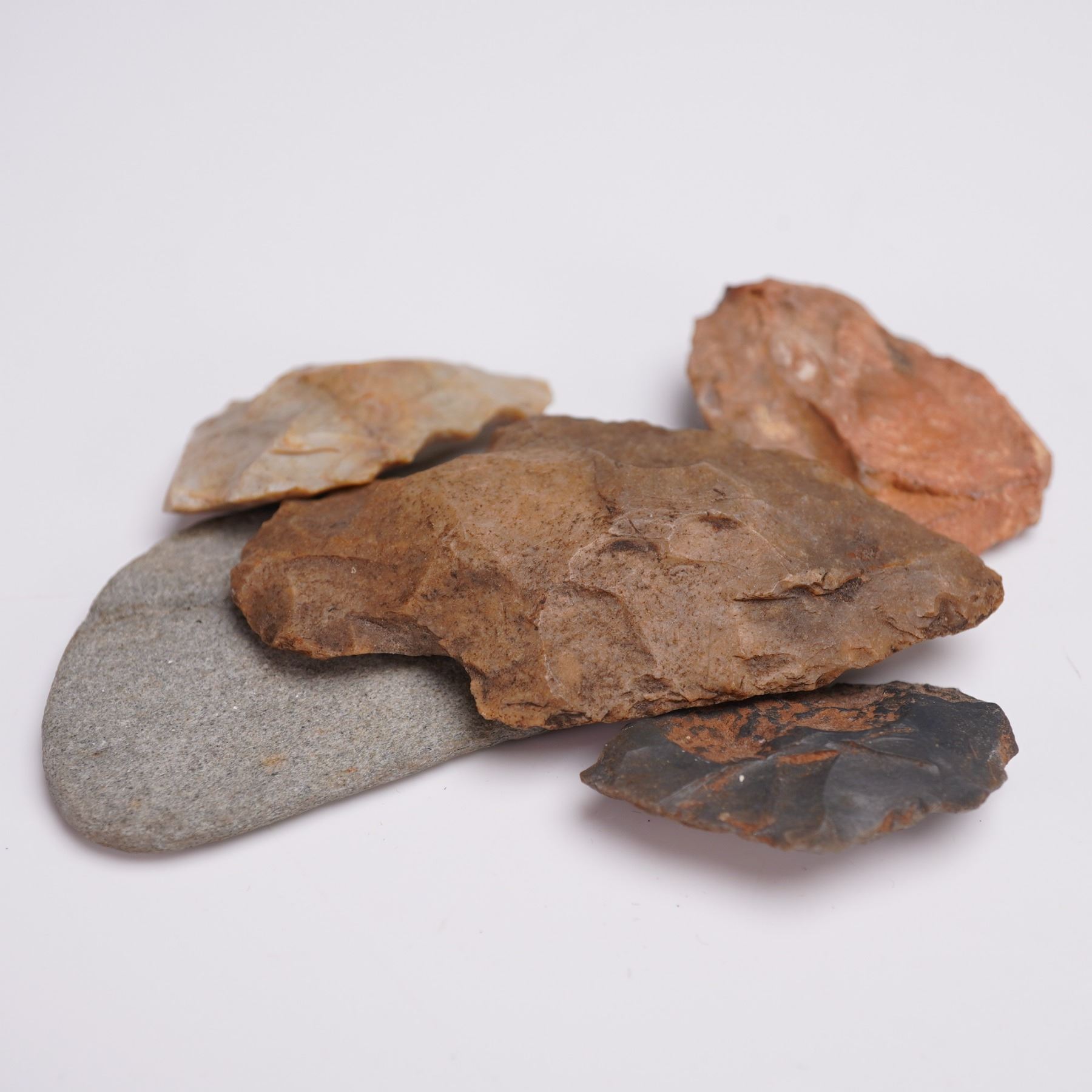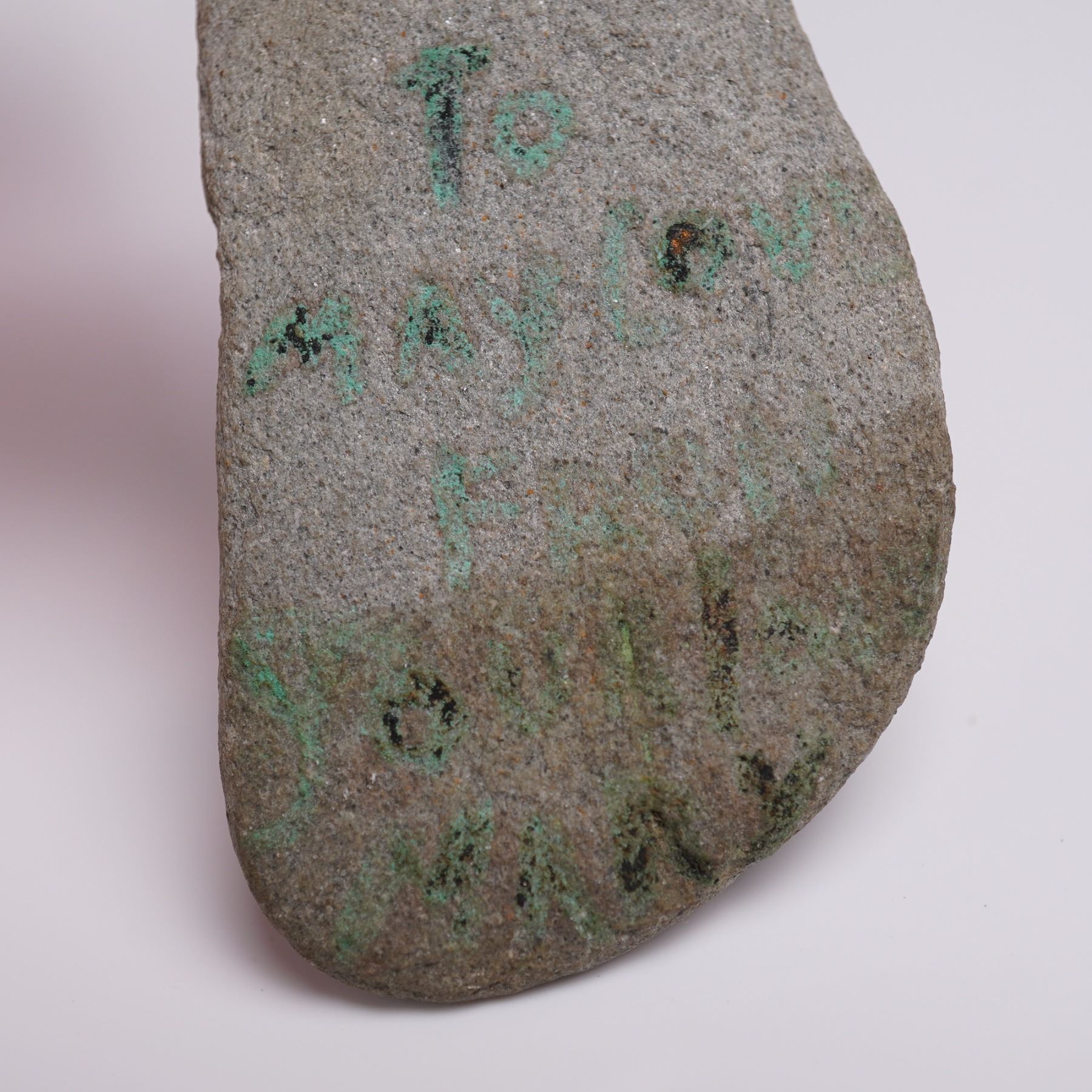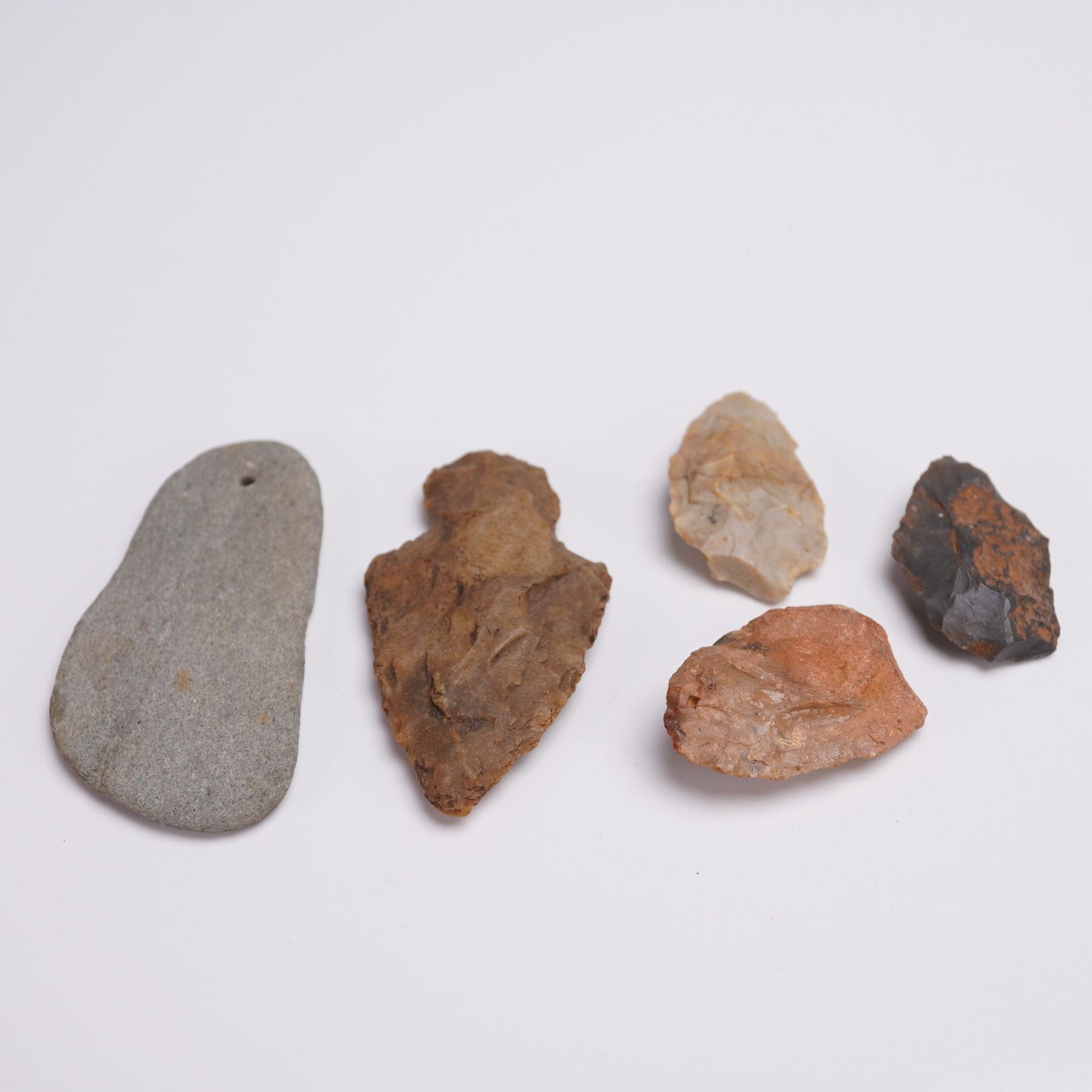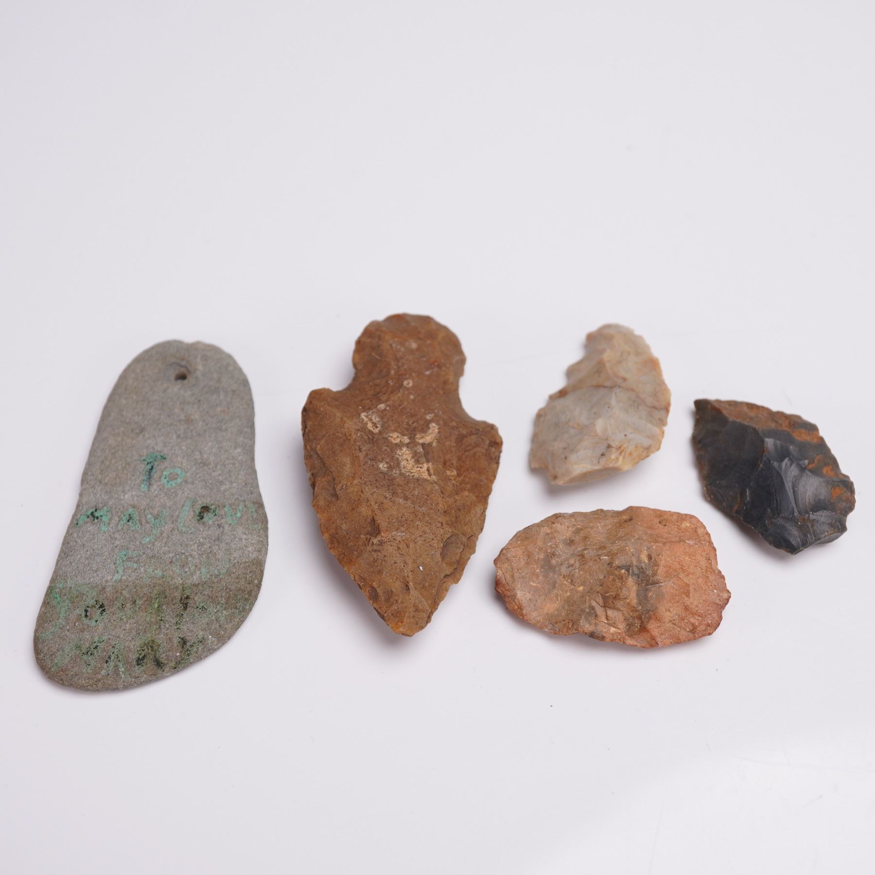 A remarkable and sentimental grouping, this lot features five hand-chipped Native American arrowheads of various chert and flint types, showcasing different regional styles and colors, alongside a unique pierced smooth river stone with a handwritten dedication. The arrowheads display ancient flaking techniques indicative of traditional toolmaking, with one particularly large and finely worked piece at the center. The inscribed stone, drilled at the top for suspension, adds an evocative human touch, possibly gifted as a token of affection or remembrance. Together, they present not only archaeological significance but also personal narrative, blending artistry and heritage.