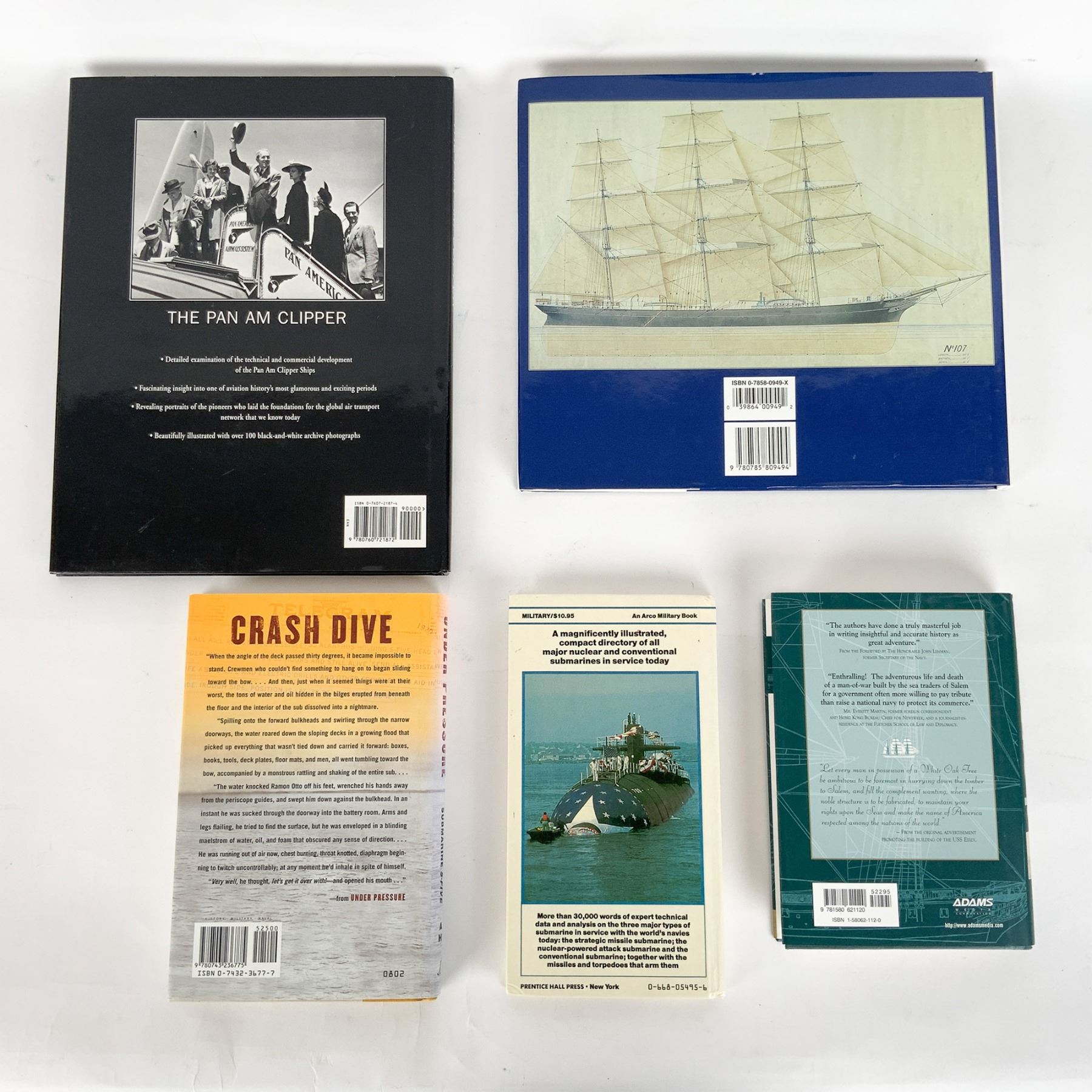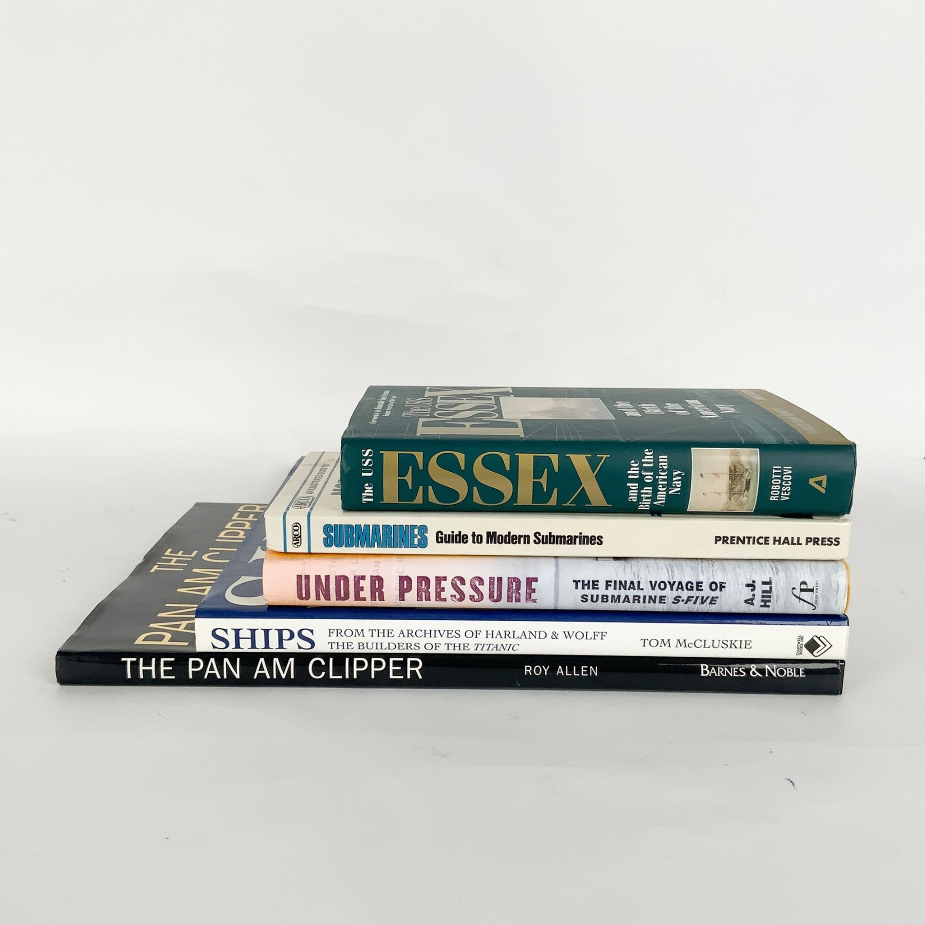 A curated collection of five hardcover books exploring naval and aviation history, including submarines, warships, and legendary aircraft. This set includes Submarines: Guide to Modern Submarines, a detailed reference on modern submarine technology published by Prentice Hall Press; The USS Essex and the Birth of the American Navy, a historical account of the famed warship and its influence on naval warfare; Under Pressure: The Final Voyage of Submarine S-Five by A.J. Hill, a gripping true story of a submarine disaster and survival; Ships: From the Archives of Harland & Wolff, the Builders of the Titanic by Tom McCluskie, a visually rich book documenting the legendary shipbuilders and their famous creations; and The Pan Am Clipper by Roy Allen, a comprehensive history of the iconic Pan American Clippers, published by Barnes & Noble. Each book presents detailed research, historical photographs, and insights into maritime and aviation history. Largest book measures 12"H.