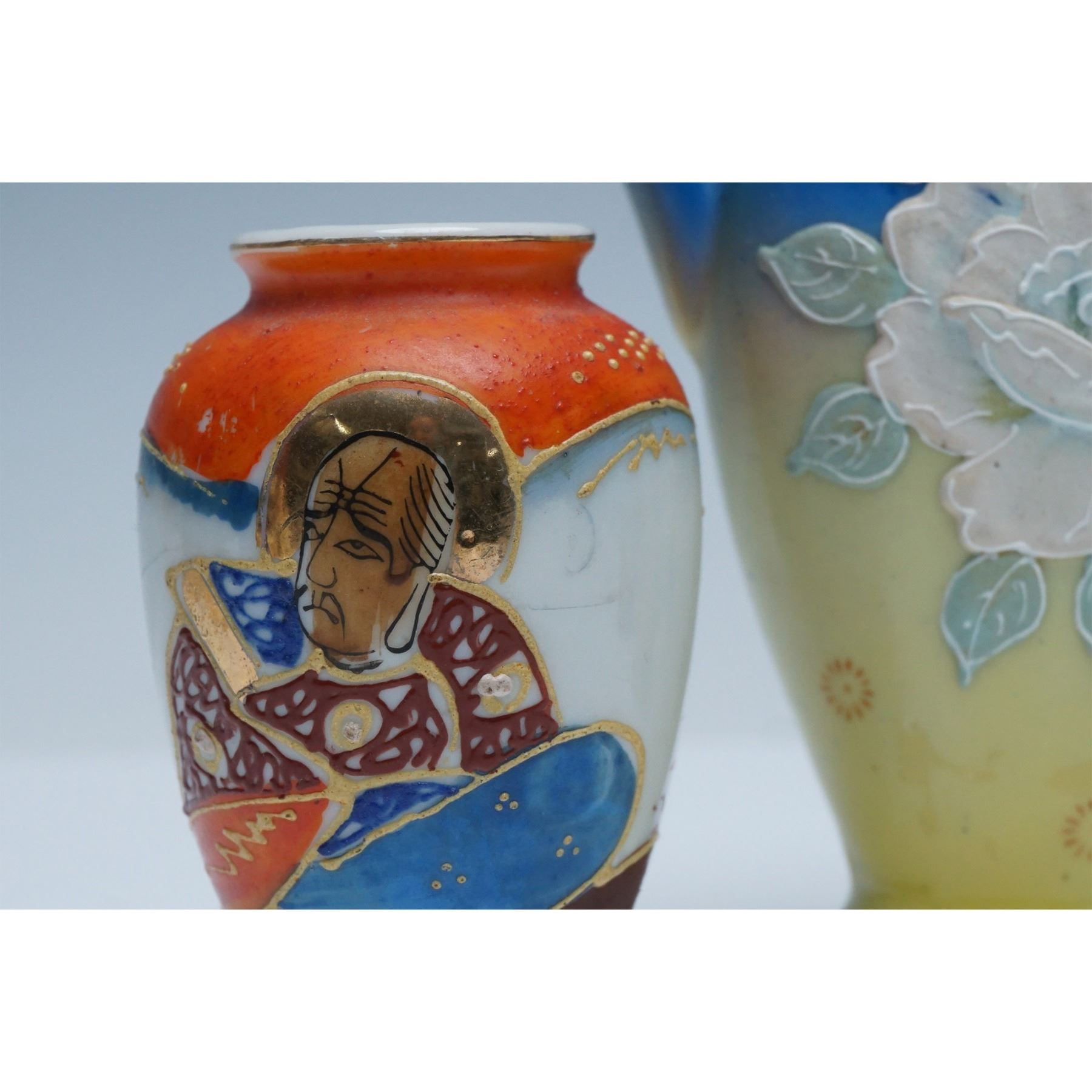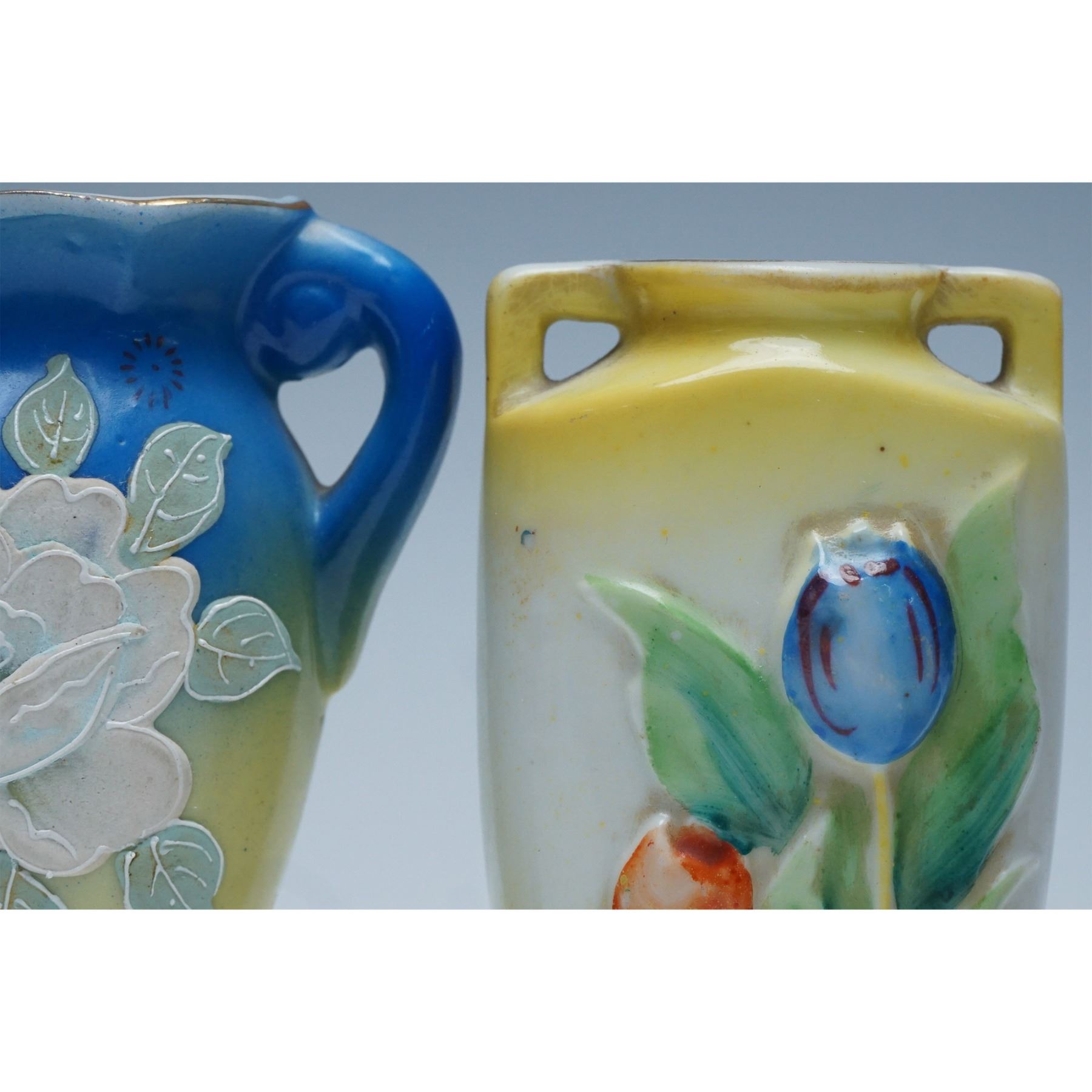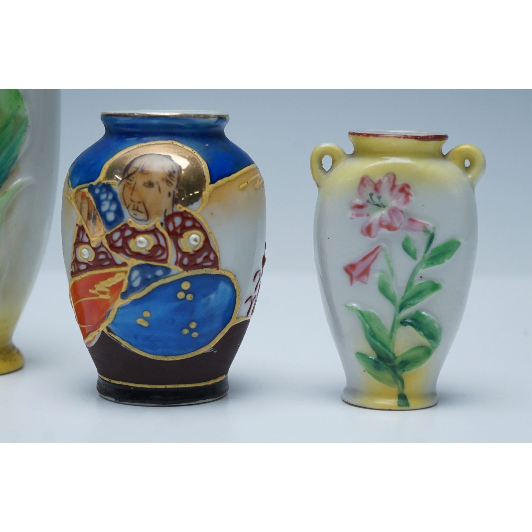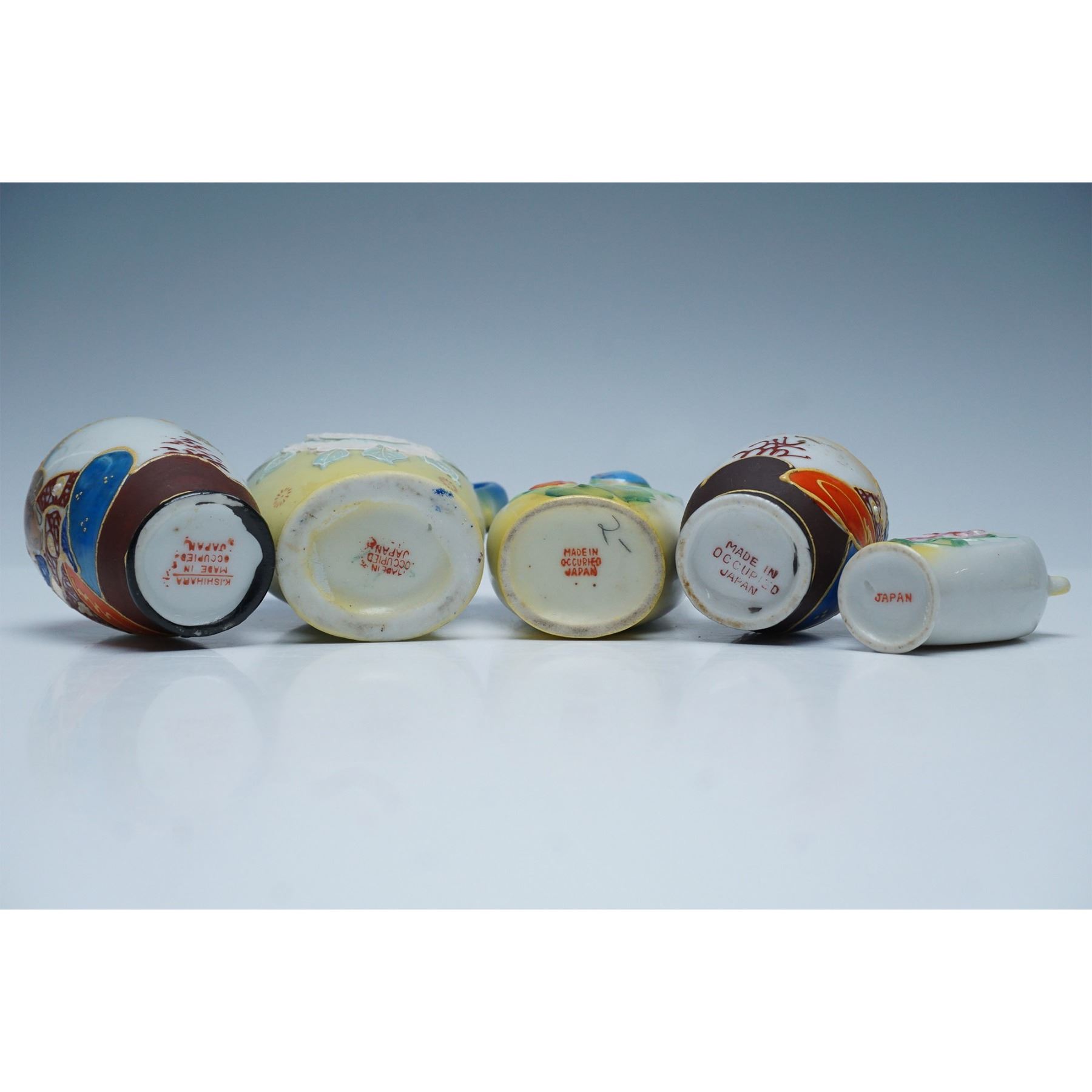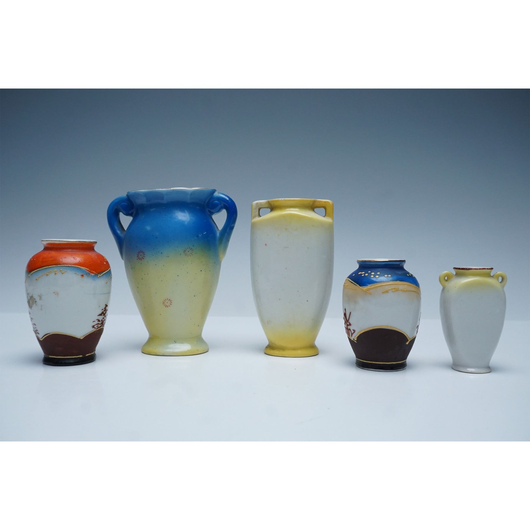 A set of five vintage hand-painted porcelain vases, including three marked "Made in Occupied Japan" and two marked "Japan." This collection showcases a mix of floral and figural designs, reflecting the artistry of mid-century Japanese ceramics. The set includes two Satsuma-style vases with raised moriage detailing, depicting traditional Japanese figures in vibrant colors. A twin-handled blue and yellow vase features a delicate raised floral motif, while a tulip-adorned vase presents an Art Deco-inspired rectangular form. Completing the collection is a small floral vase with petite loop handles, finished in soft pastel hues. These vases highlight the variety of styles produced in Japan post-WWII, making them an excellent addition for collectors of Japanese ceramics. Vases measure 2.5" to 4.25"H.