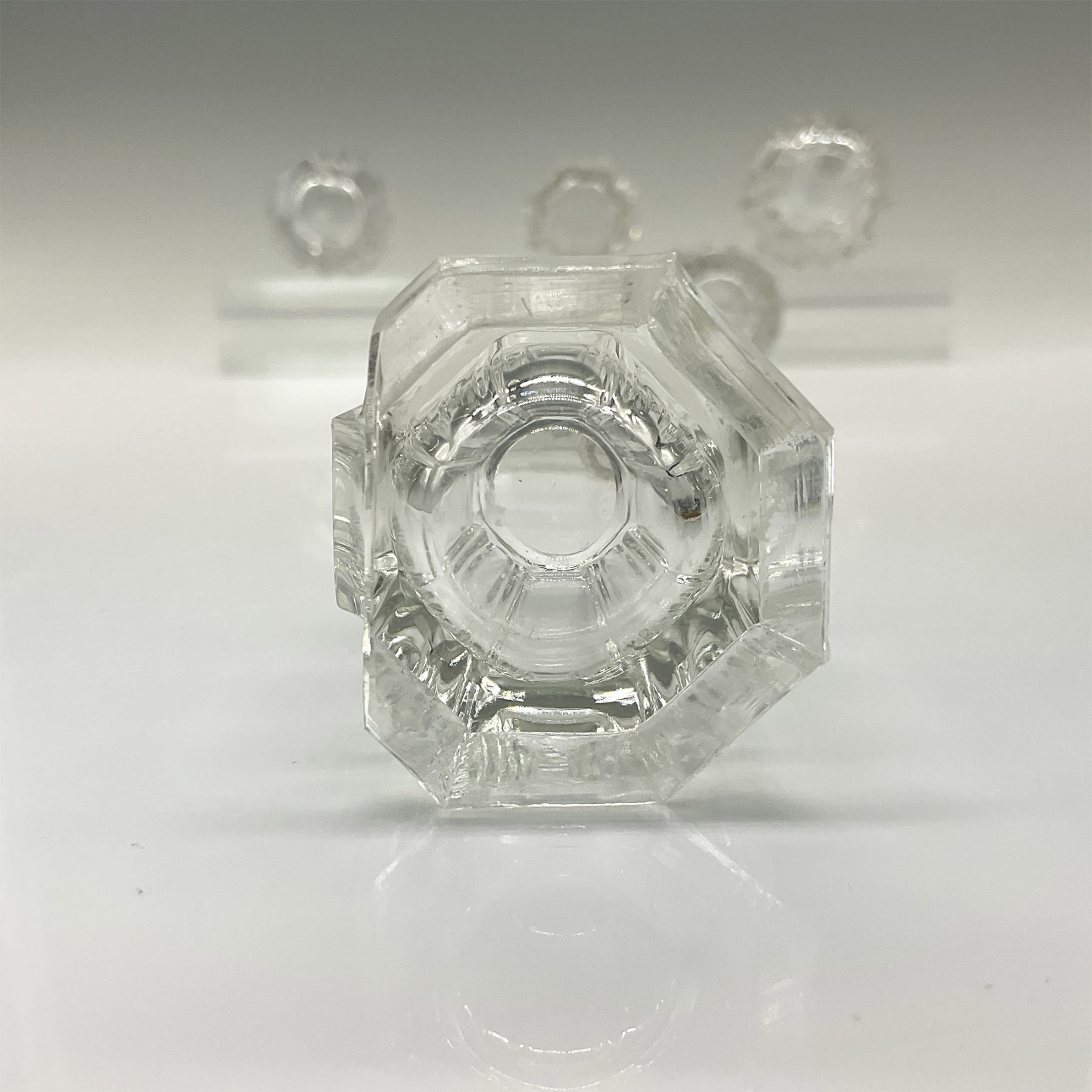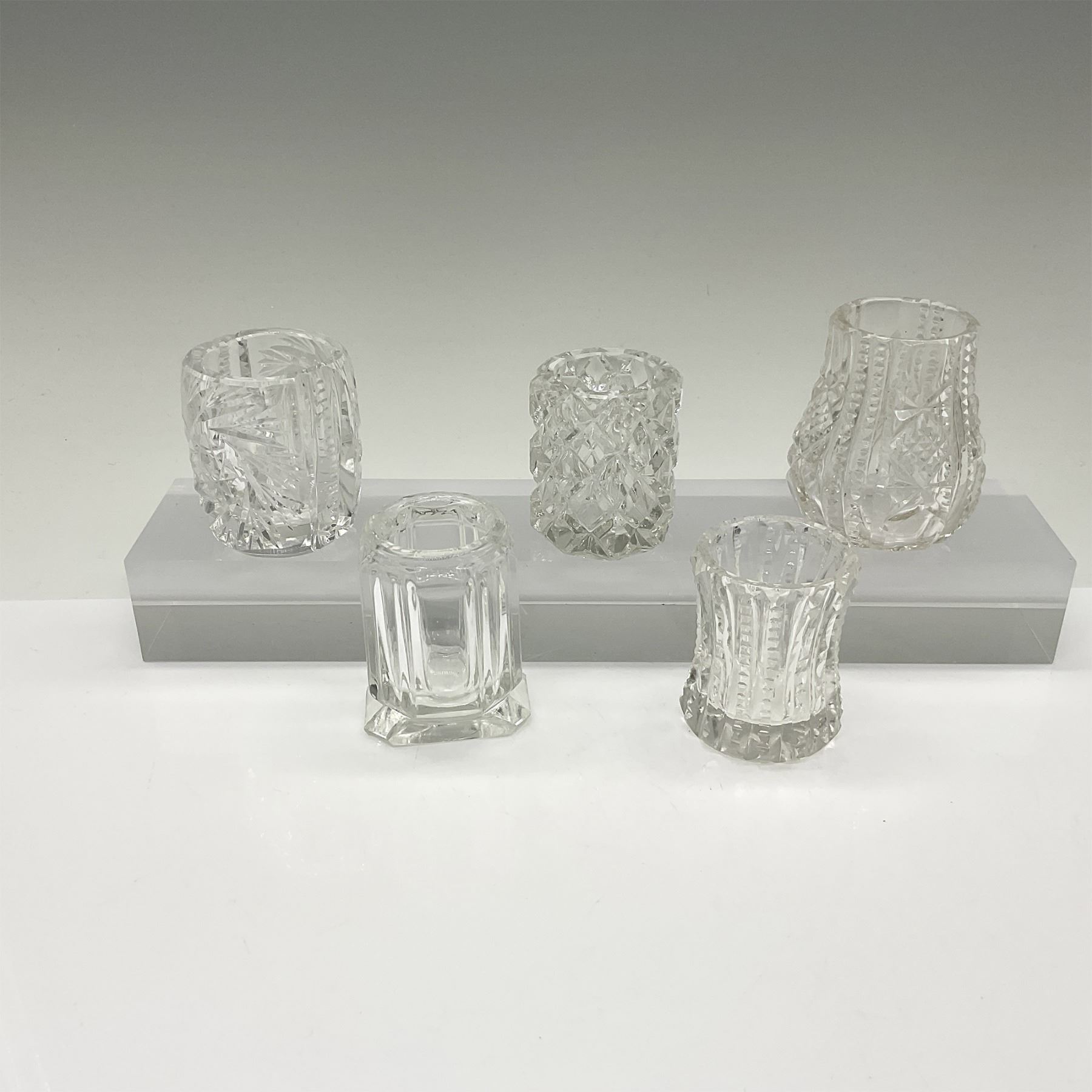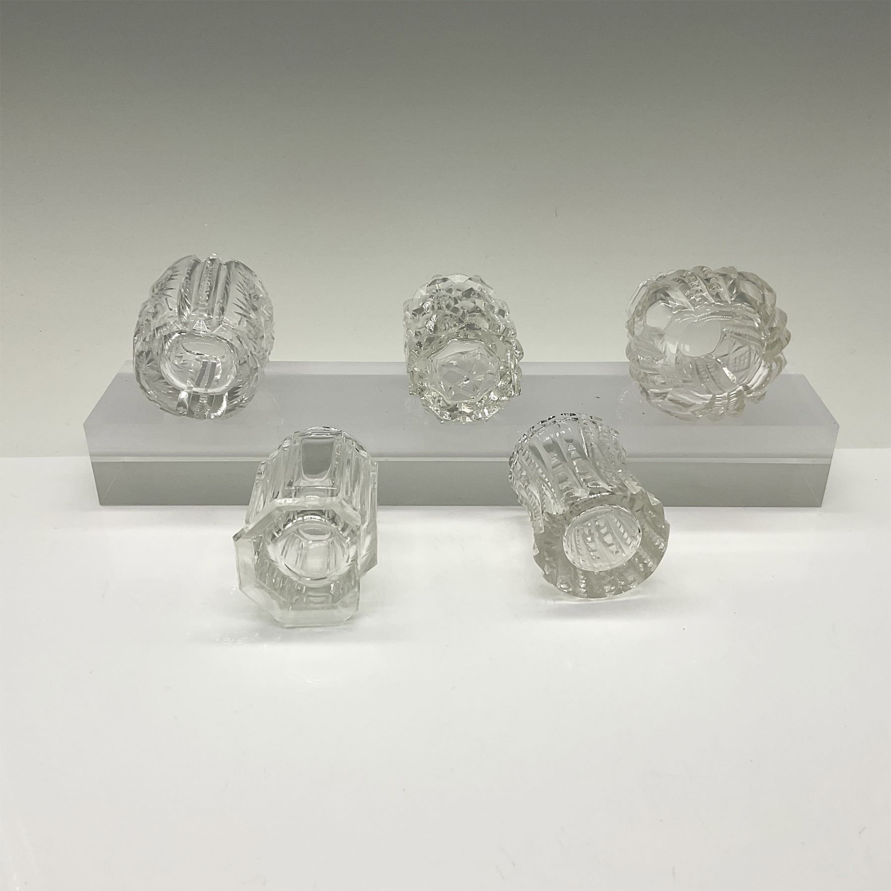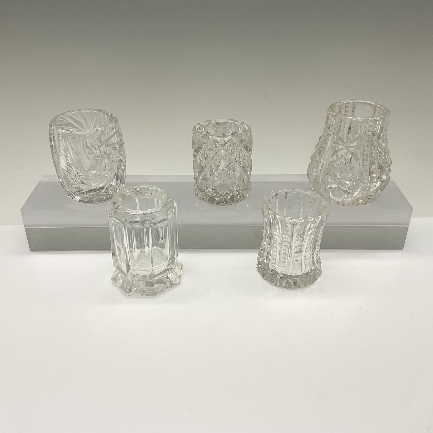This collection of small holders features intricate patterns, including buzz saws, dots, columns, crosshatching, and more. The largest piece measures approximately 2.25"H x and just over 2.25" dia.