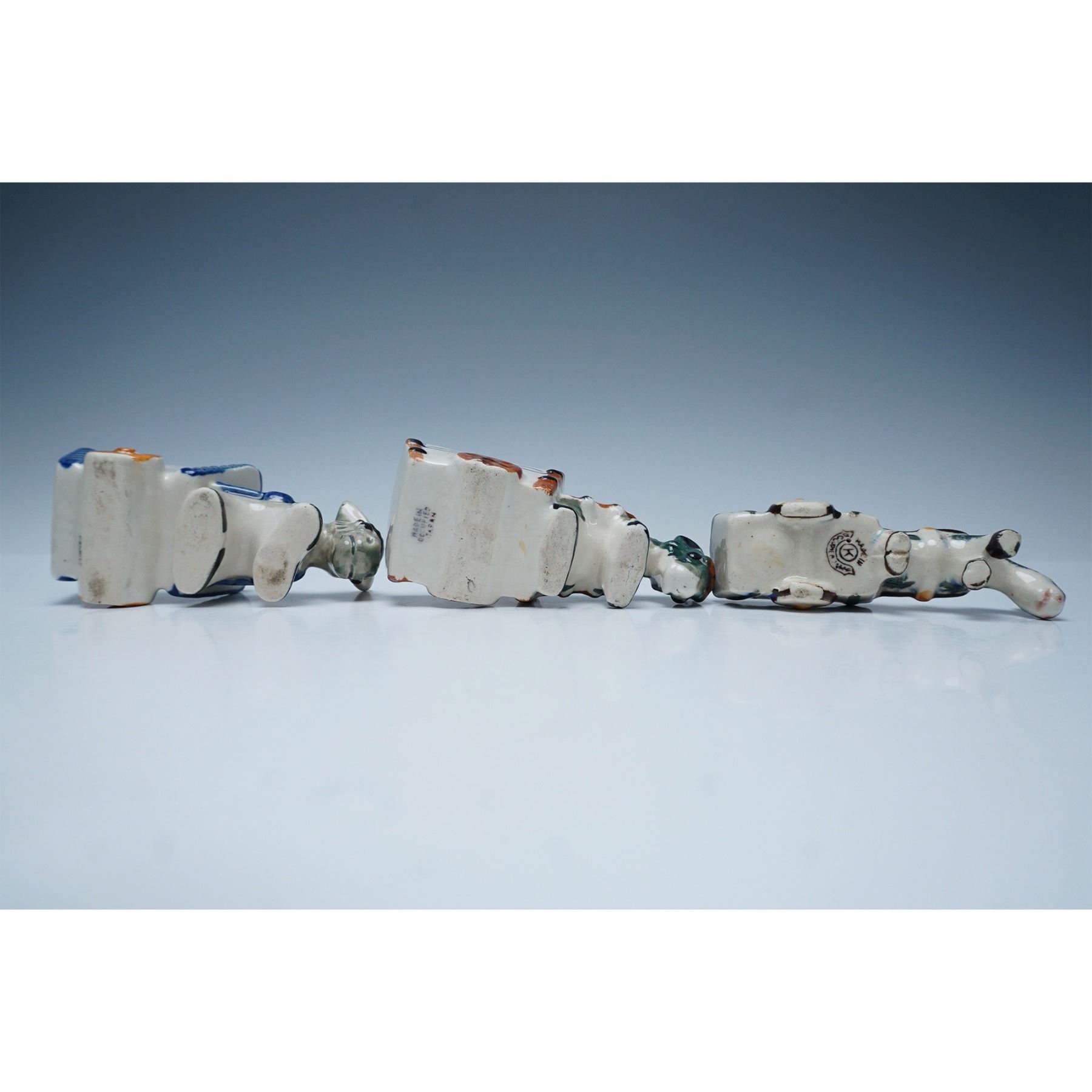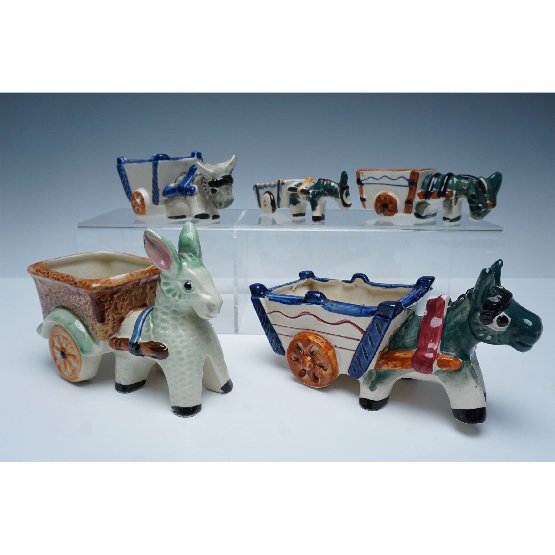 A delightful collection of five vintage Made in Occupied Japan porcelain donkey cart planters, each featuring hand-painted details and a charming folk-art aesthetic. The donkeys are adorned with colorful harnesses, pulling intricately designed carts with textured and painted accents. The variations in color and style highlight the individuality of each piece. Largest item measures 4.5"H.