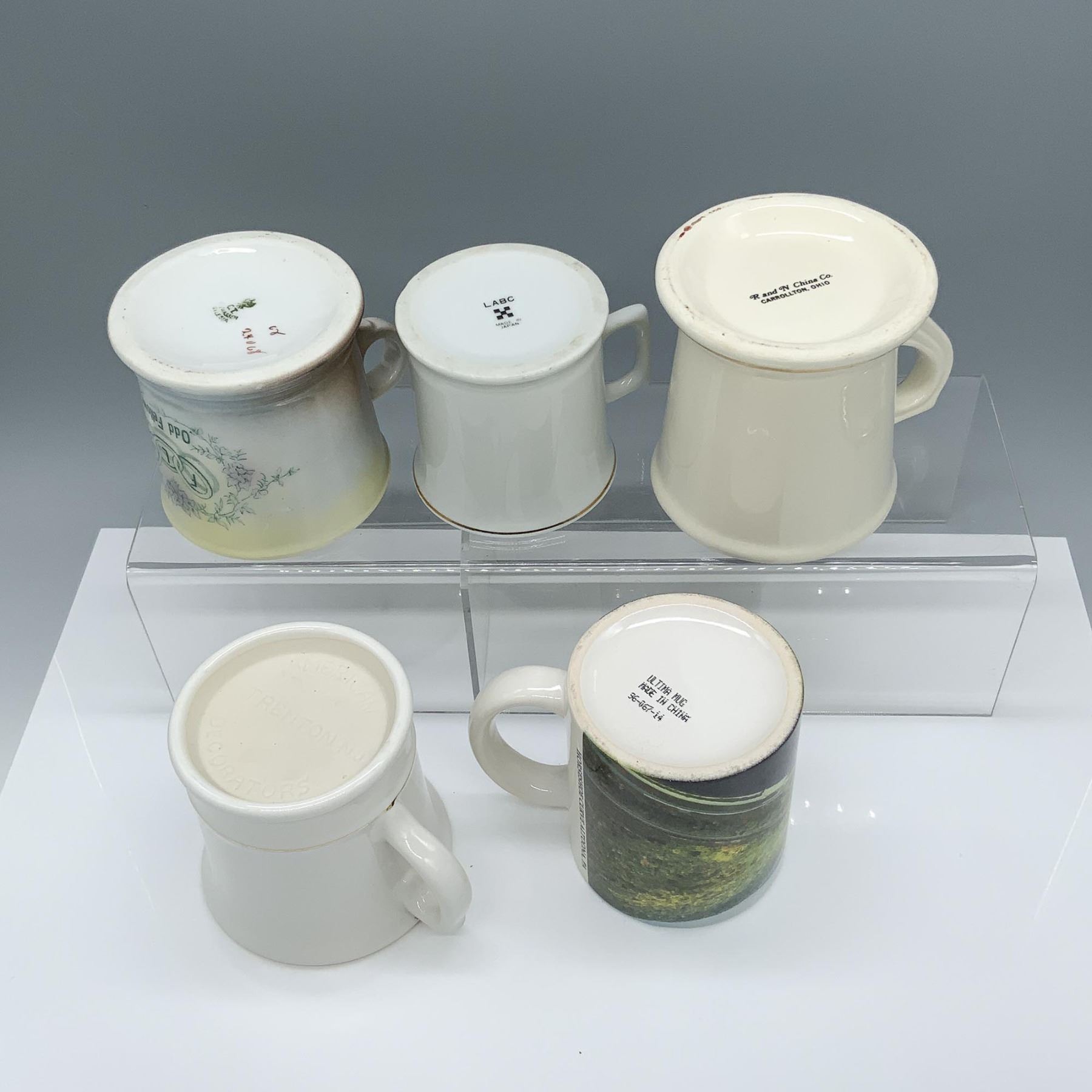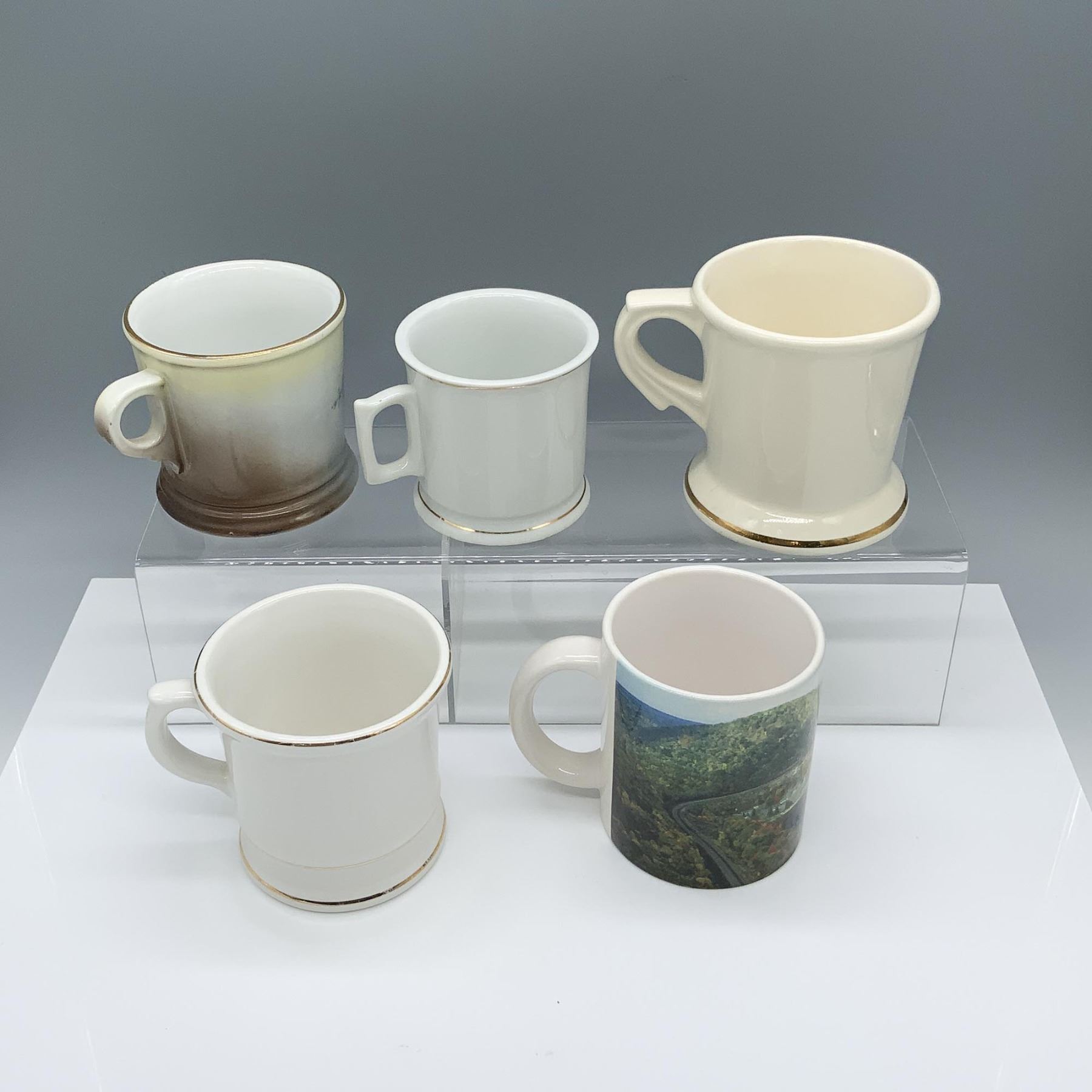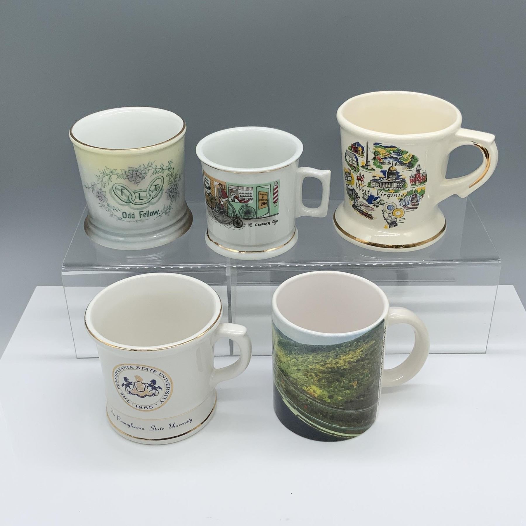 Dashing variety of mugs that include: a horseshoe curve cup, a PSU cup, a West Virginia souvenir cup, a small barbershop decorated cup, and a shaving mug that reads Odd Fellow. Largest item measures 5"L x 3.75"W x 4"H.
