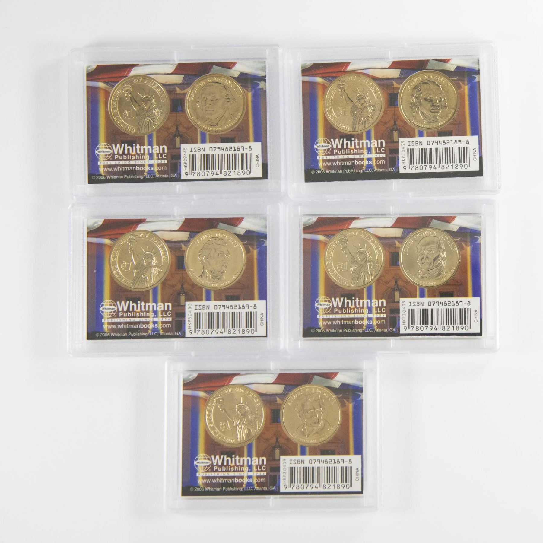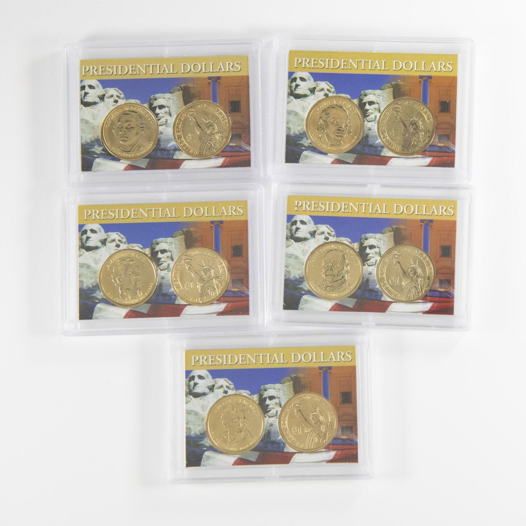 A collection of 10 coins, two in each Slabbed Whitman Publishing. The collection includes First President George Washington; Fourth President James Madison; Fifth President James Monroe; Sixth President John Quincy Adams; and Seventh President Andrew Jackson. Each coin depicts the portrait of the president on the obverse side, and the Statue of Liberty on the reverse side. Each coin is in a protective case. A case is approximately: 3.5"L x 0.25"W x 2.5"H.
