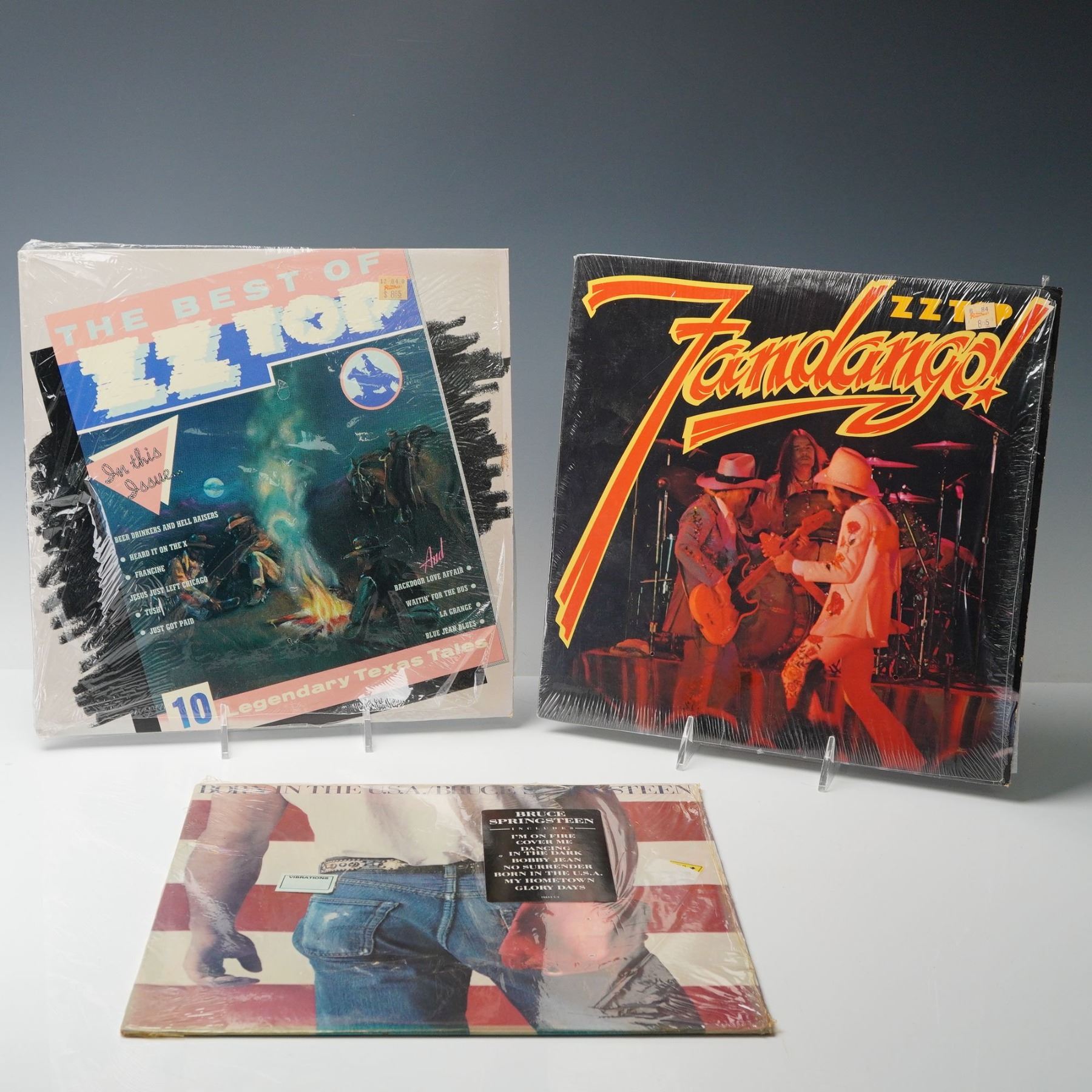 This collection includes five iconic vinyl records: Land of the Midnight Sun by Al Di Meola, Live at Leeds by The Who, Fandango! by ZZ Top, The Best of ZZ Top, and Born in the USA by Bruce Springsteen. A diverse set of legendary rock, jazz fusion, and live performance albums from some of the biggest names in music. All records come in their original covers.