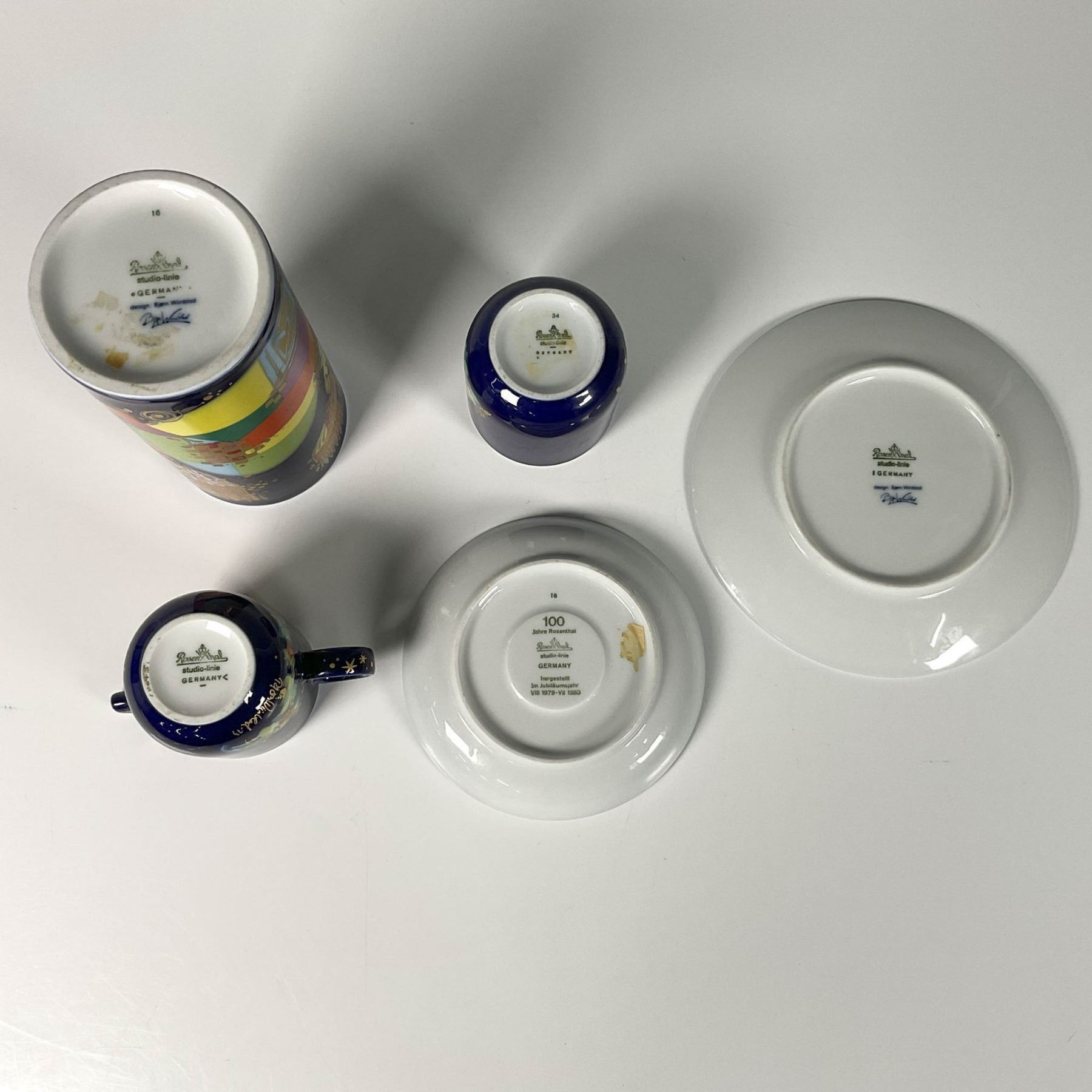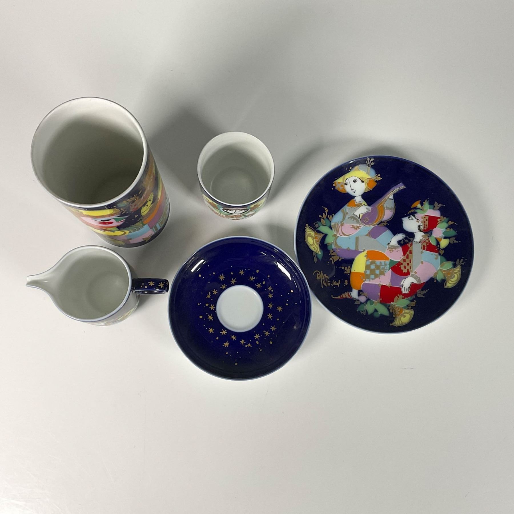 Vintage blue porcelain set by Danish artist Bjorn Wiinblad, featuring scenes inspired by the Arabian Nights. The set includes a creamer, water cup, a teacup, saucer and plate. Rosenthal marks and the artist printed signatures. Creamer: 4"L x 2.25"W x 2.75"H. Water cup: 2.75"W x 5.75"H. Teacup: 2.25"W x 2.5"H. Saucer: 4.5"W x 1"H. Plate: 6"W x 1"H.