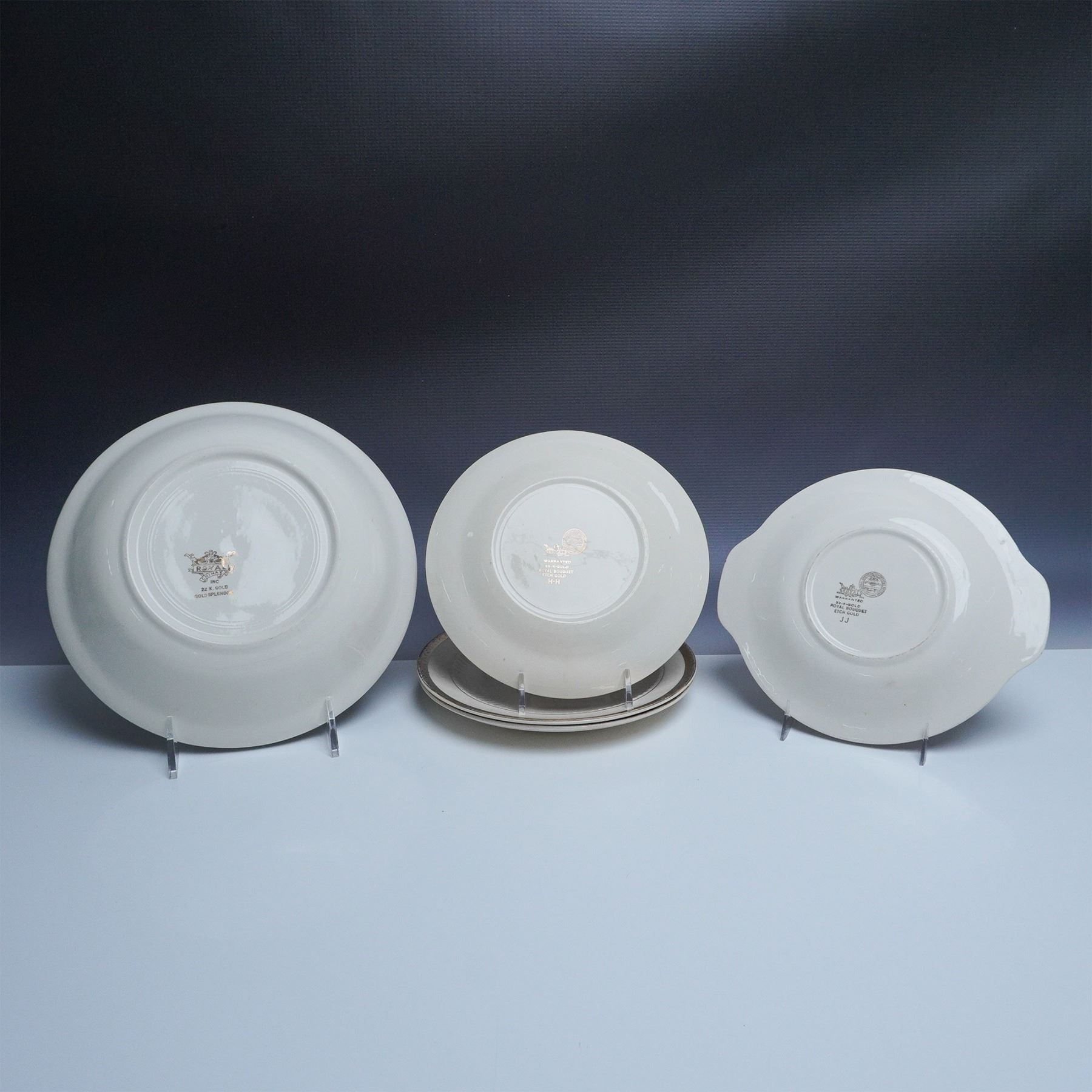 5pc Royal China porcelain dishware set featuring two distinct patterns: Royal Bouquet Etch Gold and Gold Splendor. Each piece is adorned with a delicate floral motif in warm tones of yellow, orange, and red, accented by 22K gold trim. The set includes one serving bowl 2"H x 9"Dia and four plates with varying decorative details. The backstamps indicate the authenticity of the Royal China brand, a well-known American pottery company. These vintage pieces showcase fine craftsmanship and elegant detailing, making them a beautiful addition to any collection or dining display.