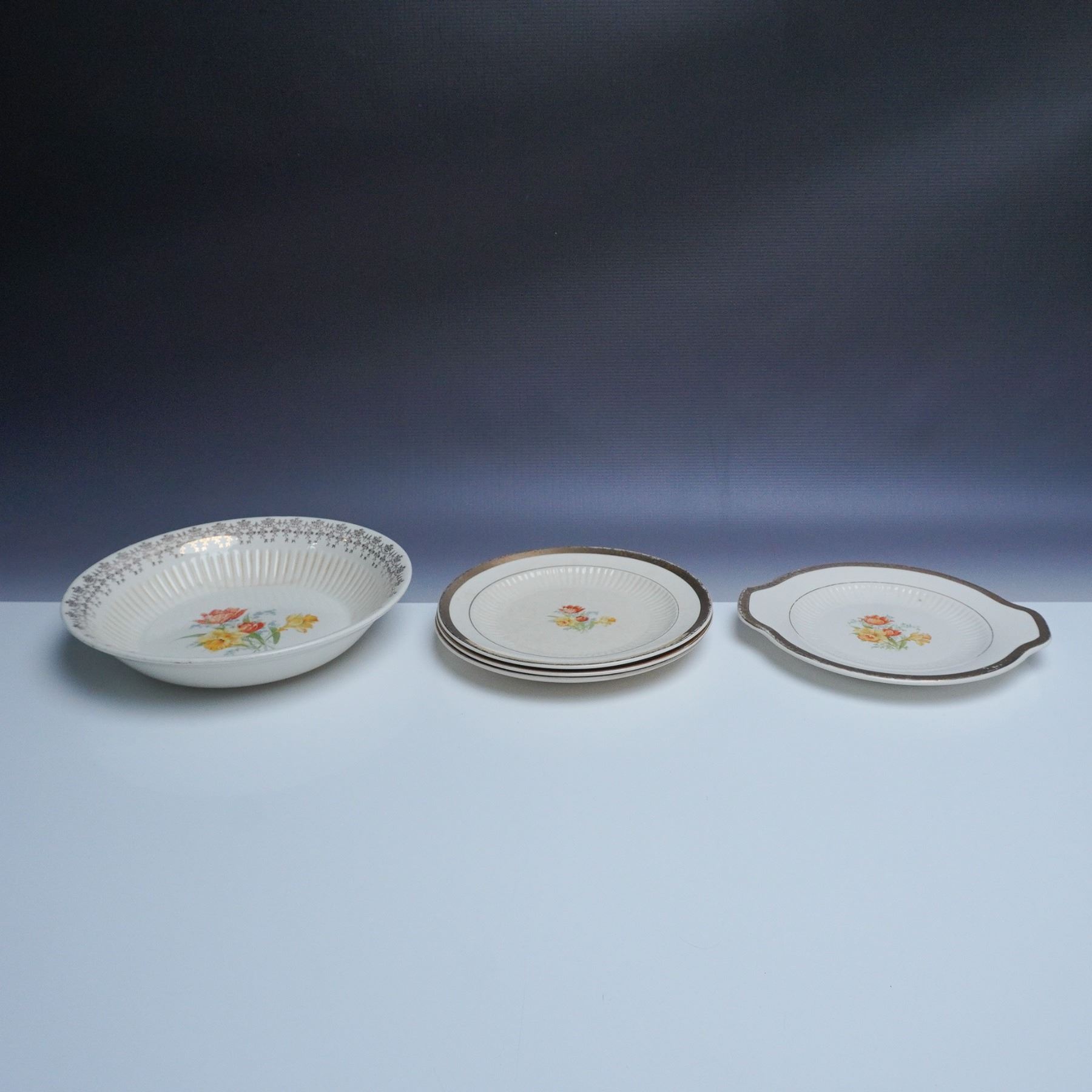 5pc Royal China porcelain dishware set featuring two distinct patterns: Royal Bouquet Etch Gold and Gold Splendor. Each piece is adorned with a delicate floral motif in warm tones of yellow, orange, and red, accented by 22K gold trim. The set includes one serving bowl 2"H x 9"Dia and four plates with varying decorative details. The backstamps indicate the authenticity of the Royal China brand, a well-known American pottery company. These vintage pieces showcase fine craftsmanship and elegant detailing, making them a beautiful addition to any collection or dining display.
