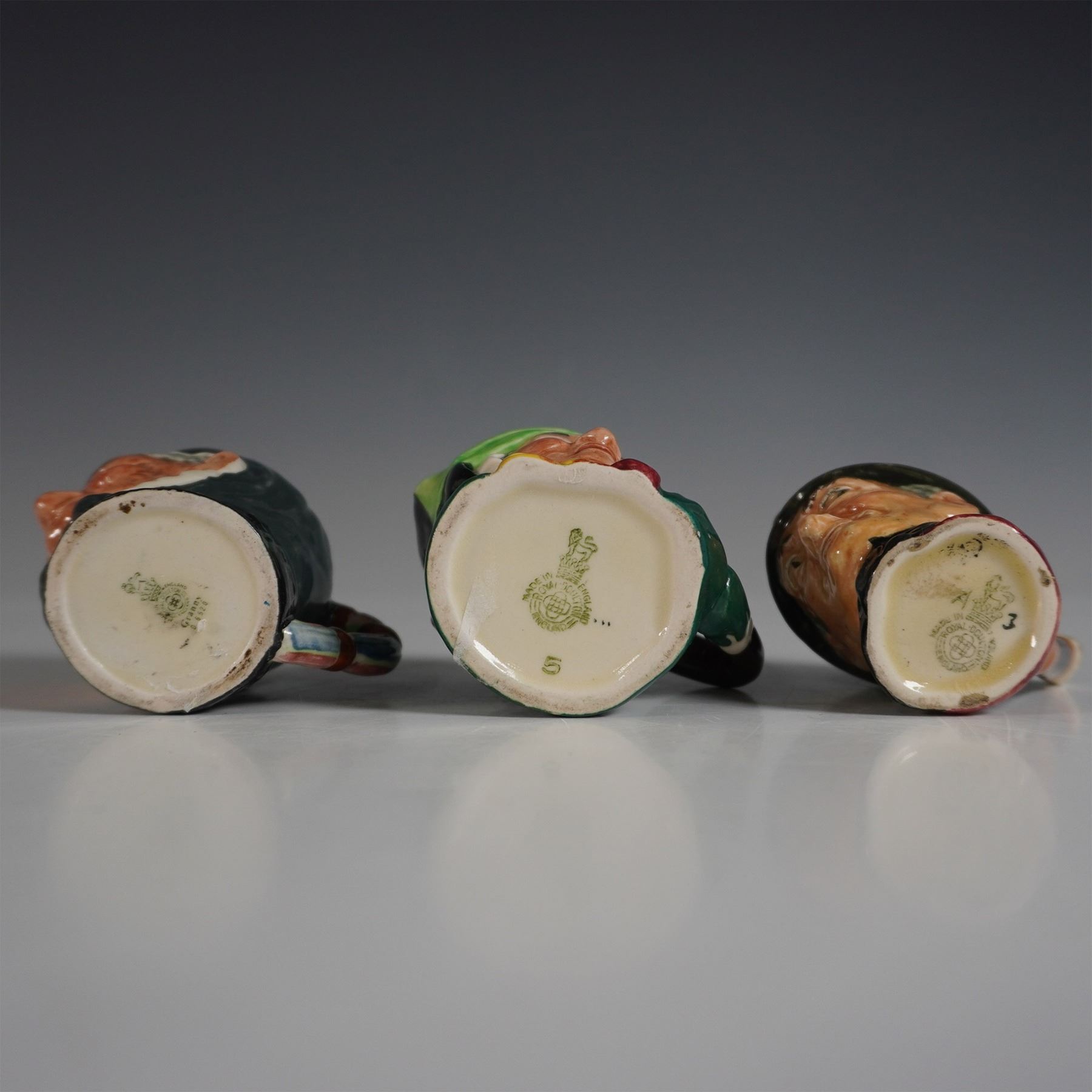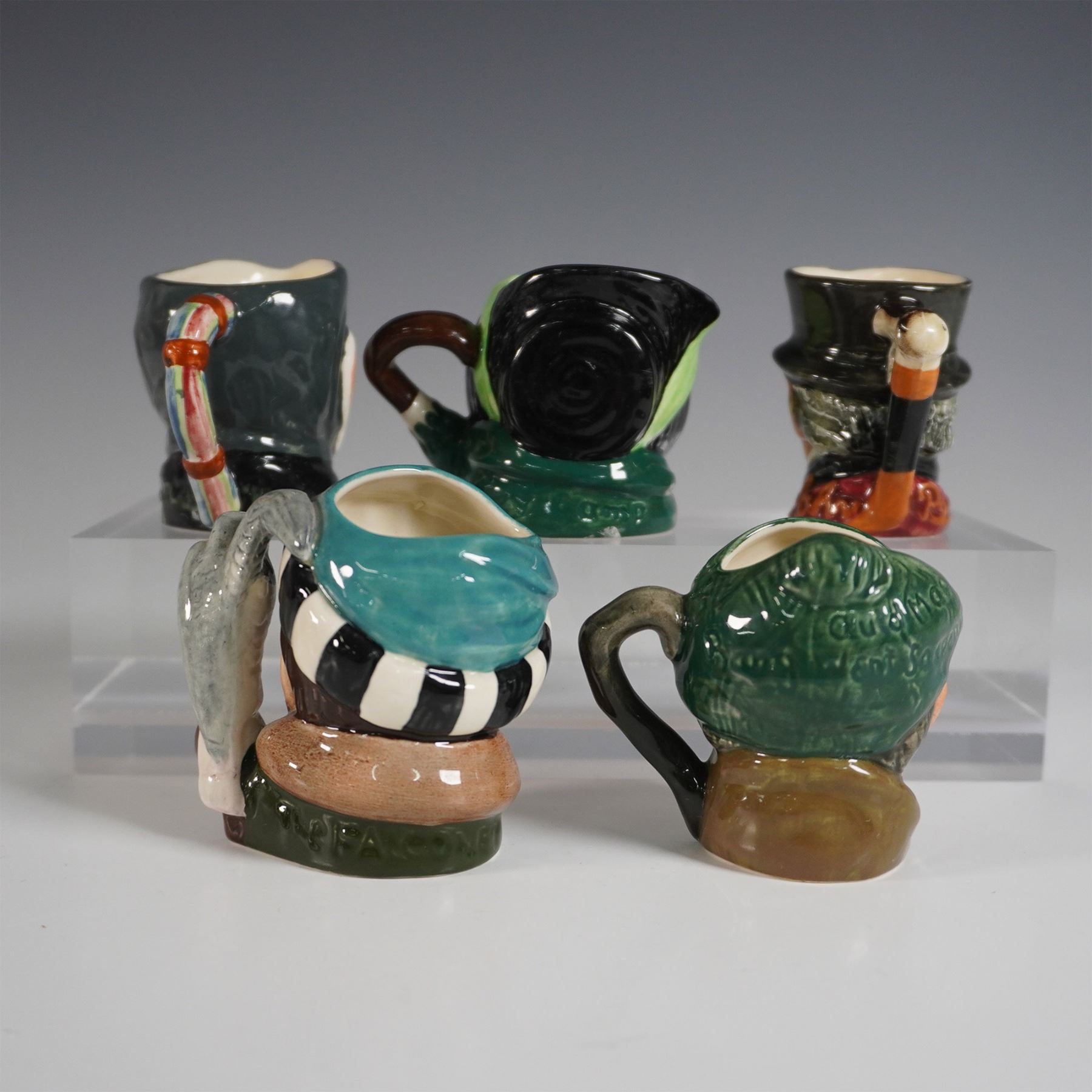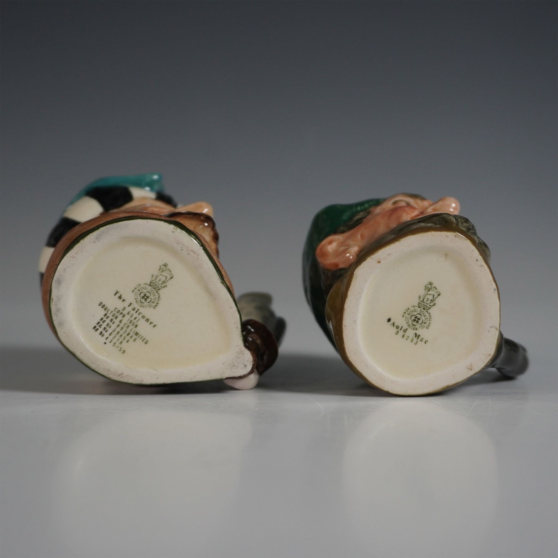 A charming collection of five Royal Doulton character jugs, featuring detailed depictions of beloved figures. This set includes Granny, Auld Mac, The Falconer, and two additional character jugs, each showcasing Royal Doulton’s signature hand-painted craftsmanship and intricate detailing. The Falconer is notable for its sculpted falcon perched on the handle, while Auld Mac and Granny capture the essence of traditional British figures. The bases bear the Royal Doulton backstamp, ensuring authenticity. The largest jug measures approximately 2.75"H.