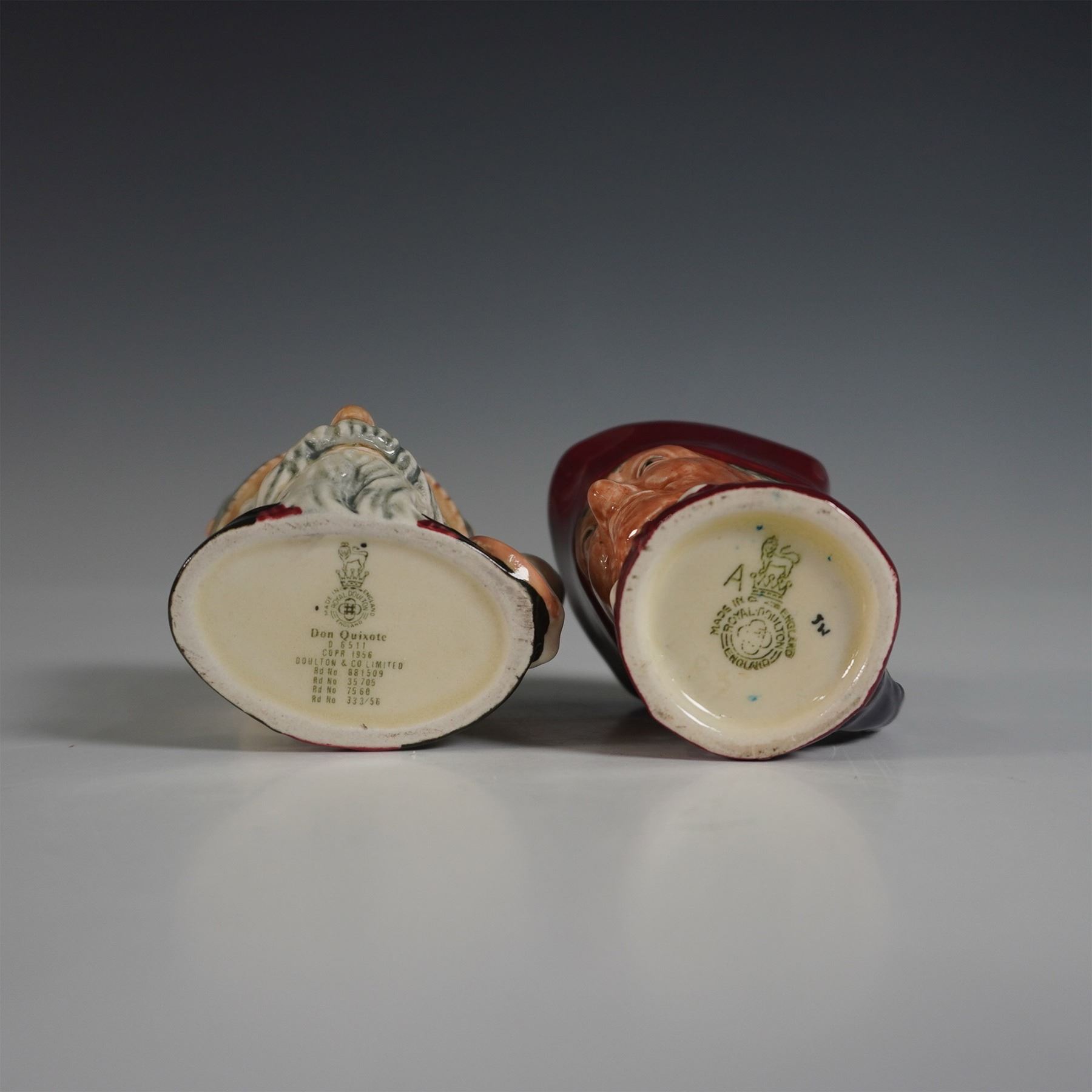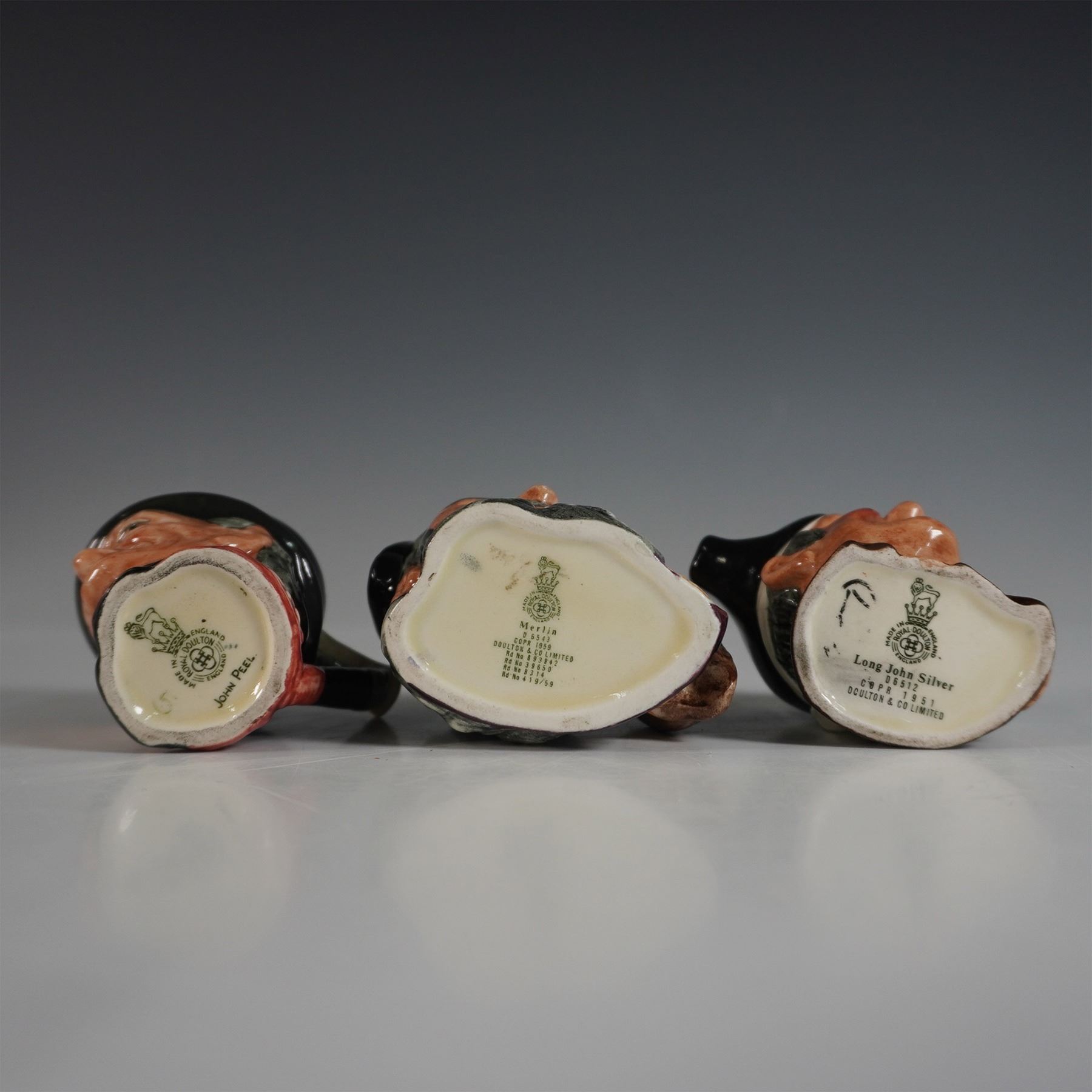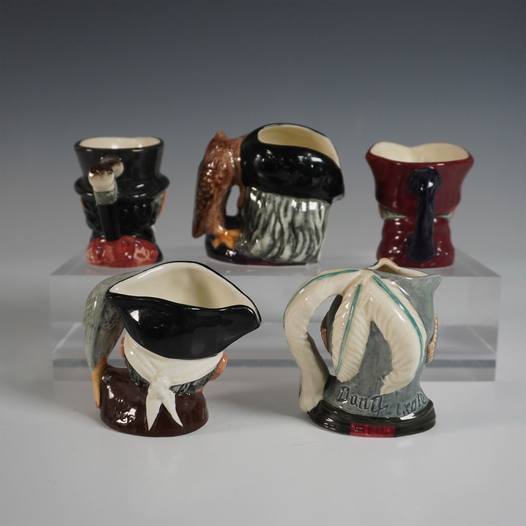 A collection of five Royal Doulton character jugs, each featuring masterfully sculpted and hand-painted depictions of notable historical and fictional figures. This grouping includes Don Quixote (D6511), Long John Silver (D6512), Merlin (D6543), John Peel and Cardinal. Each jug showcases exquisite detailing, expressive facial features, and intricate themed handles. The bases bear the Royal Doulton backstamp and respective model numbers, ensuring authenticity. The largest jug measures approximately 2.5"H.