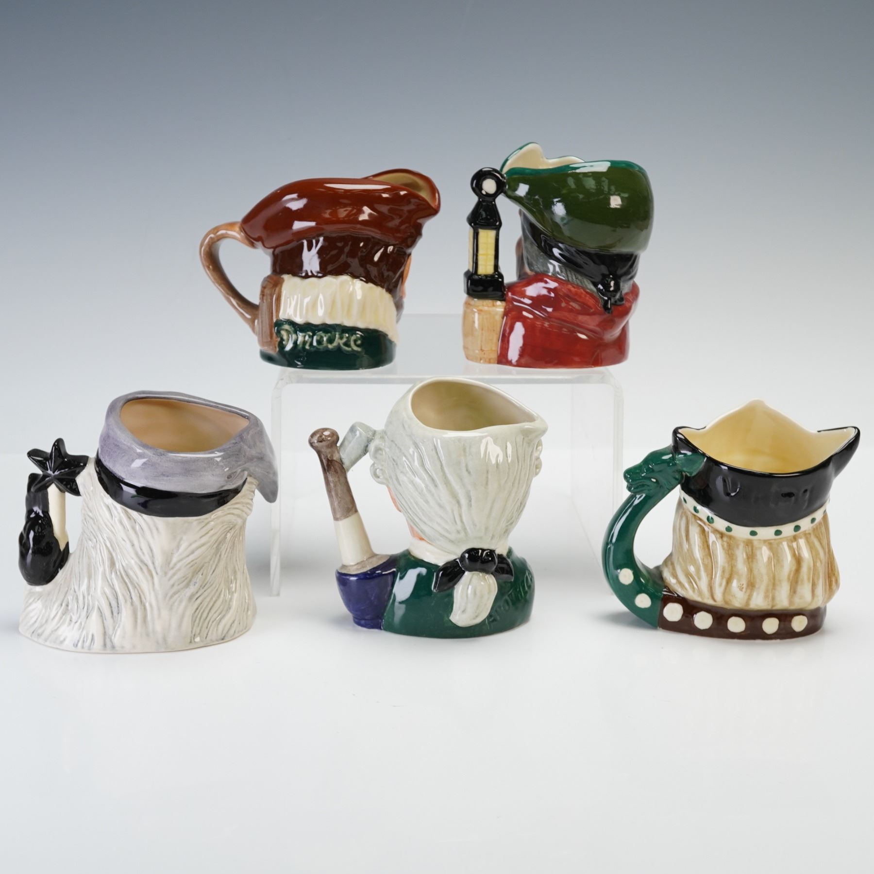A collection of five Royal Doulton small character jugs including The Smuggler, The Wizard, The Apothecary, Viking, and Drake. Each finely hand-painted with distinctive detailing and expressive features, representing some of Royal Doulton's most iconic designs. All with Royal Doulton backstamps to base.