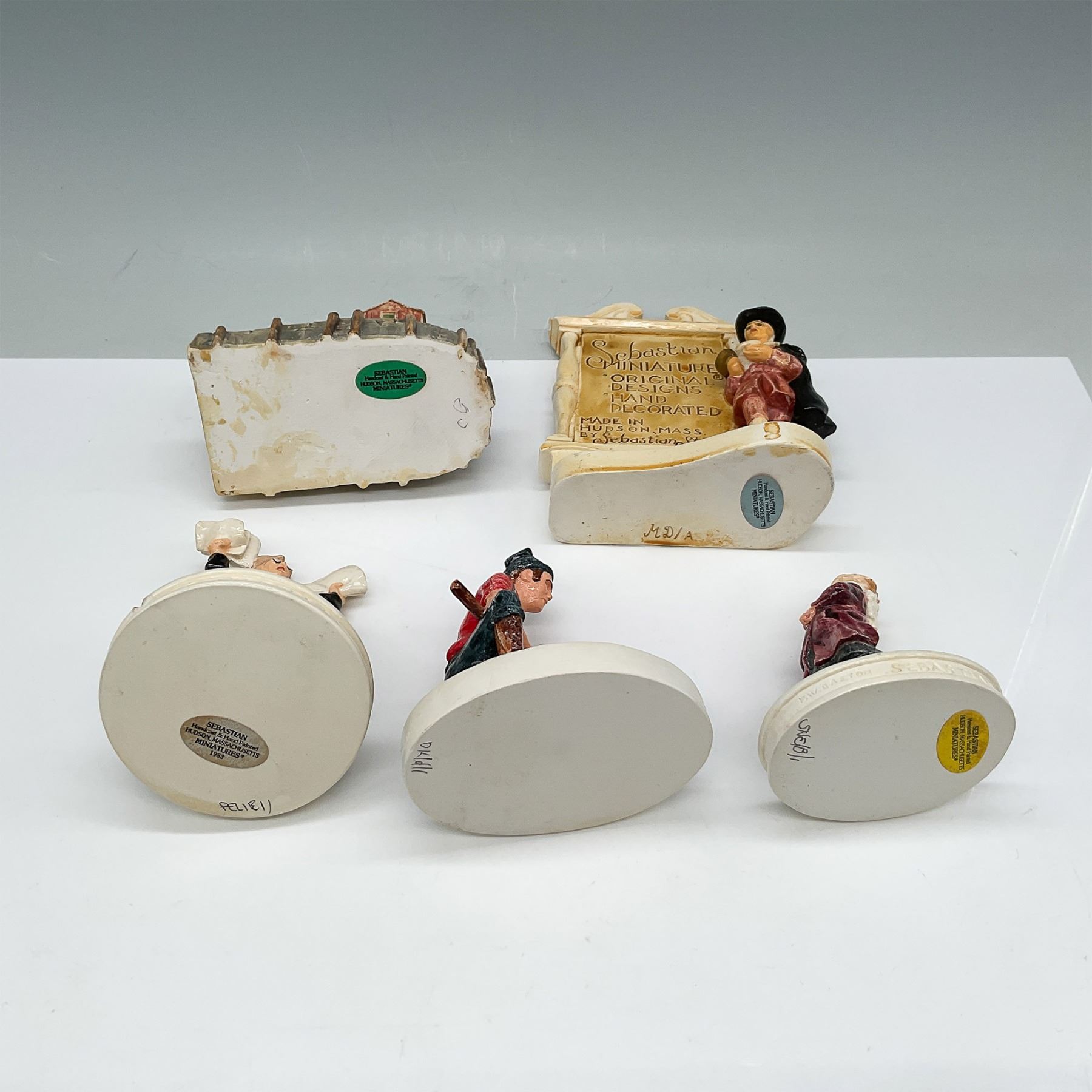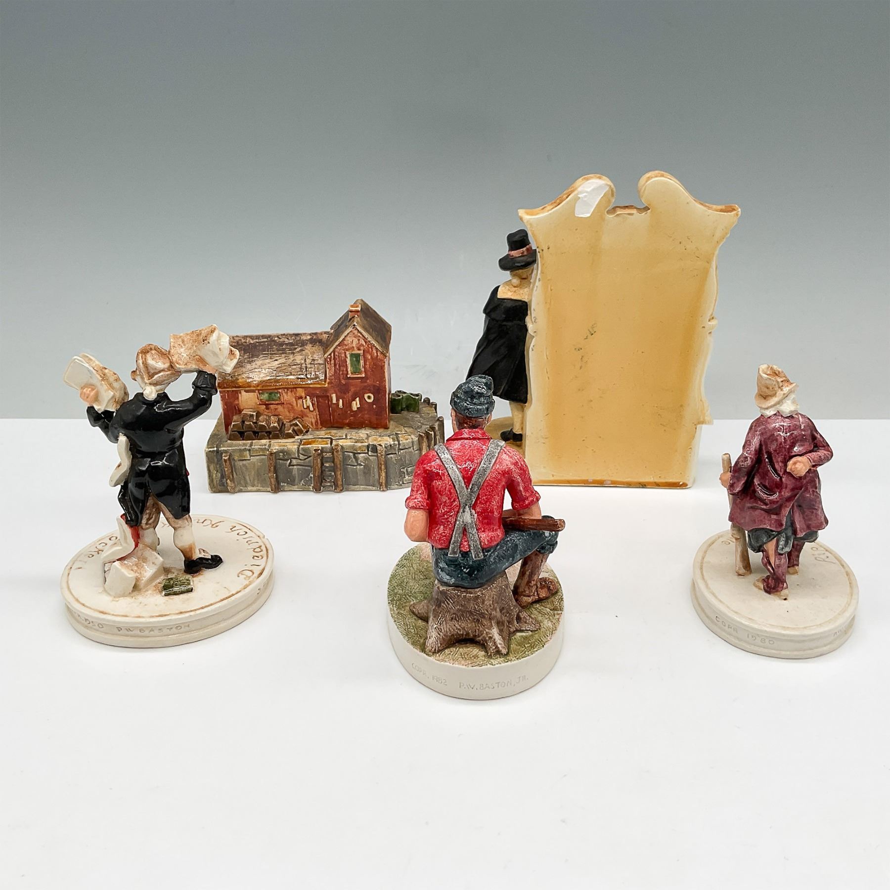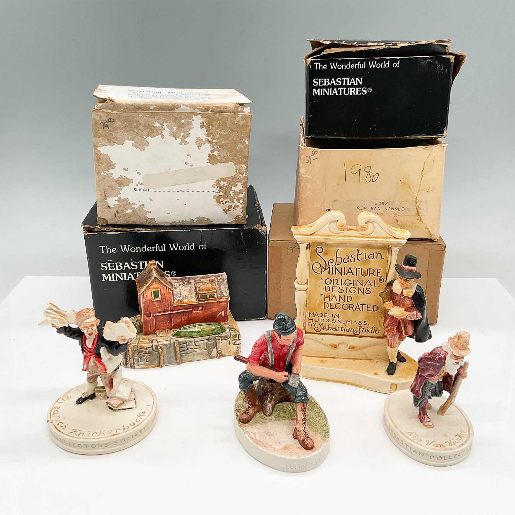 A collection of five hand-painted Sebastian Miniatures figurines, known for their detailed craftsmanship and historical and literary themes. This lot includes representations of Ichabod Crane, Rip Van Winkle, and a lumberjack, among others, with bases labeled Sebastian Collectors Society. The group also includes a Sebastian Miniatures display plaque. Accompanied by original boxes, some exhibiting wear consistent with age.