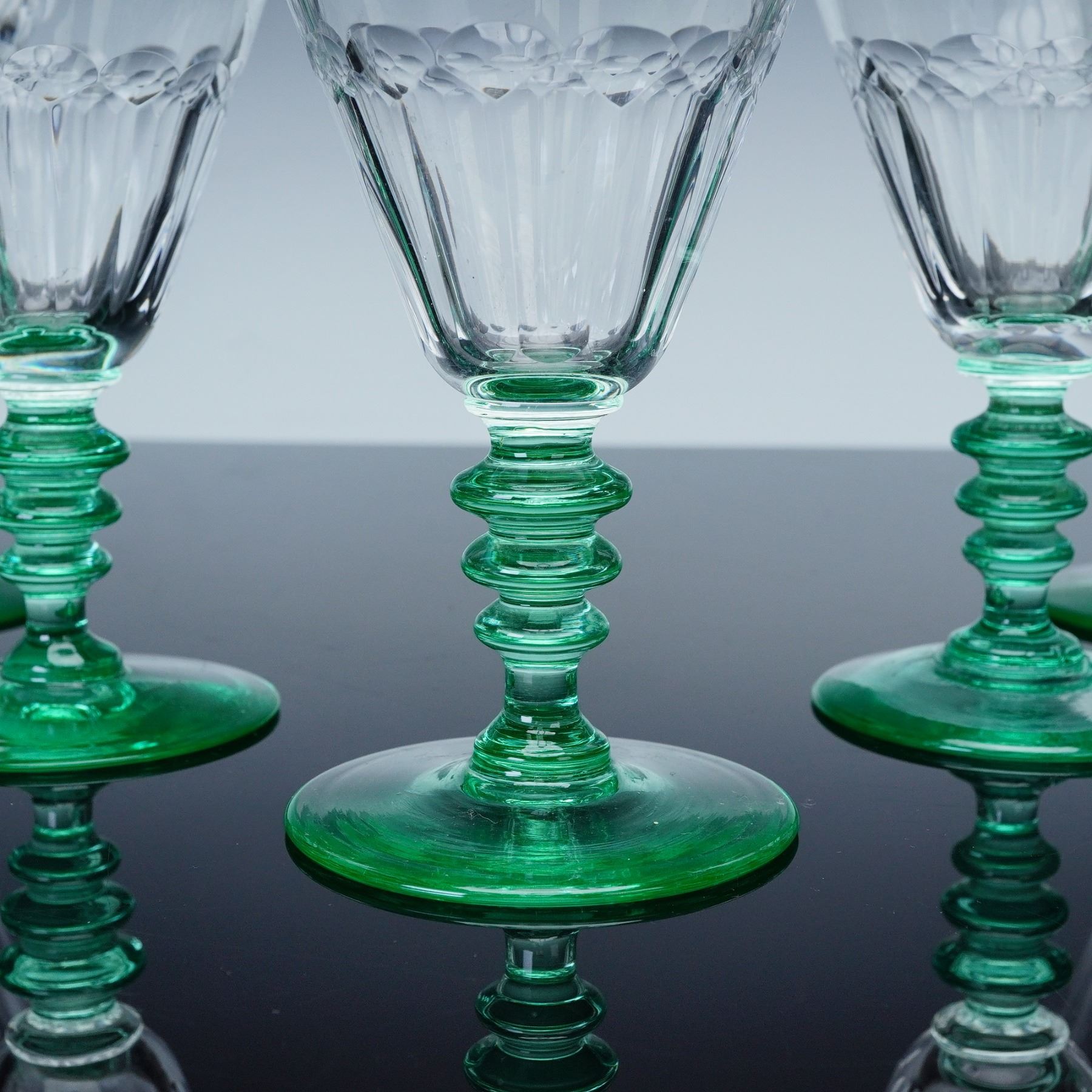 An exceptional set of five Seneca Glass Co. Theodule pattern goblets, featuring clear bowls with cut oval decoration and vibrant uranium glass stems that fluoresce an intense green under UV light. The stepped and beaded form of the stem is characteristic of this elegant pattern, blending refined craftsmanship with the striking appeal of uranium glass. A fine example of American glass artistry with both functional and collectible charm.