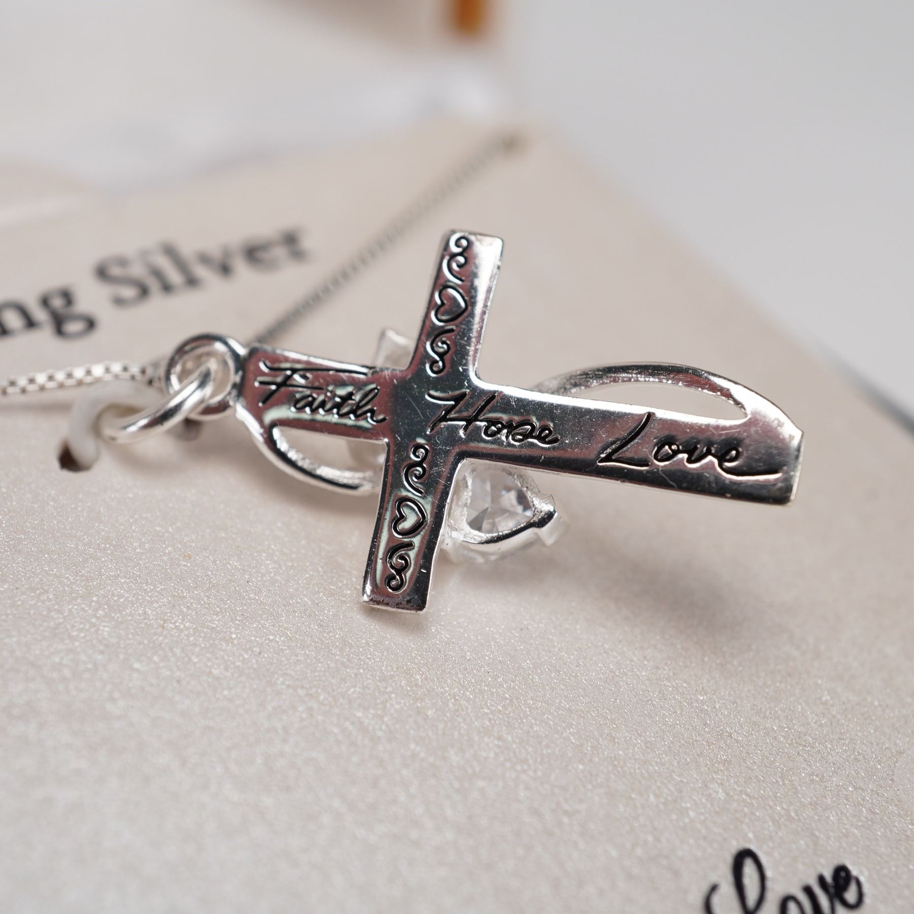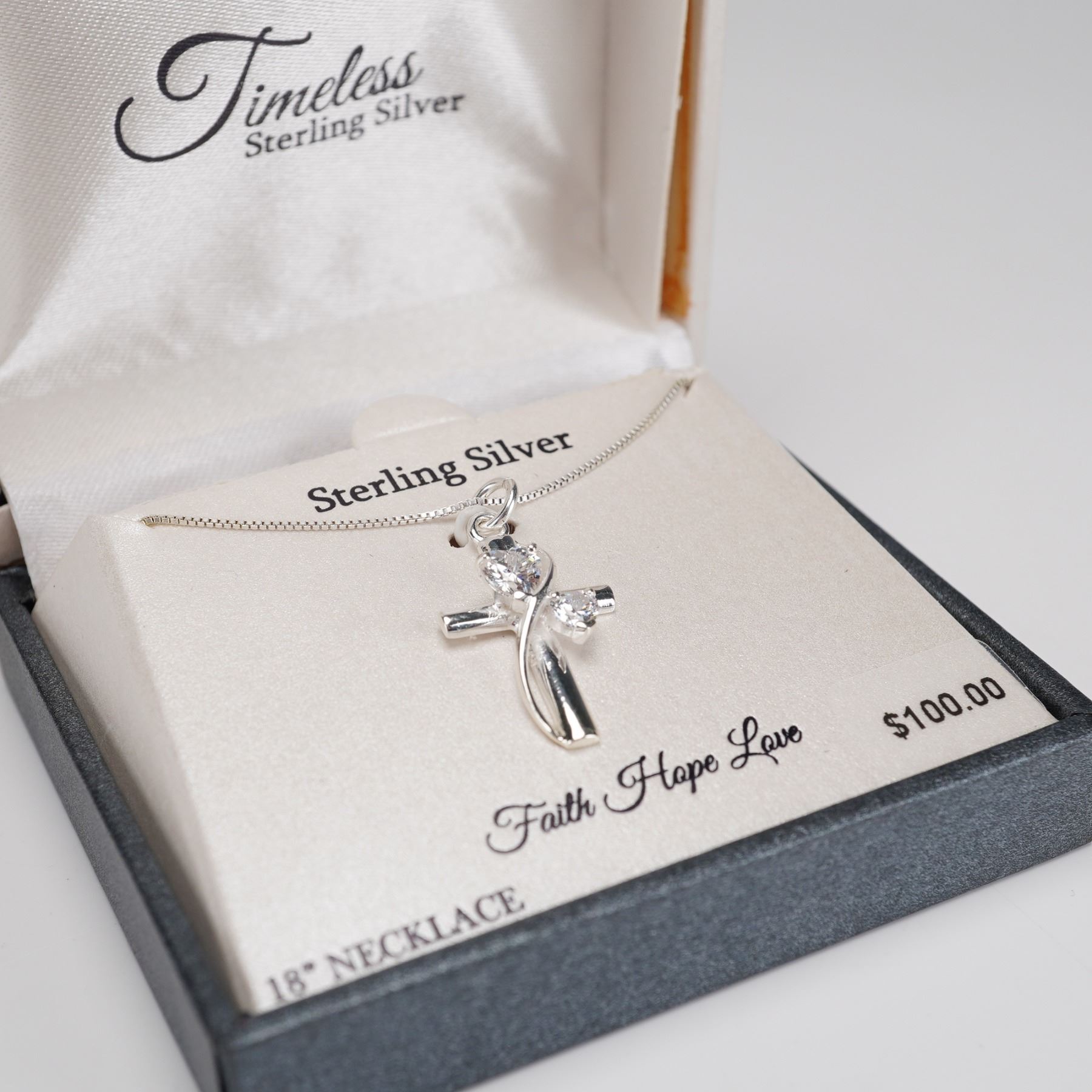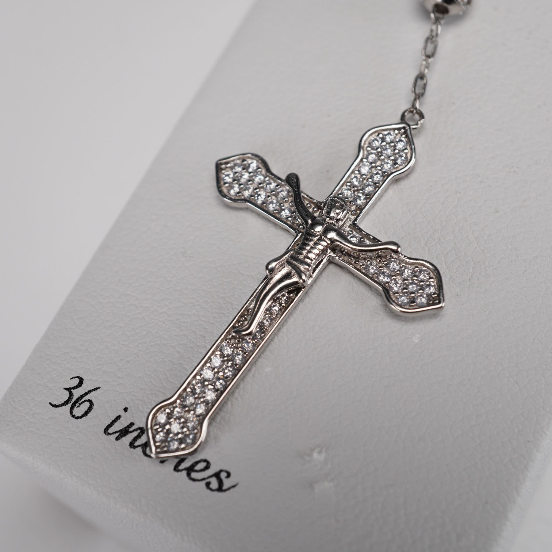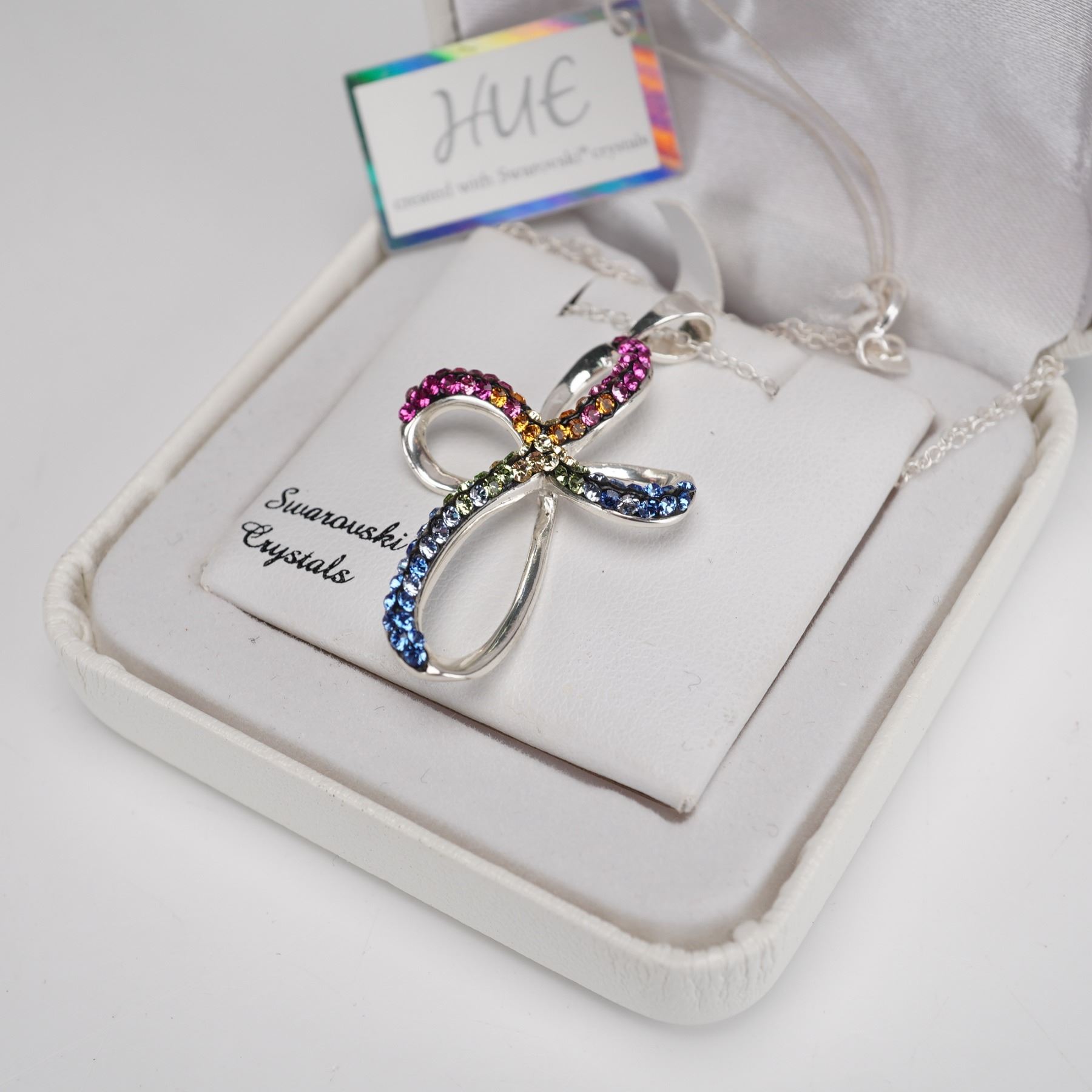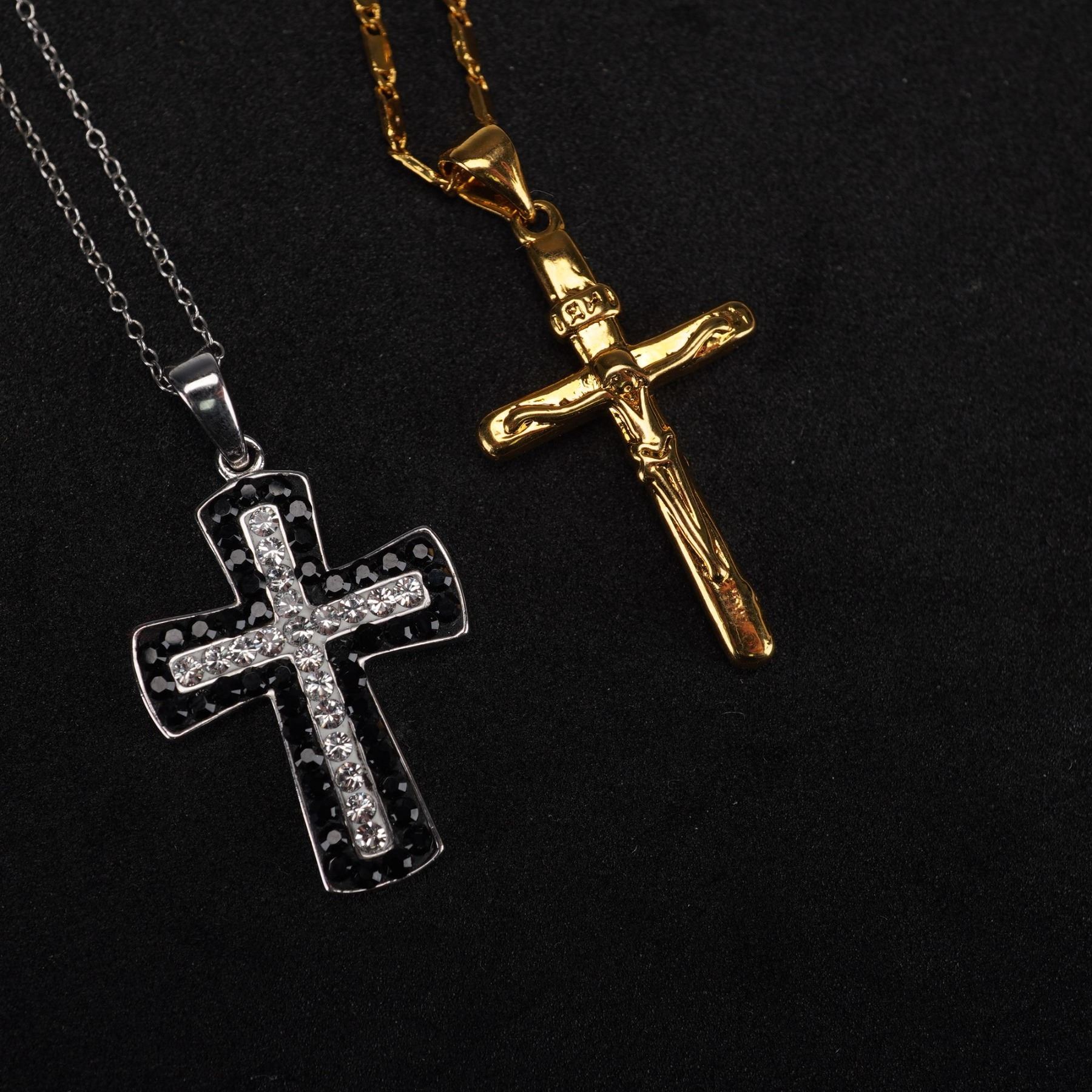 A varied collection of five cross necklaces, three with their original boxes. The group includes multiple sterling silver designs accented with Swarovski crystals, as well as one gold tone crucifix pendant. Featured pieces include a pendant with rainbow Swarovski crystals in an open cross form, a sterling silver rosary-style necklace, and a cross with black and white crystals. Total combined weight of sterling silver items (excluding the secured boxed necklace): 18g.