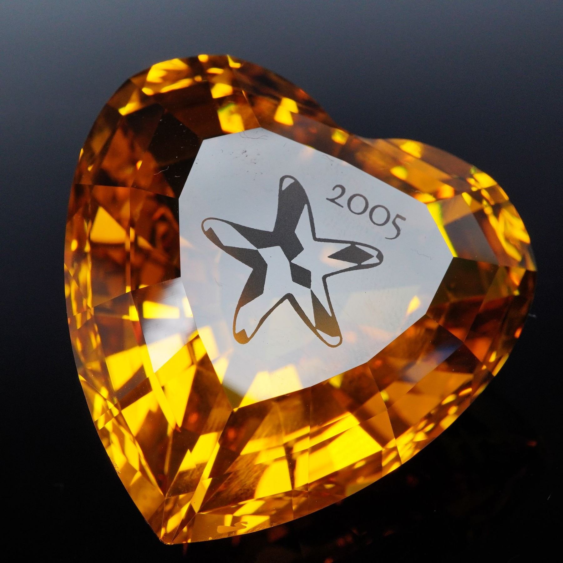 A collection of five faceted crystal heart figurines including Eternity Indicolite blue (844184), Harmony topaz (696974), Heart blue (210899), Heart red (215371), and Love hearts ( 904171). Each features brilliant color and precision faceting characteristic of Swarovski craftsmanship. Several pieces bear etched maker's marks, including the Swarovski swan logo and engraved year designs, such as a seashell motif marked "2006" and a starfish motif marked "2005." Complete with presentation boxes and a black drawstring pouch.