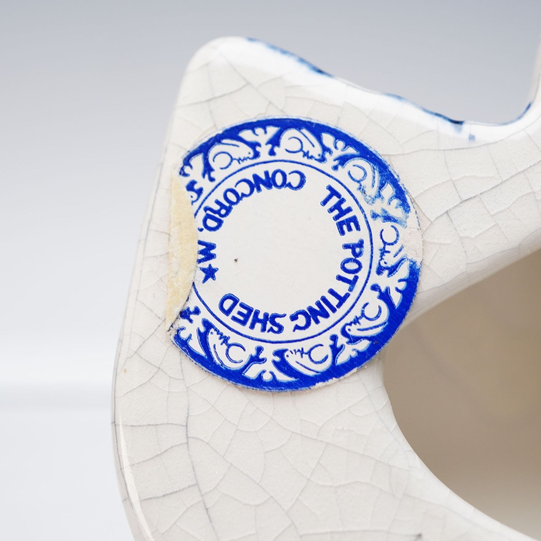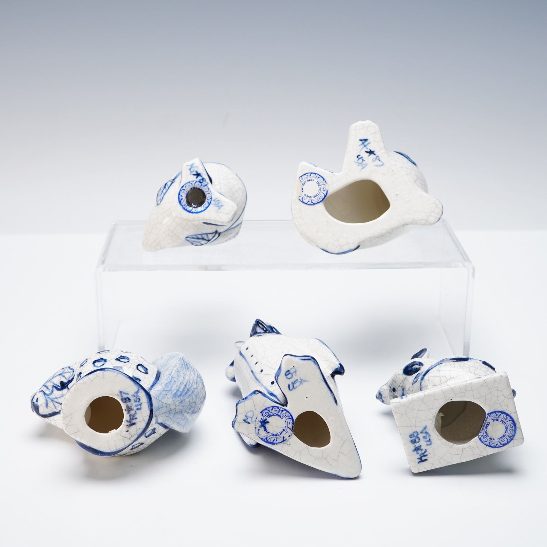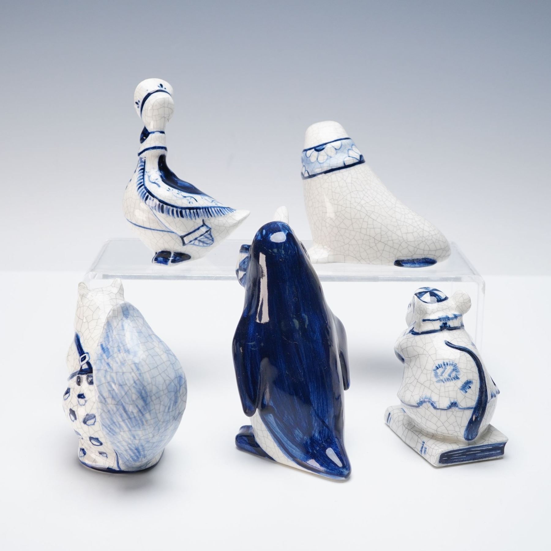 A charming collection of five Dedham Pottery animal figurines by The Potting Shed, Concord, Massachusetts, each crafted in the signature crackle-glazed blue and white style. The group includes a penguin with bow tie, a goose in bonnet, a seal with scarf, a squirrel holding a nut, and a mouse with spectacles and book. Each piece bears The Potting Shed Dedham Pottery backstamp to the base.