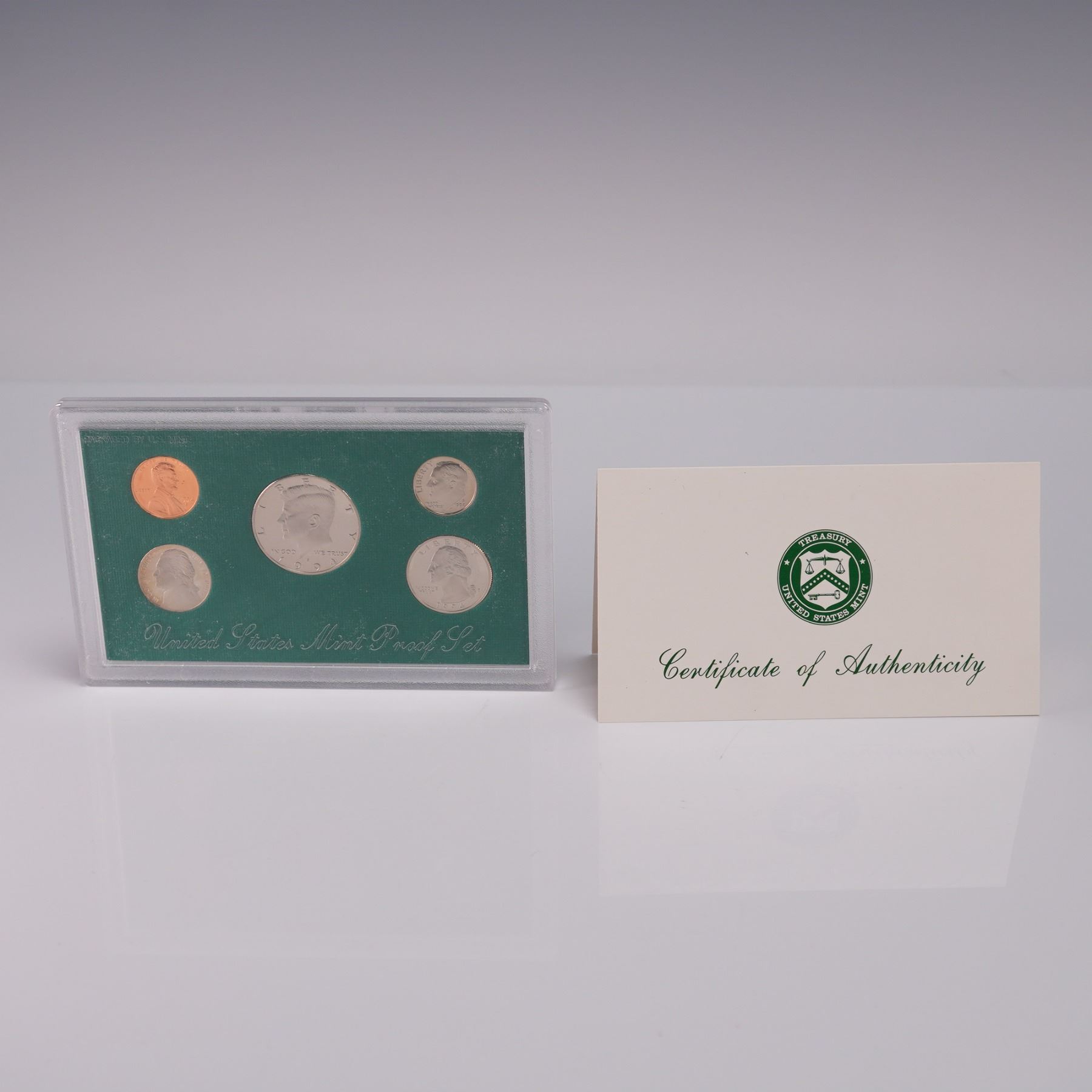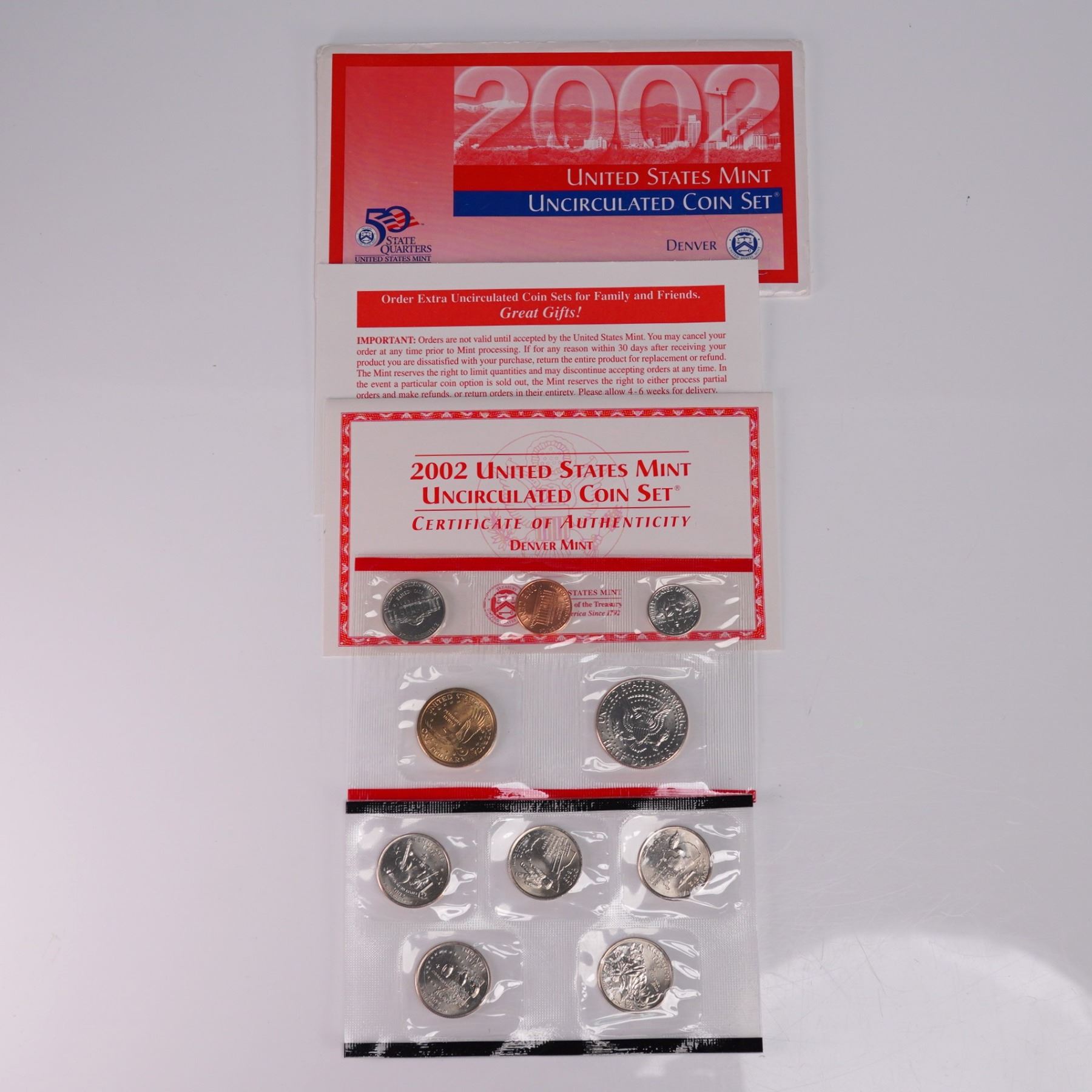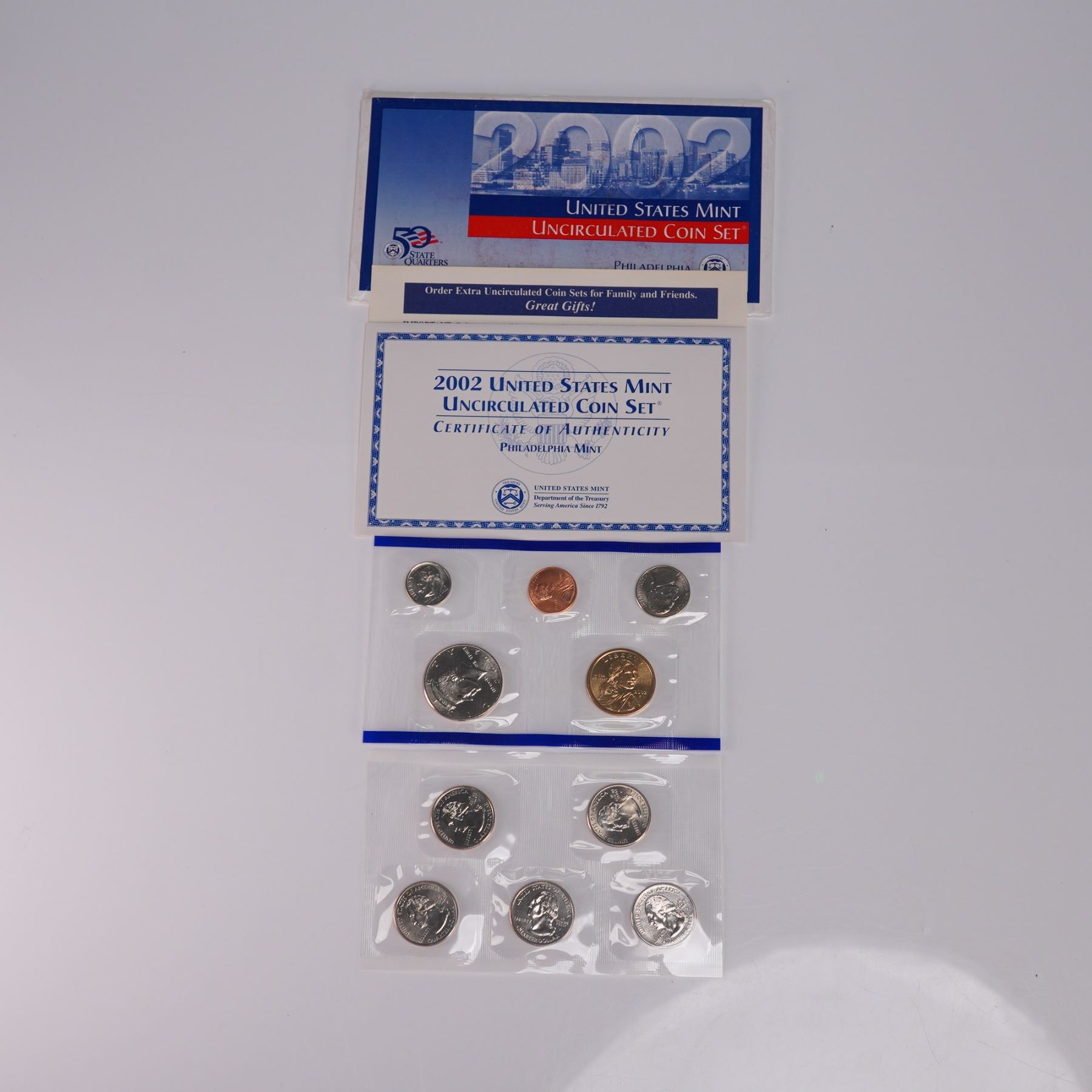 United States Mint coin sets from the years 1990, 1994, and 2002, comprising both uncirculated and proof sets. Each set is presented with original mint packaging and tokens where applicable. The 1990 United States Mint Uncirculated Coin Set contains ten coins, including issues from both the Denver and Philadelphia Mints. Each mint's set includes the Kennedy half dollar, Washington quarter, Roosevelt dime, Jefferson nickel, and Lincoln cent. Each grouping is accompanied by its respective mint token, and the set is housed in its original envelope. The 1994 United States Mint Uncirculated Coin Set also comprises ten coins, with five from each of the Denver and Philadelphia Mints. Coins included are the Kennedy half dollar, Washington quarter, Roosevelt dime, Jefferson nickel, and Lincoln cent. Both mint groupings include identifying tokens and are sealed in original mint packaging with envelope. Also included is the 1994 United States Mint Proof Set, issued by the San Francisco Mint. This five-coin set includes the Kennedy half dollar, Washington quarter, Roosevelt dime, Jefferson nickel, and Lincoln cent. The coins are housed in a rigid plastic case with green insert and are accompanied by a Certificate of Authenticity. The lot features two 2002 United States Mint Uncirculated Coin Sets: one from the Denver Mint and one from the Philadelphia Mint. Each ten-coin set includes the Sacagawea dollar, Kennedy half dollar, Roosevelt dime, Jefferson nickel, Lincoln cent, and five America the Beautiful quarter designs issued that year. Each set is presented in original packaging and includes its own Certificate of Authenticity. These sets represent a cross-section of United States Mint coinage from the early 1990s through the early 2000s, offering examples of both proof and uncirculated finishes across multiple denominations and mints. Each 1990 & 1994 U.S. Mint envelope measures: 6.5"L x 3.75"W. 1996 U.S. Mint box: 5.75"L x 3.5"W x 0.25"H. Each 2000 U.S. Mint envelope measures: 6.75"L x 3.75"H.