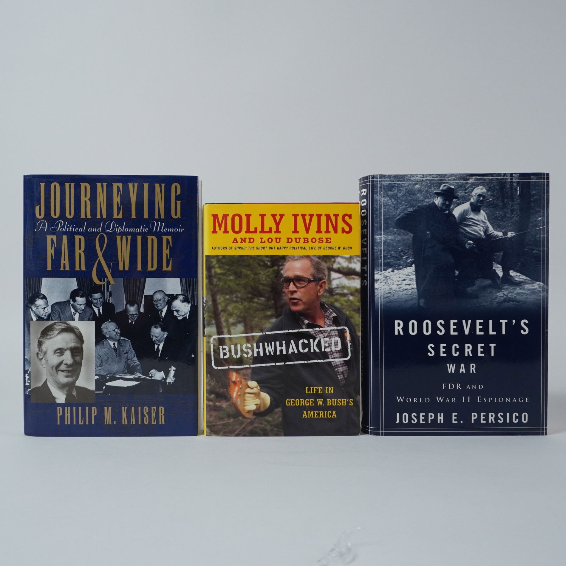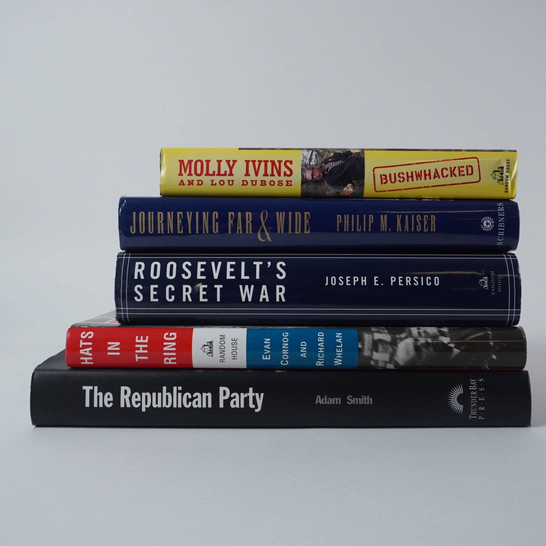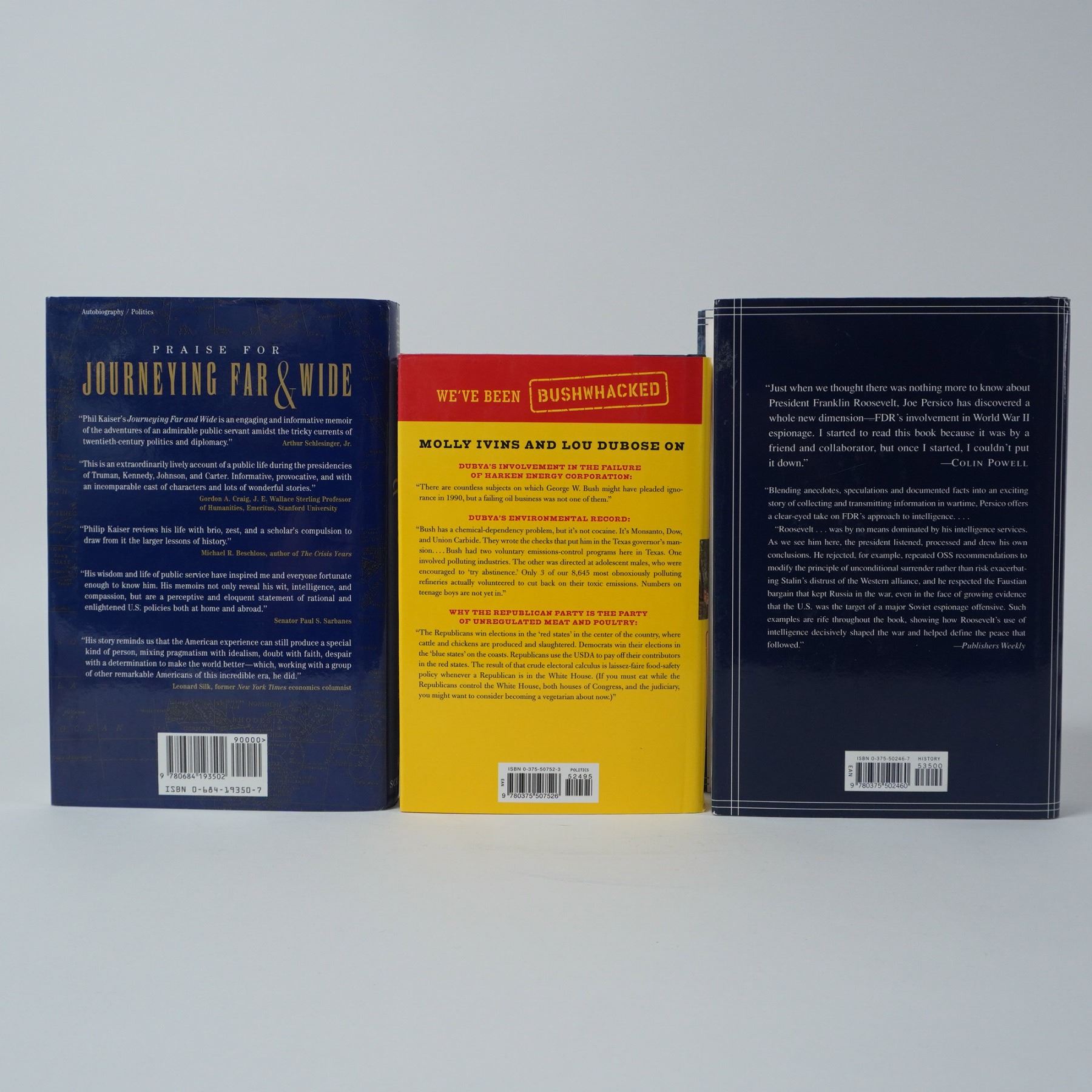 A compelling collection of five books examining the history, influence, and inner workings of U.S. politics and leadership. Bushwhacked by Molly Ivins and Lou Dubose critically explores the policies of George W. Bush. Roosevelts Secret War by Joseph E. Persico delves into FDRs covert intelligence operations during WWII. Hats in the Ring by Evan Cornog and Richard Whelan presents a visually rich history of U.S. presidential campaigns. The Republican Party by Adam Smith traces the GOPs evolution through photography. Journeying Far & Wide by Philip M. Kaiser provides a political and diplomatic memoir reflecting on key moments in 20th century history. This collection offers a deep dive into the forces shaping American leadership. Largest item measures: 8.75"L x 1.25"W x 11.75"H.