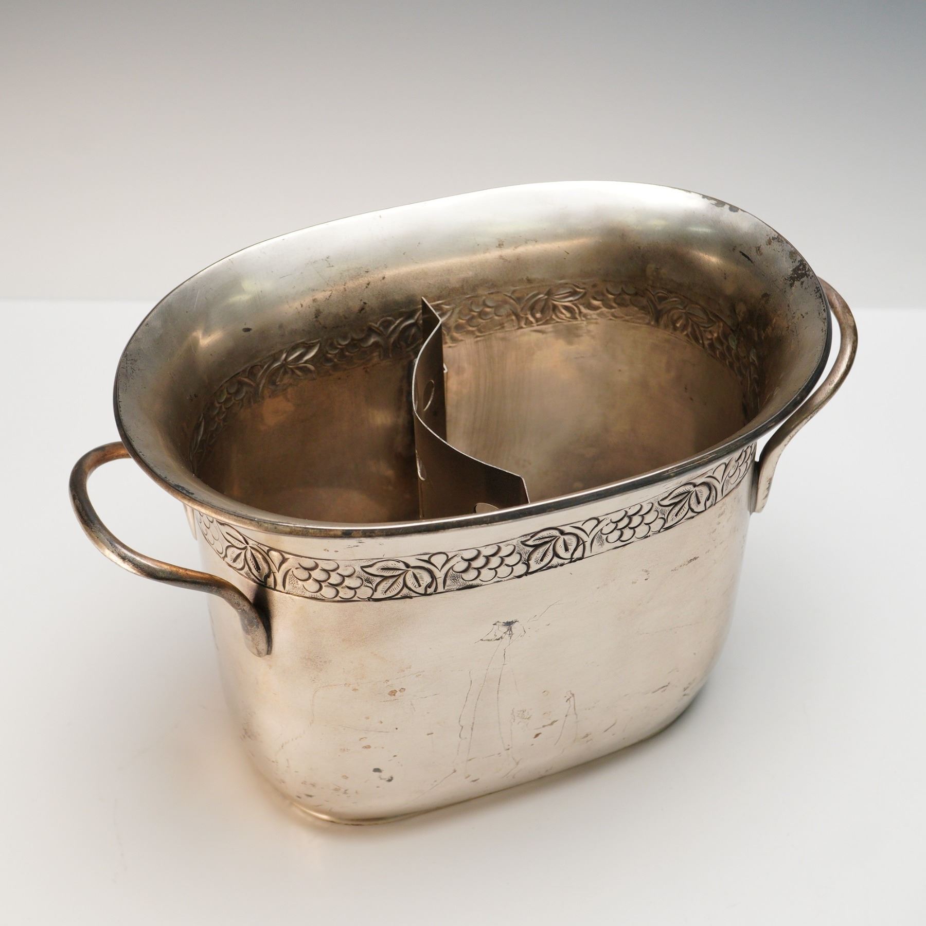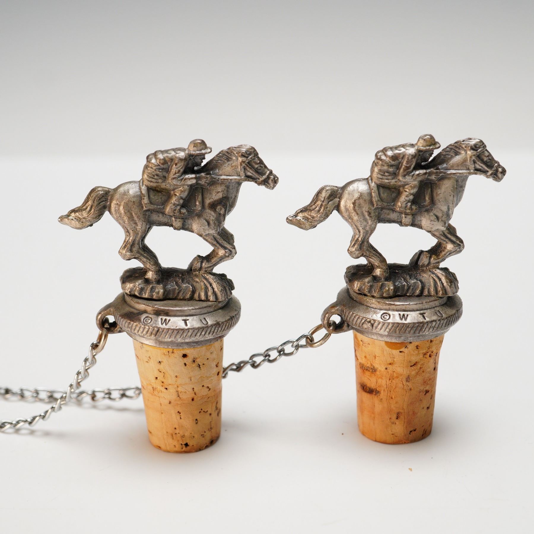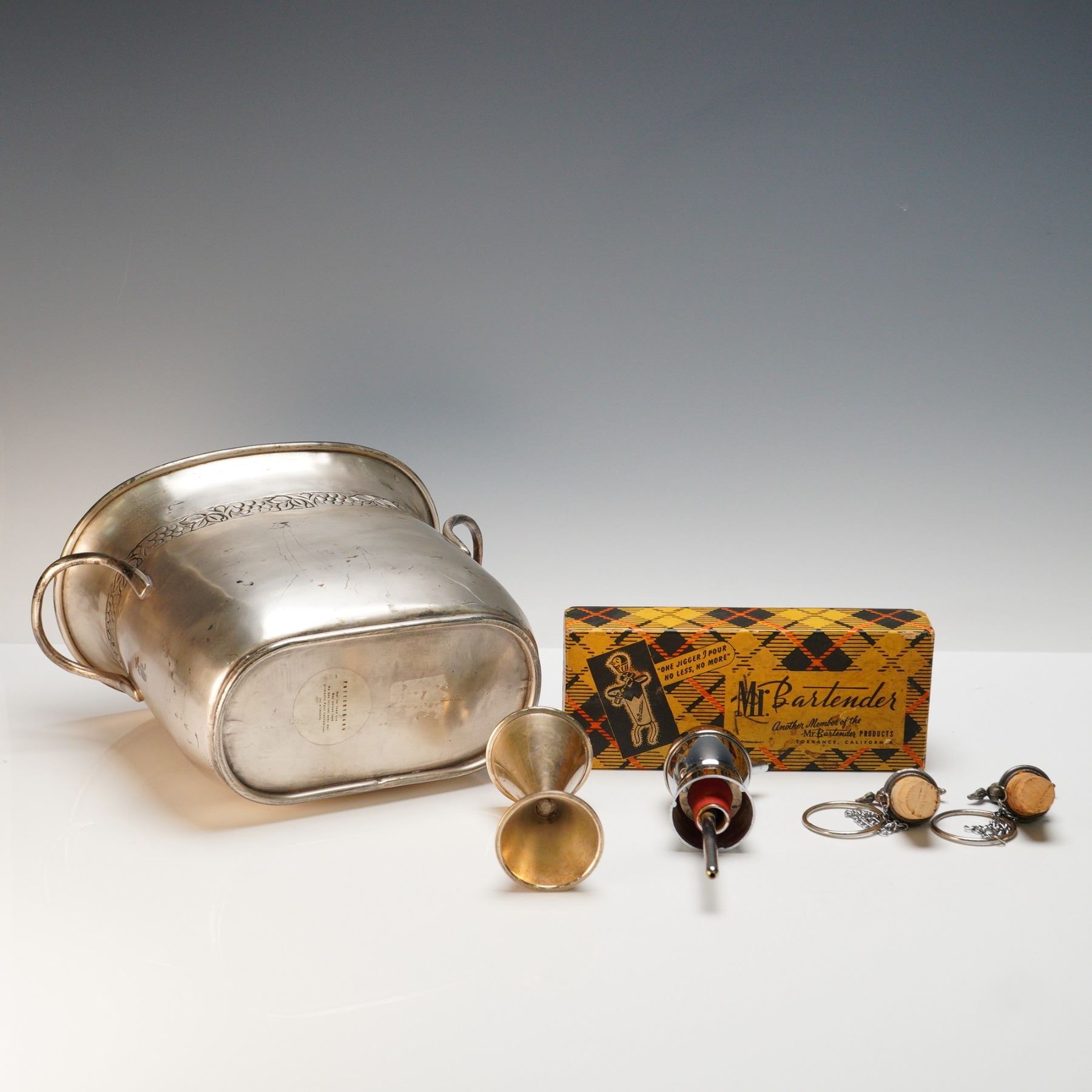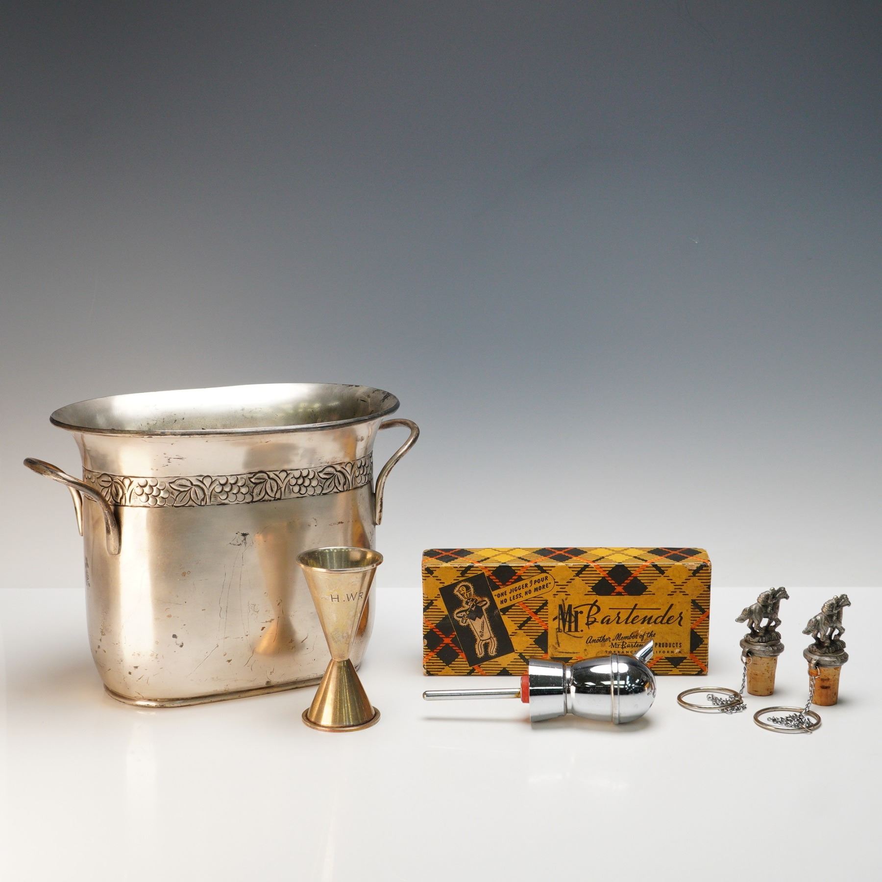 A fine grouping of vintage and decorative barware, including a pair of whimsical silver-tone bottle stoppers topped with detailed jockey-on-horseback finials, each cork fitted with a retaining chain and marked "WTU." Also included is a large silver-plated handled ice bucket by Pottery Barn, decorated with a chased grapevine and leaf border, the underside marked and labeled "Not for food use." Completing the lot are a vintage boxed "Mr. Bartender" chrome bottle pourer, and a double-sided brass jigger engraved "H.W'R." Together, these pieces represent both functional and collectible elements of bar service, ranging from mid-century novelty to modern decorative wares. A charming ensemble for display or light use, blending equestrian and cocktail themes with stylish flair.