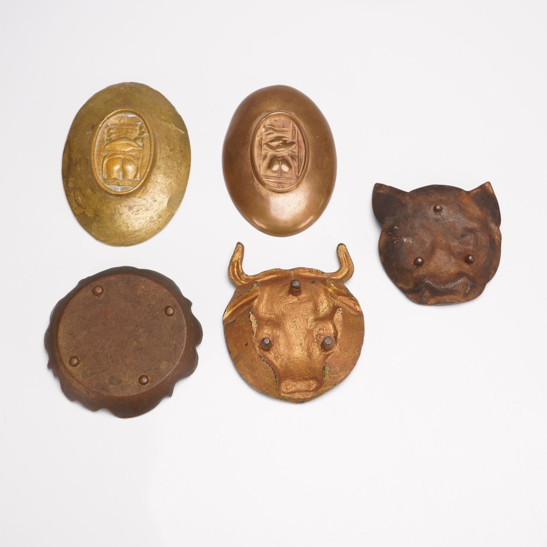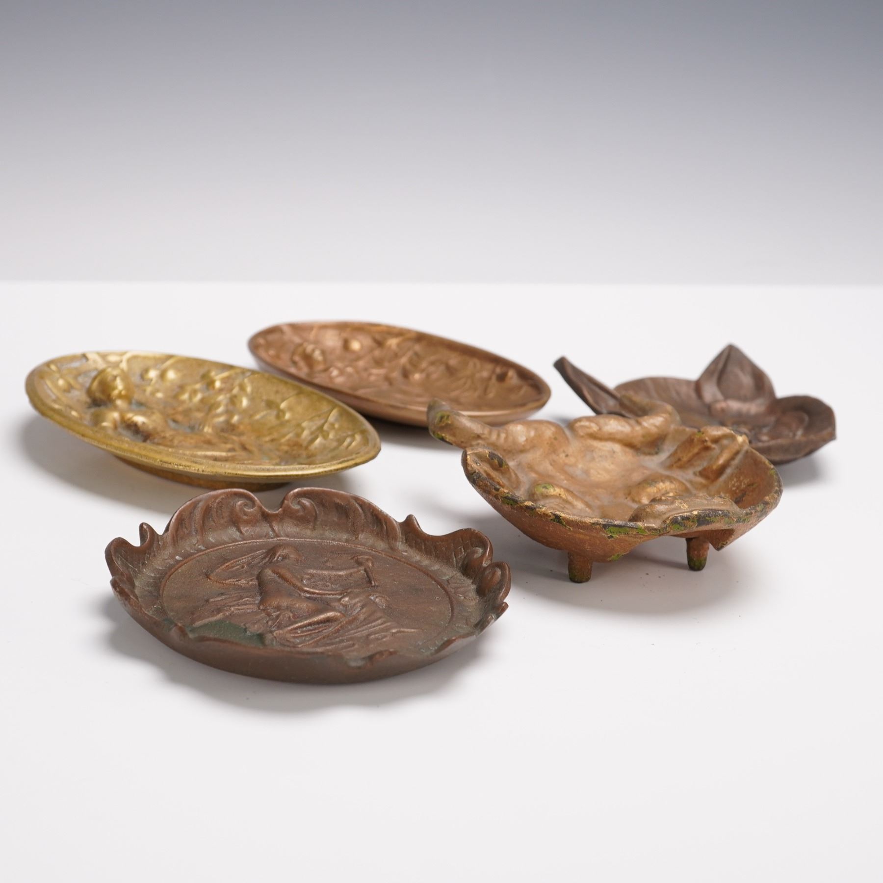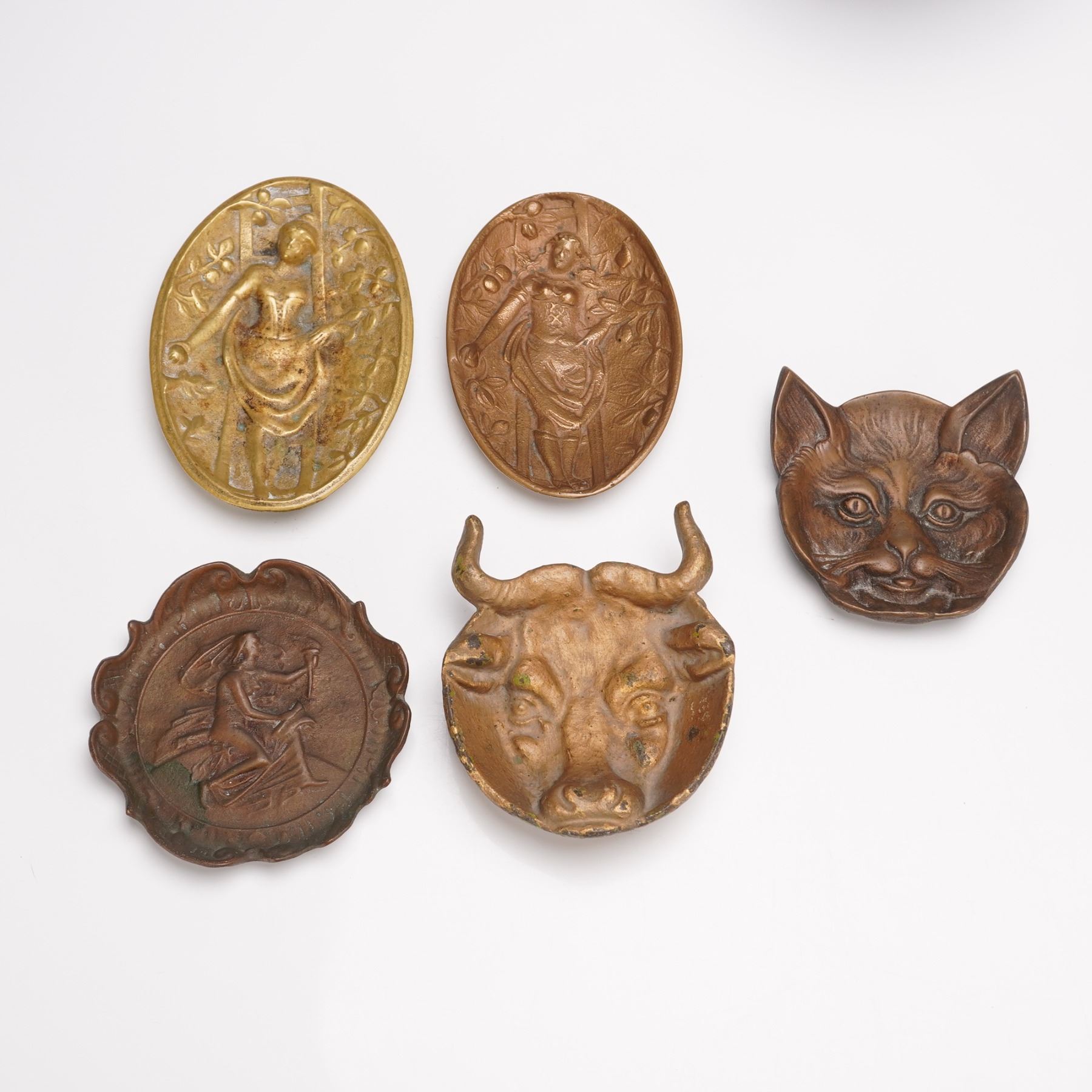 A group of five figural cast metal ashtrays, each displaying unique motifs and decorative finishes. Included are two oval trays with raised reliefs of classical maidens, one finished in gilt and the other in bronze tones, both showcasing fine detail in drapery and background foliage. Also featured is a round tray with scalloped edges depicting a standing figure, along with a whimsical ashtray modeled as a cat's face in a warm brown patina. Completing the set is a bold circular example in the form of a bull's head, retaining traces of its original gilt finish. Collectively, these ashtrays demonstrate a range of artistic themes and finishes, from animal forms to classical allegory, making them an intriguing lot for collectors of decorative metalwork and tobacciana.