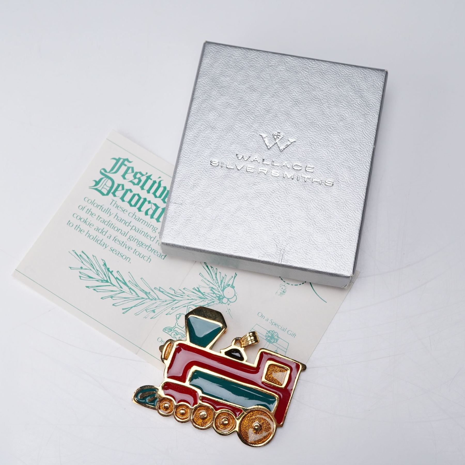 A captivating collection of five silver toned and gold plate ornaments. Each object is meticulously hand-painted with vibrant enamel finishes and inspired by whimsical modes of transport. The set includes a Hot Air Balloon, a Train, a Tugboat, a Locomotive, and a Clown. These adorable charms can be use as necklace pendants, tree ornaments, or on a special gift. Wallace Silversmiths backstamp. These items have their original boxes.