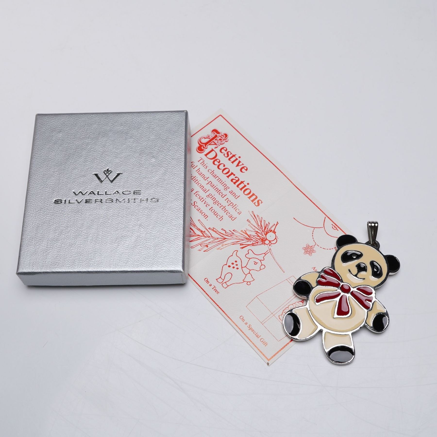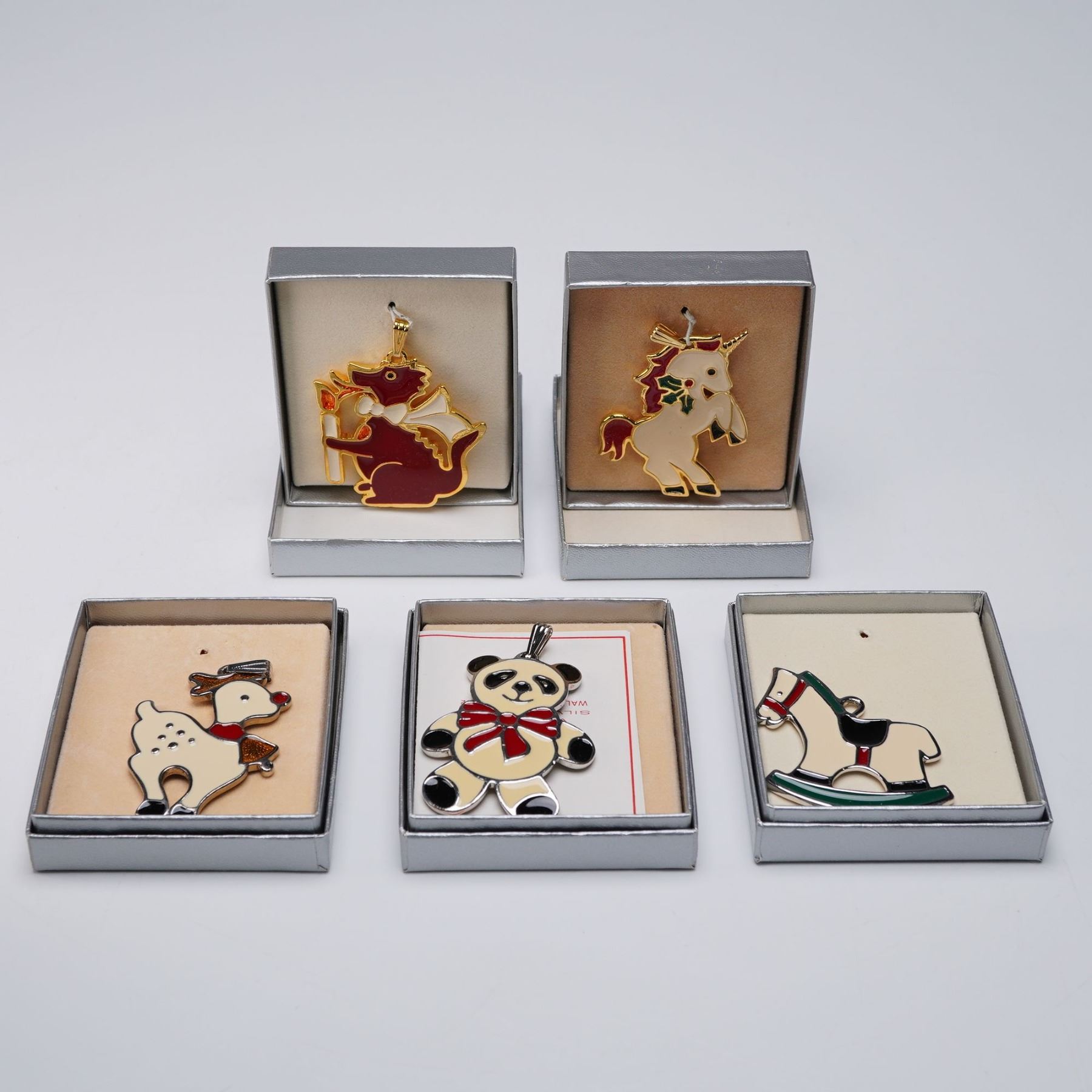 A delightful collection of festive pendants, each crafted in gold plate or silver toned. The set includes whimsical figures such as a panda, a reindeer, a unicorn, a dragon holding a candle, and a rocking horse. These adorable charms can be use as necklace pendants, tree ornaments, or on a special gift. Wallace Silversmiths backstamp. These items have their original boxes.