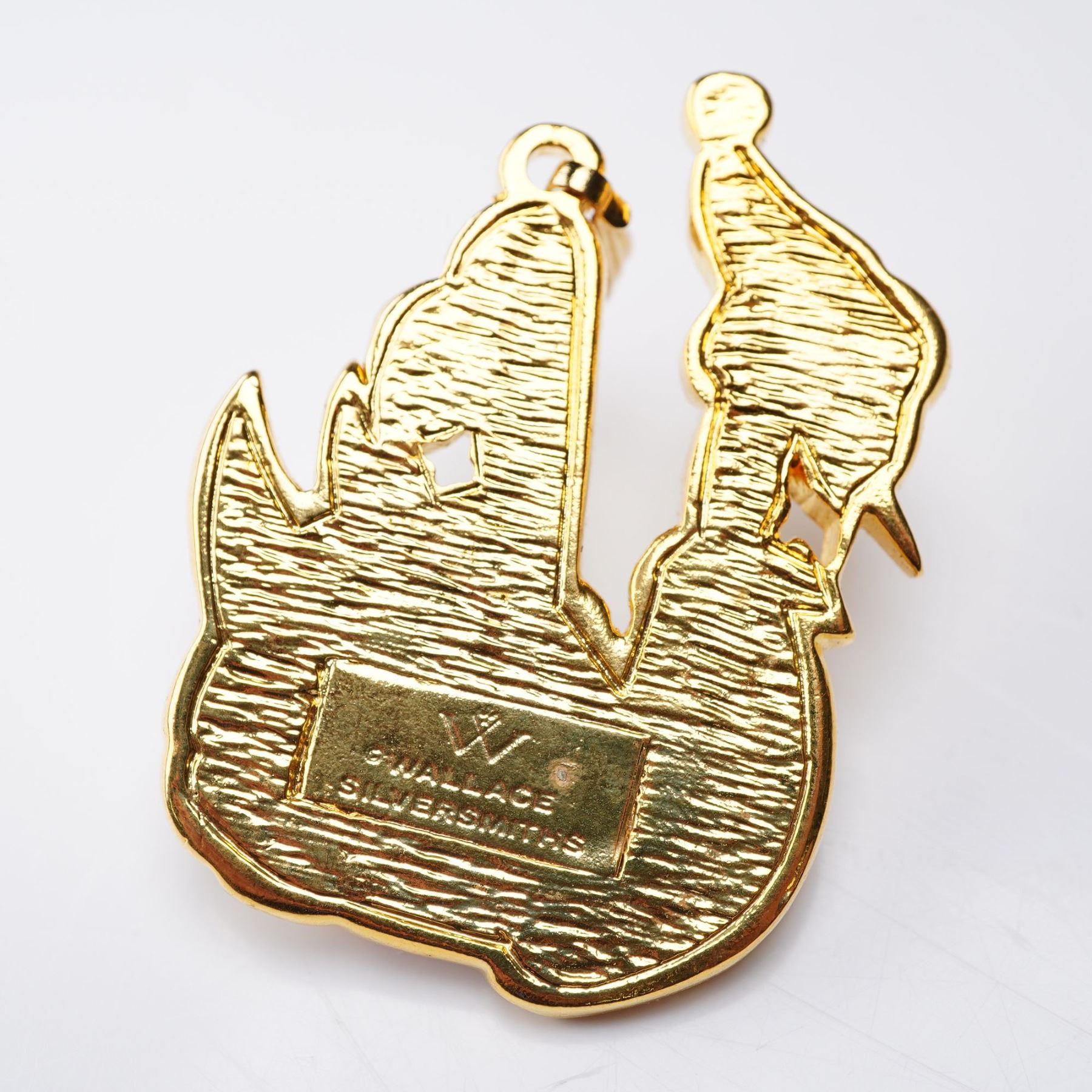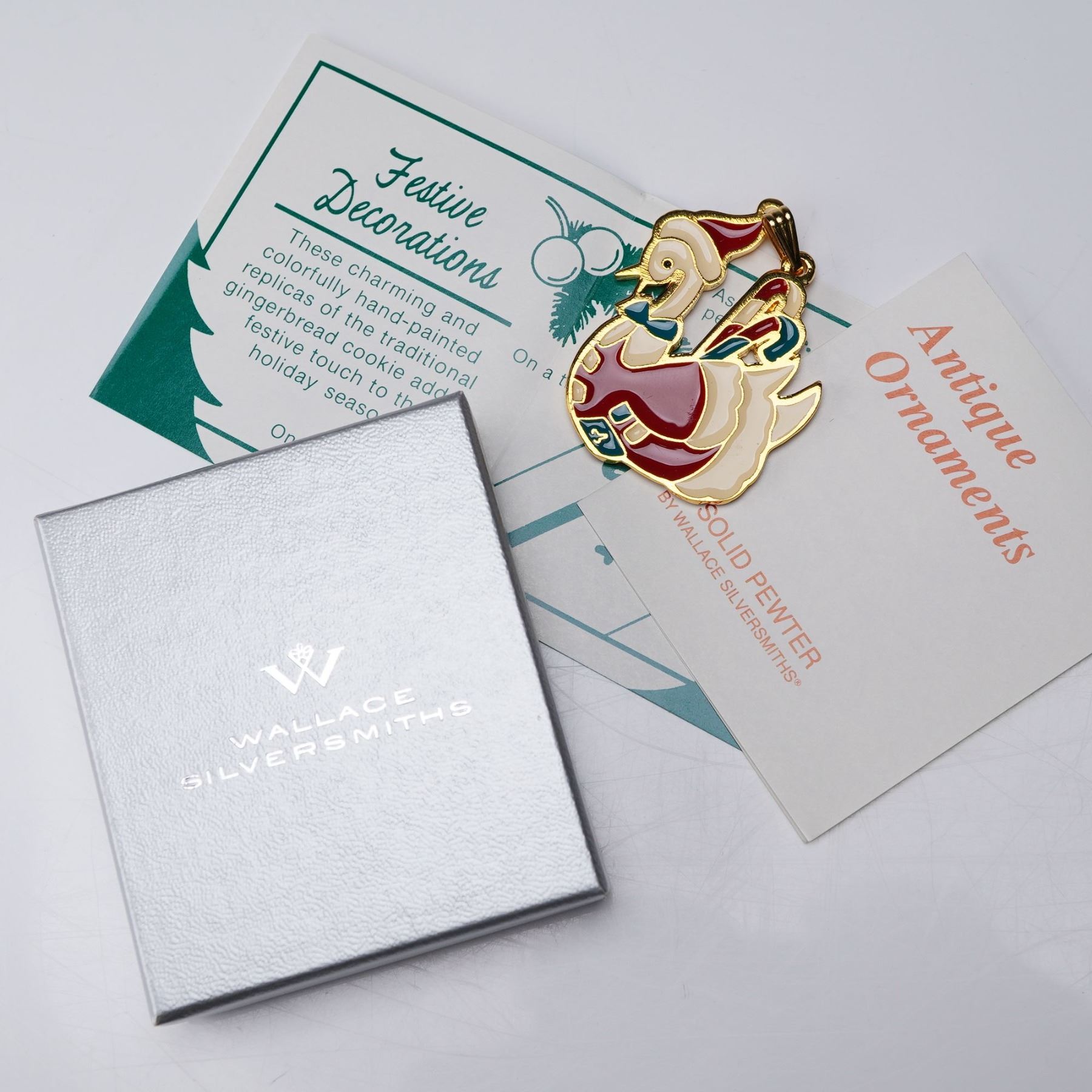 A collection of five enamel Christmas ornaments, each crafted in solid pewter with rich gold-tone finishes and vivid hand-painted enameling. The designs include a Penguin, a Snowbird, Mother Goose, a Dove, and Goose. These adorable charms can be use as necklace pendants, tree ornaments, or on a special gift. Wallace Silversmiths backstamp. These items have their original boxes.