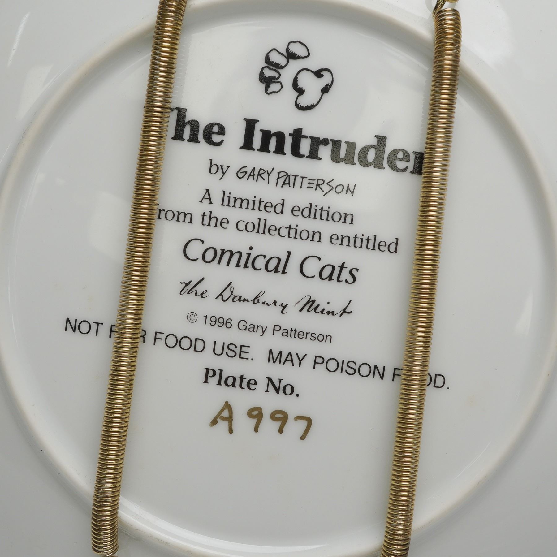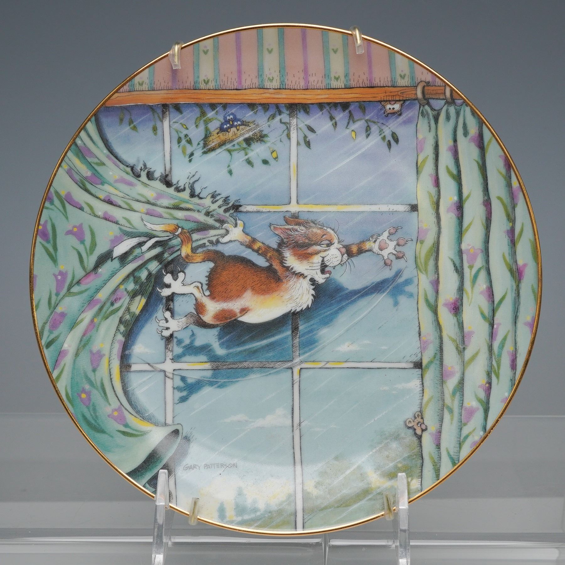 Set of five decorative collector plates issued by the Wanbury Mint, including charming illustrations by Gary Patterson featuring whimsical cat scenes, and two nostalgic MJ Hummel-style child portrait designs. Each porcelain plate features a gold rim, a Wanbury Mint backstamp on the reverse indicating these as limited edition, and a plate number. The plates showcase vivid color palettes and sentimental themes ranging from playful pets to childhood storytelling and nature scenes, making them ideal for display.