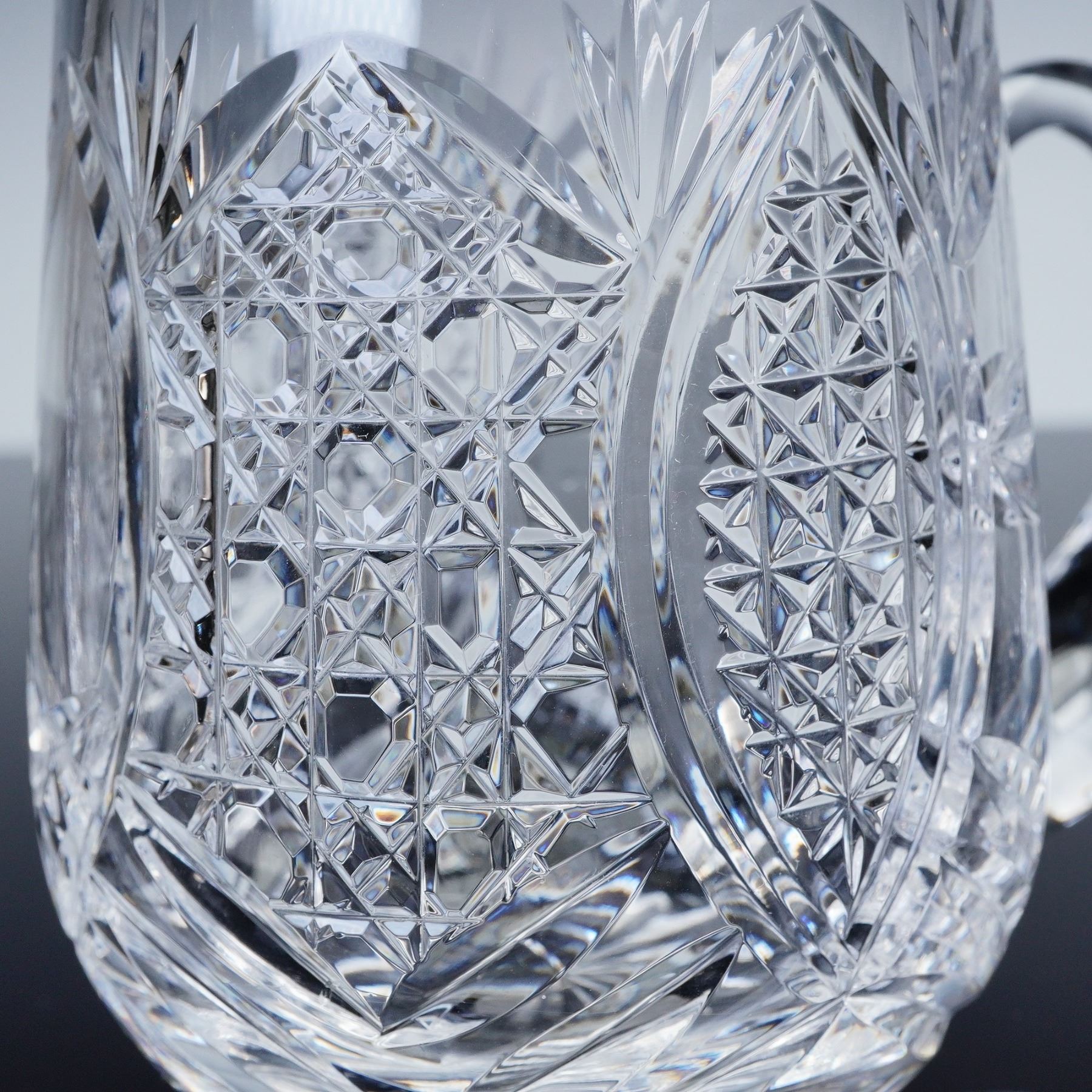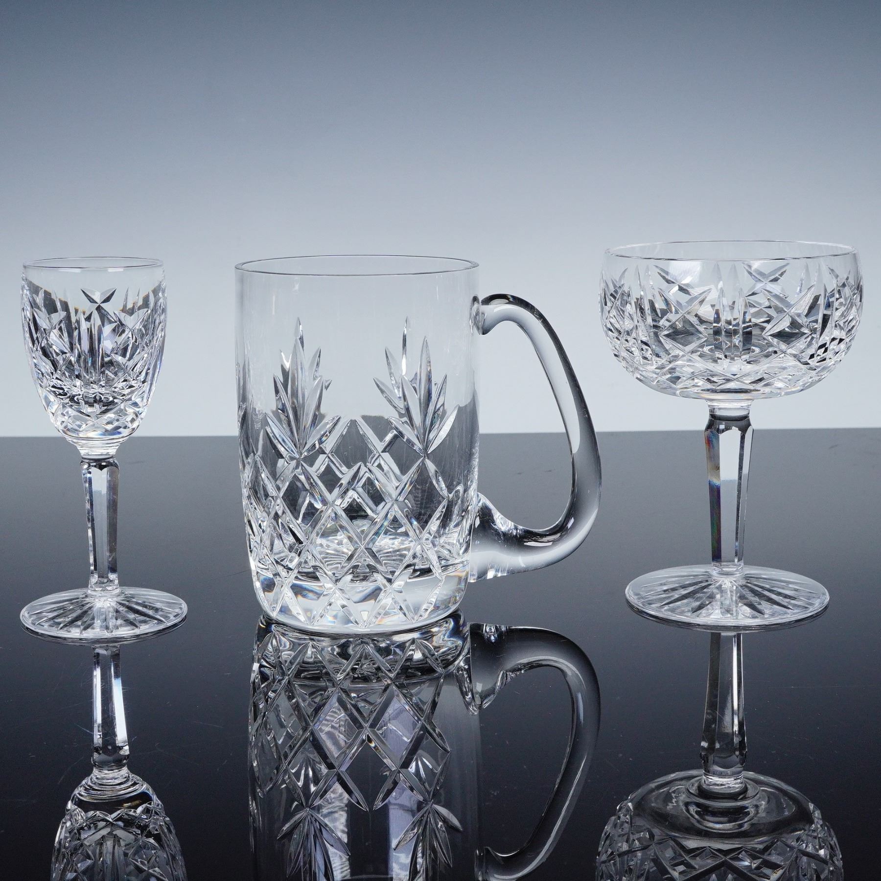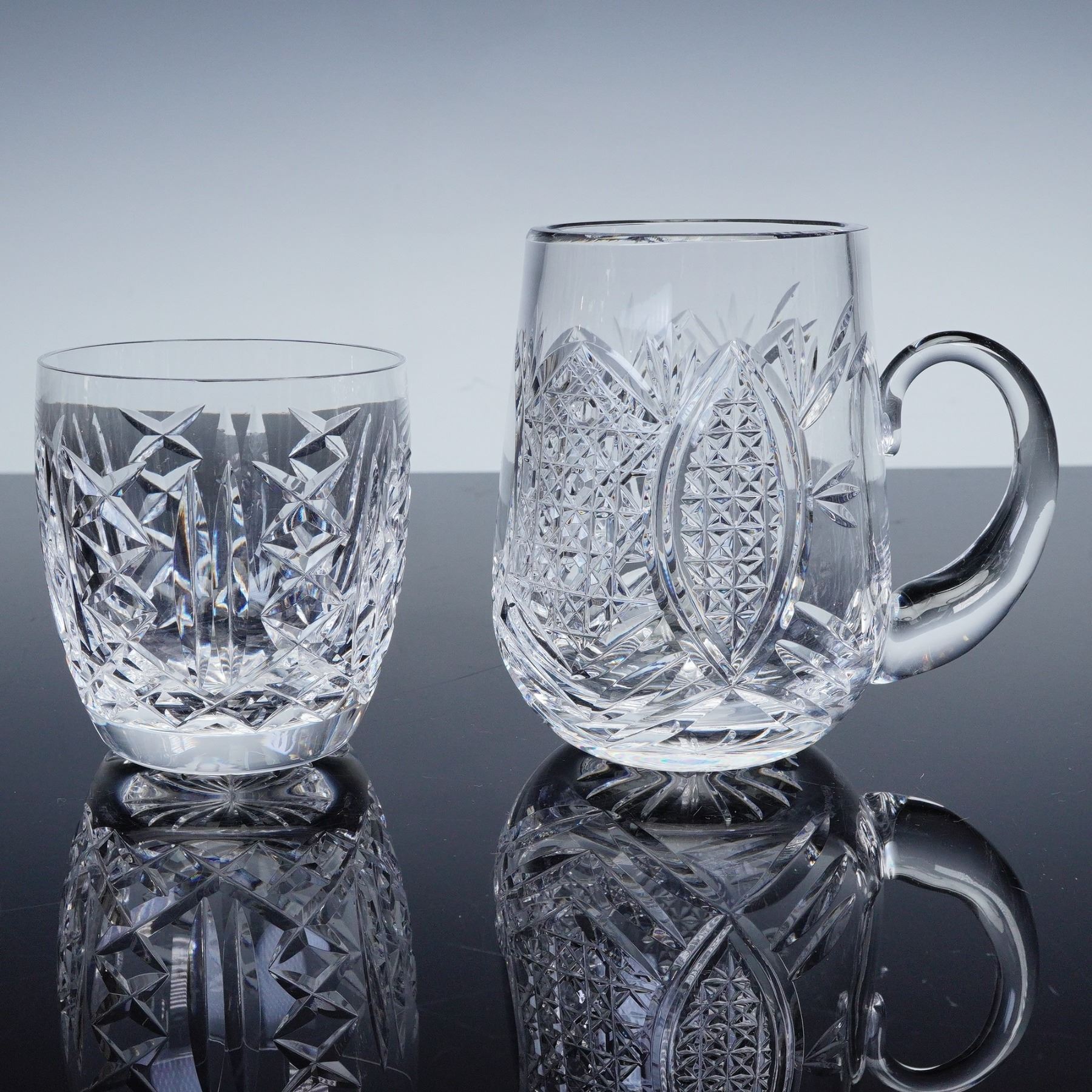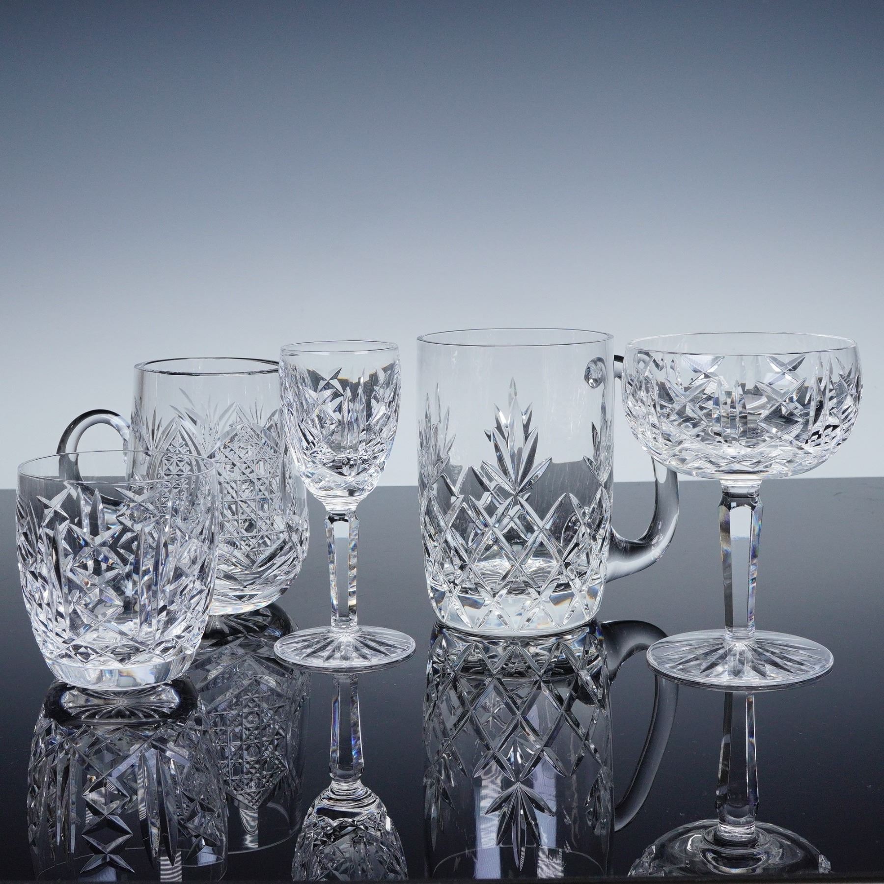 Five-piece collection of cut crystal glassware comprising one Waterford tankard with bold diamond and fan motif and one Lenox tankard decorated with intricate starburst and lattice designs. The group also includes a finely cut sherry glass on a slender stem, a short tumbler with deep cross-hatched cutting, and a wide champagne glass with star and leaf patterns. Each piece demonstrates brilliant clarity and skilled craftsmanship, with the Waterford mark visible on select bases.