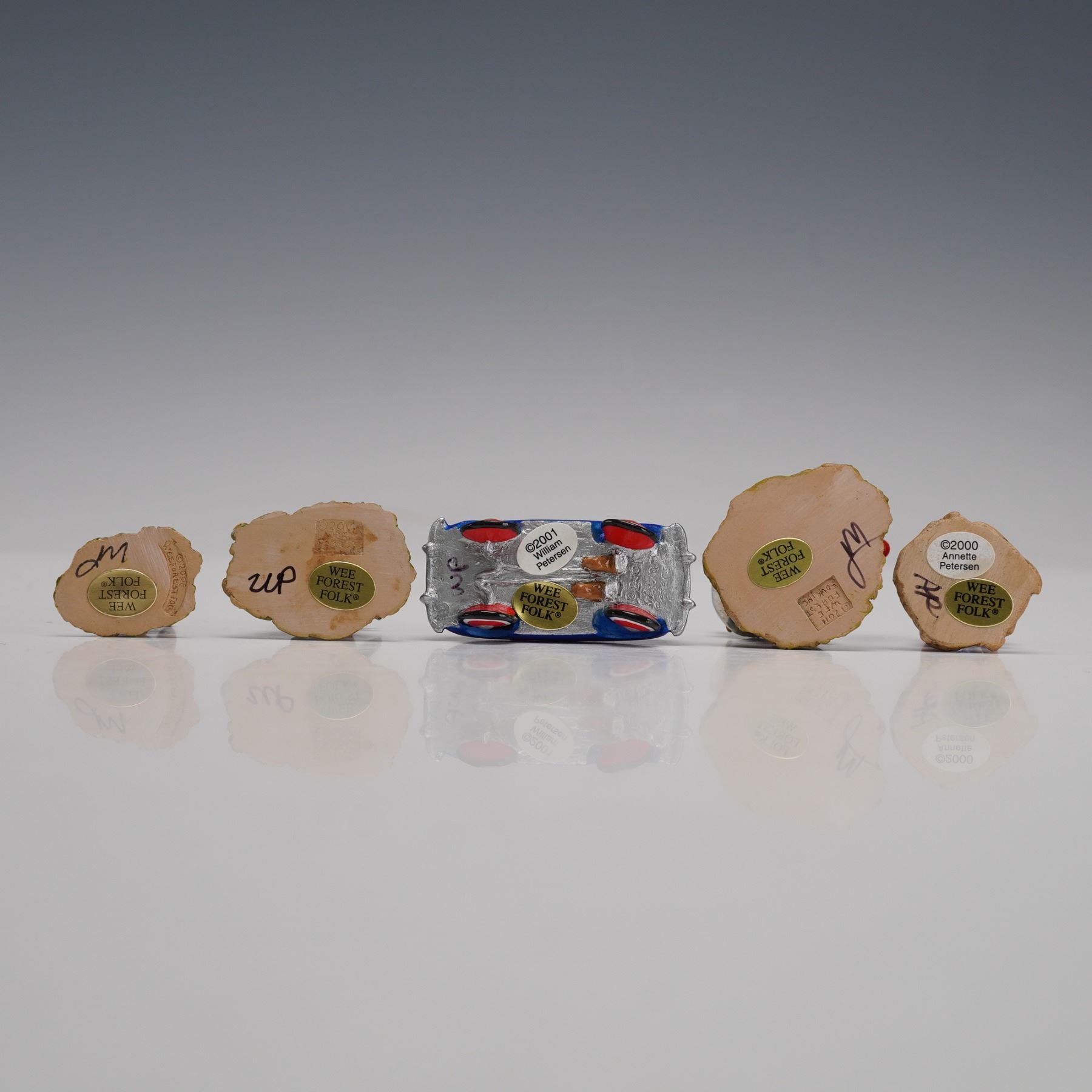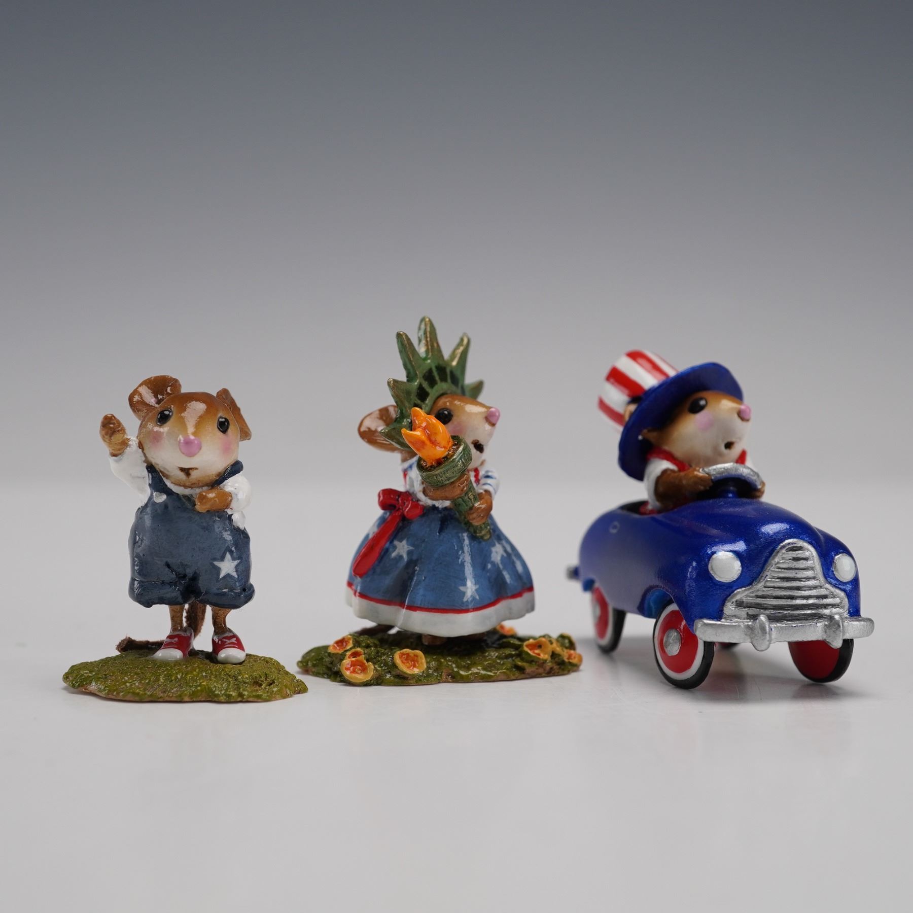 This charming set of five Wee Forest Folk figurines celebrates the spirit of Americana in delightful miniature form. Each meticulously hand-painted piece features a cheerful mouse dressed in patriotic red, white, and blue, bringing a whimsical touch to any collection. The set includes various characters: a mouse waving a flag proudly, another dressed as the Statue of Liberty, one driving a blue vintage car, and two more adorned in classic stars-and-stripes attire; one tipping an Uncle Sam hat beside a rocket and another holding a heart-shaped flag emblem. Each figurine bears the hallmark Wee Forest Folk label on the underside and is hand-signed AP for Annette Petersen or WP for William Petersen, underscoring their authenticity and artistry. Crafted in Concord, Massachusetts, these collectible miniatures exemplify the beloved Petersen family's fine craftsmanship and enduring charm.
