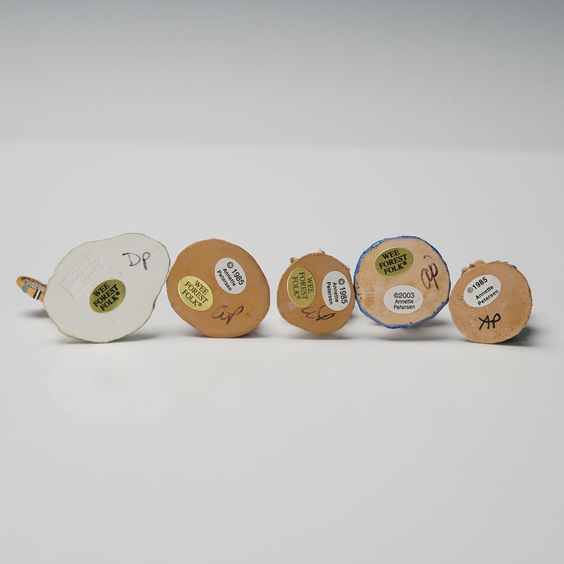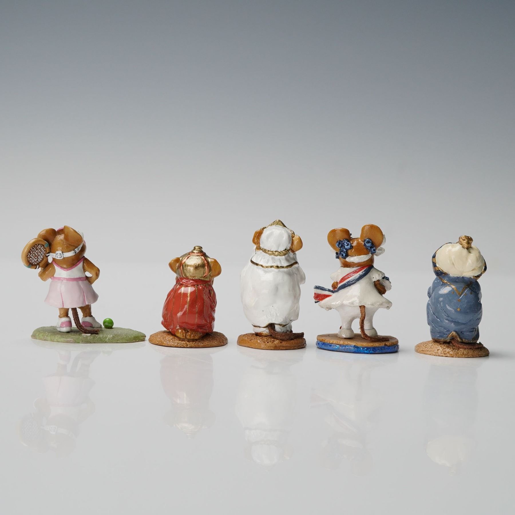 A charming collection of five Wee Forest Folk miniature mouse figurines, each hand-painted and crafted in fine detail by Annette Petersen. This delightful group includes various themed characters such as a tennis player, a royal figure, a bride, and others, each capturing the whimsical charm and artistry for which Wee Forest Folk is known. All pieces bear the maker's mark and date stamps to the base.