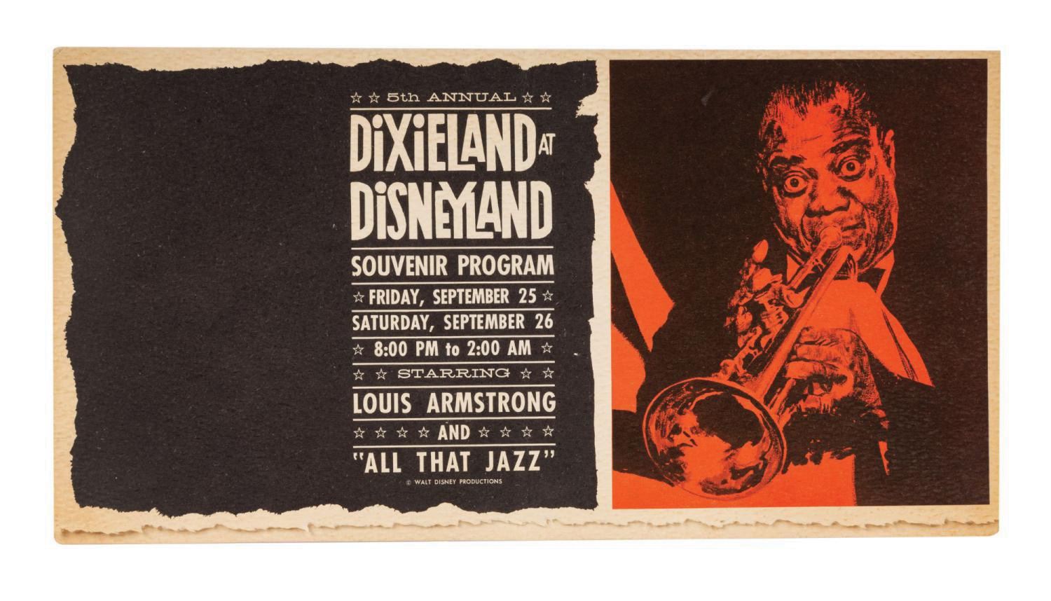 (Disneyland, 1964) A Souvenir Program commemorating the 5th Annual Dixieland at Disneyland event held September 25-26, 1964, at "Disneyland After Dark." The program advertises headliner Louis "Satchmo" Armstrong wailing on his trumpet, and "all that jazz" - the other entertainers that performed "for your listening pleasure throughout the night." Measuring approximately 11"x5.75" when closed, the souvenir of Disneyland is in very good condition despite slight creases, and color toning from age, typical of ephemera of this vintage.
