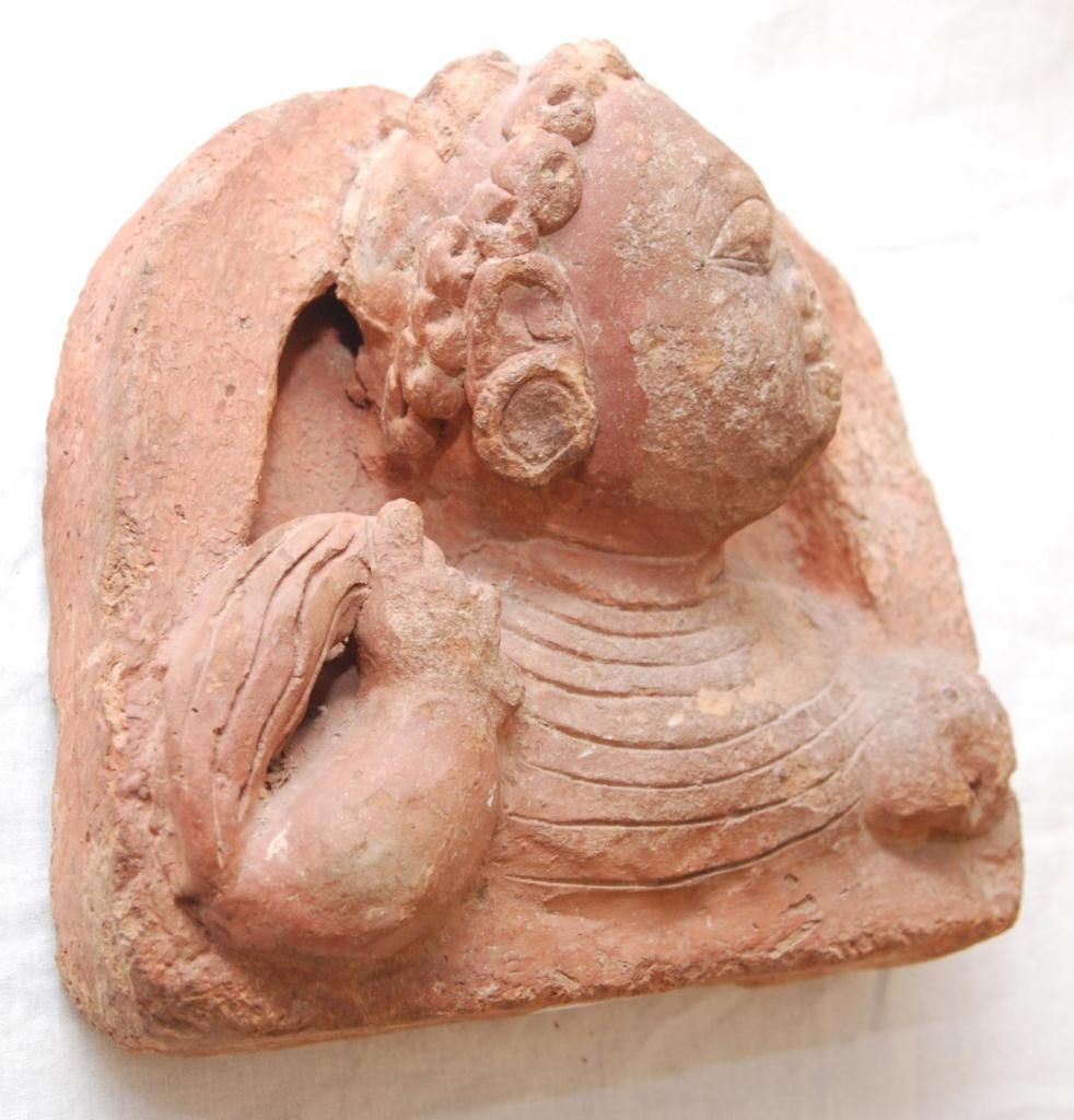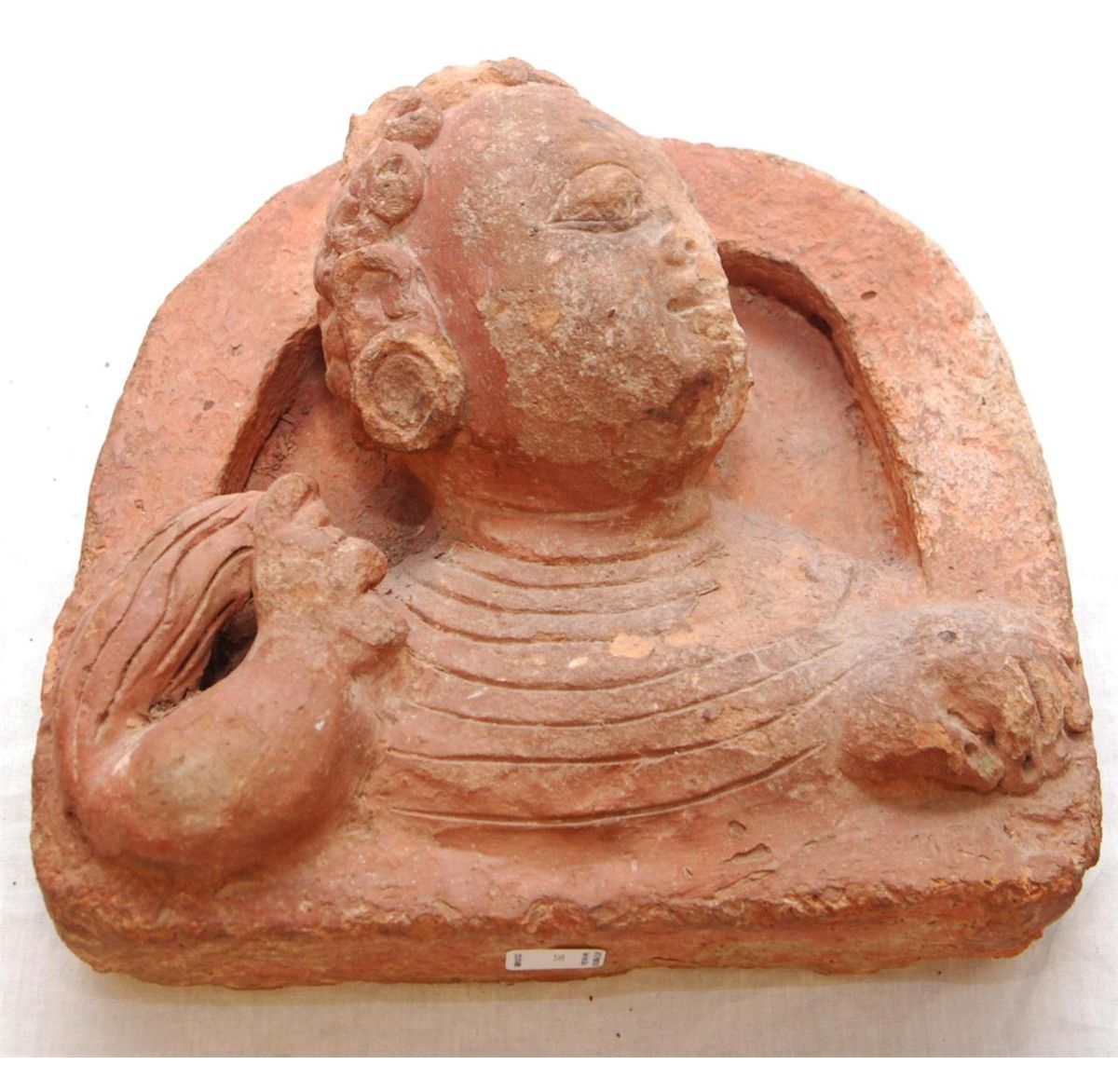 An antique Indian Gupta Dynasty style wall tile depicting a man in window. Circa 5th century AD. Measures 8 3/4" height x 9 1/2" width x 4 1/4" depth (22.2cm x 24.1cm x 10.7cm). Total weight of 3.82 kilograms.