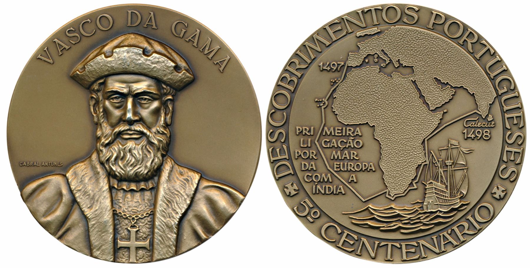 5th Centennial of Portuguese Discovery of India, Large Bronze / Brass Medal, obv. bust of Vasco Da Gama, rev. illustrates the route taken by Vasco Da Gama departing from Portugal in 1497, going around the African continent and reaching Calicut in 1498. Very high relief, Modern, Superb Mint State, Rare.