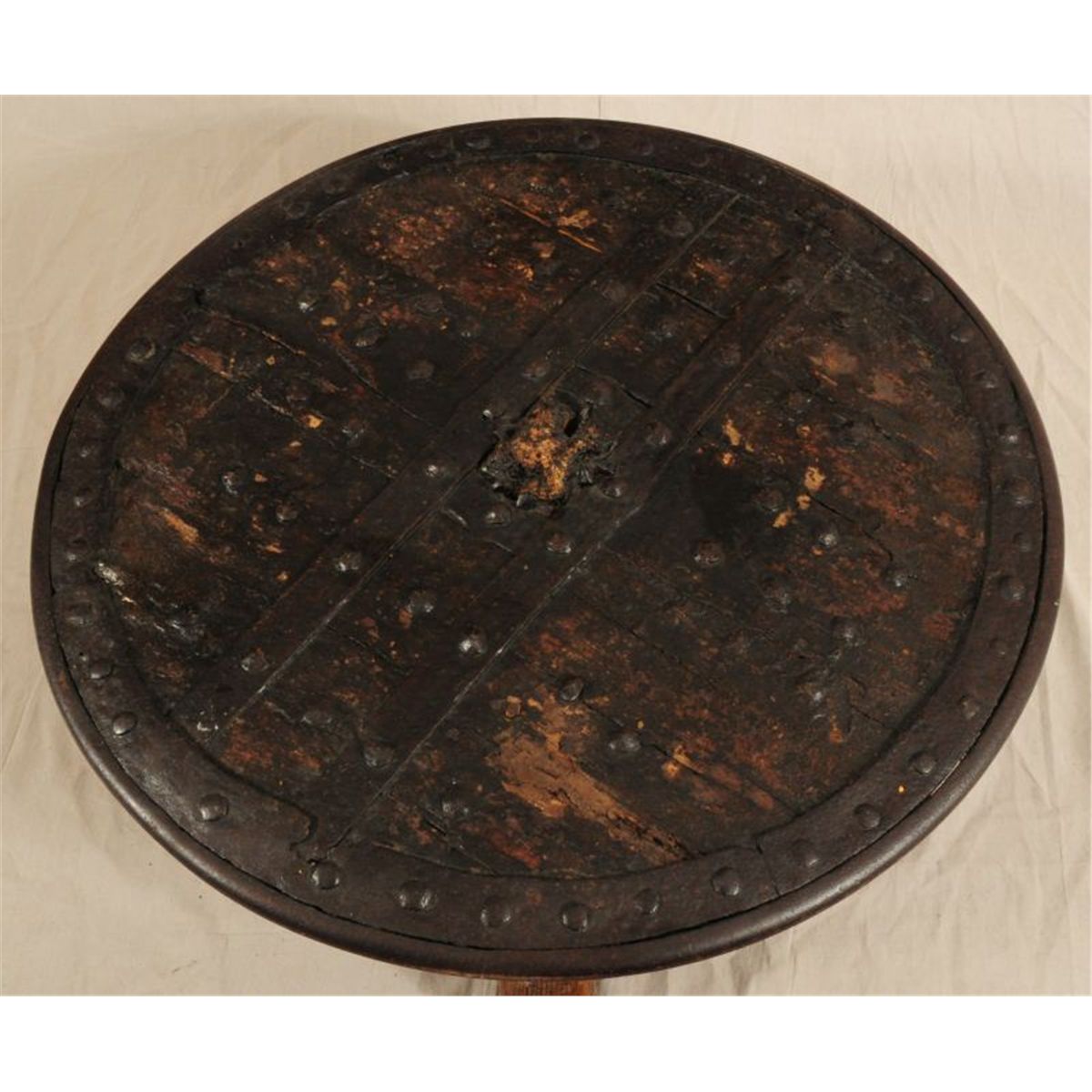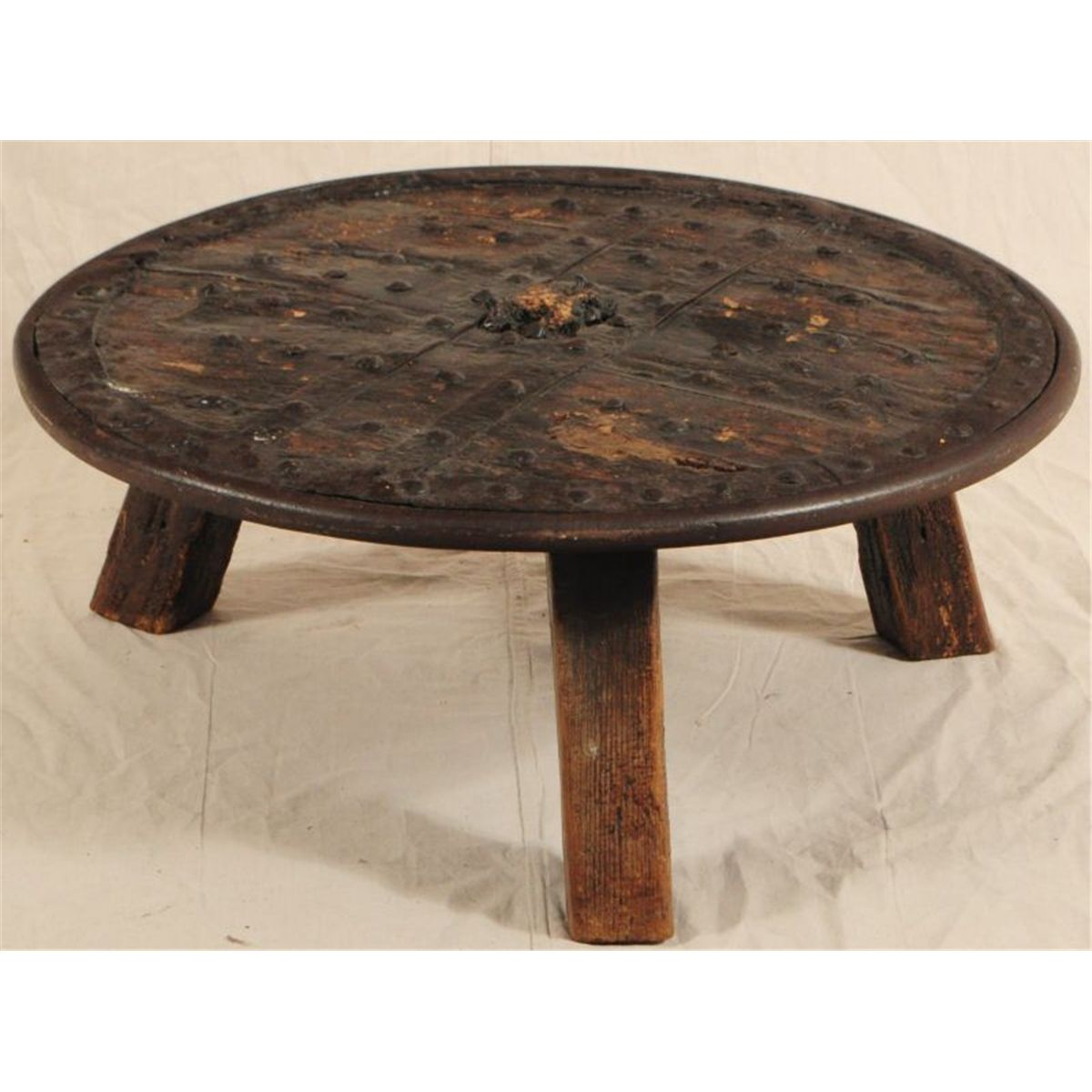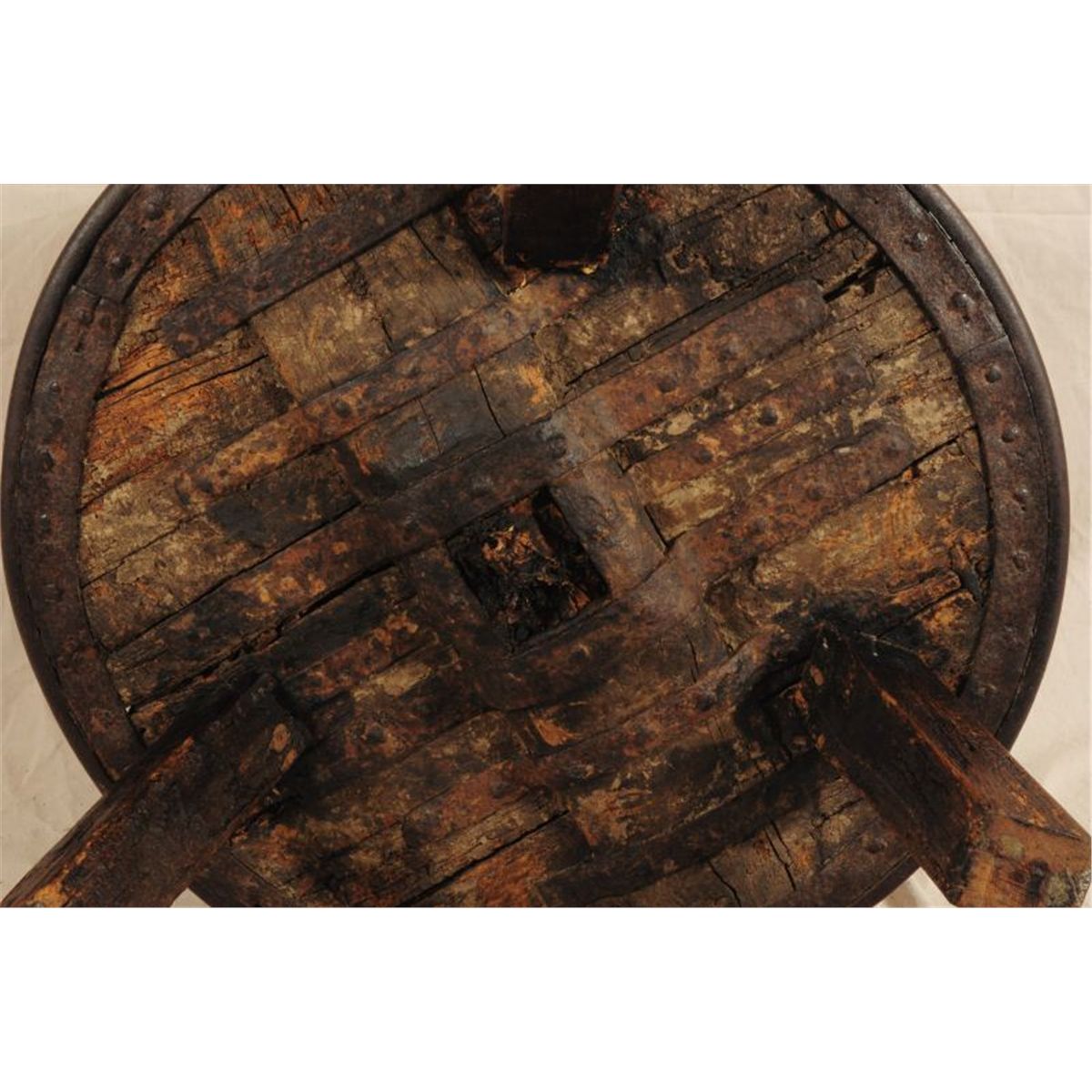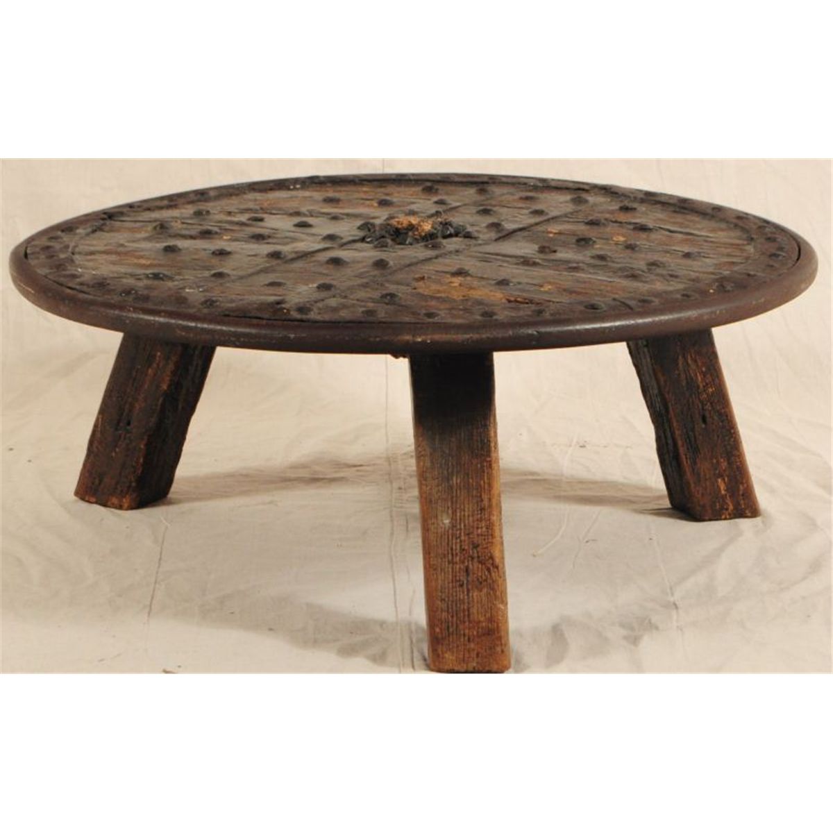 Early hand forged wheel attributed as Roman. Was acquired in England by Louis Marshall in the 1980s. The wheel that has been converted into a table. Measures 15" Tall and 40" Across Not sure of exact age. Somewhere between 5th & 15th century.