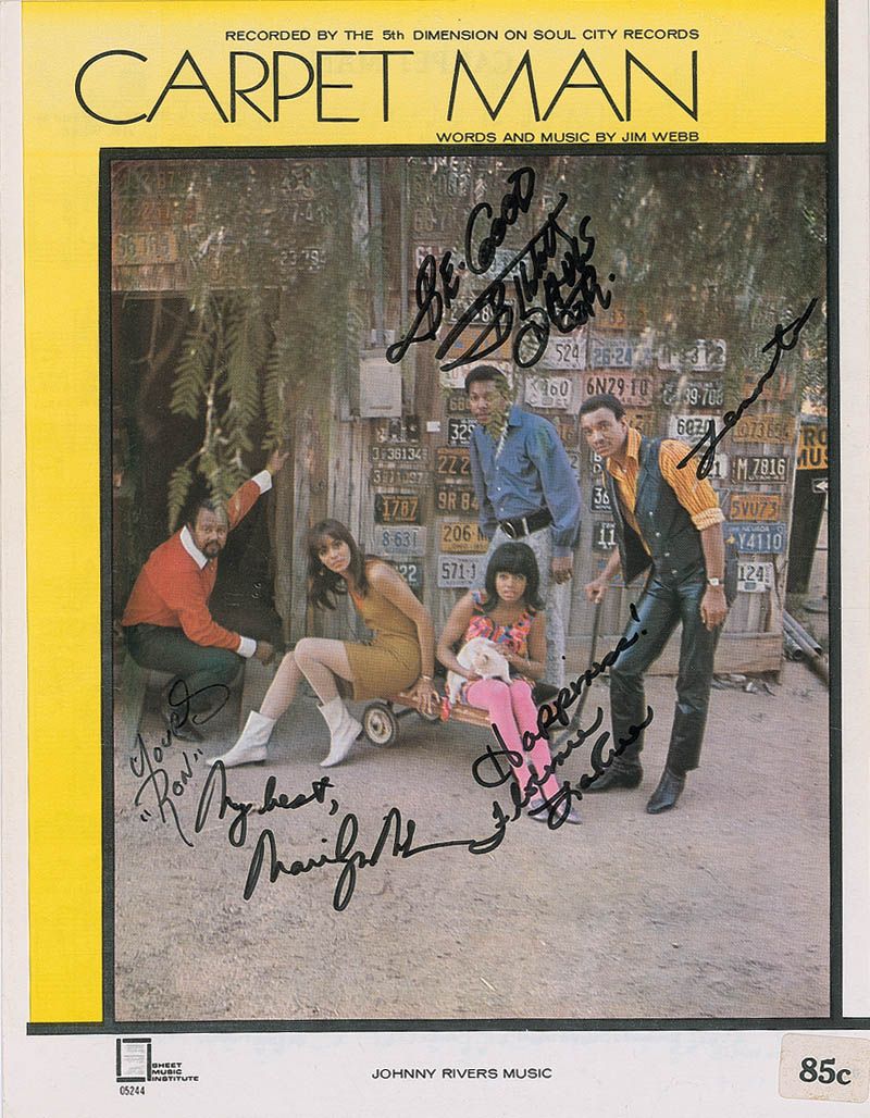 Original 1967 issue sheet music to ‘Carpet-Man,’ 8.5 x 11, two pages, signed on the front cover in black felt tip by Marilyn McCoo, Billy Davis, Jr., Florence LaRue, Lamonte McLemore, and Ron Townson. In fine condition, with the original price label affixed to the lower right.